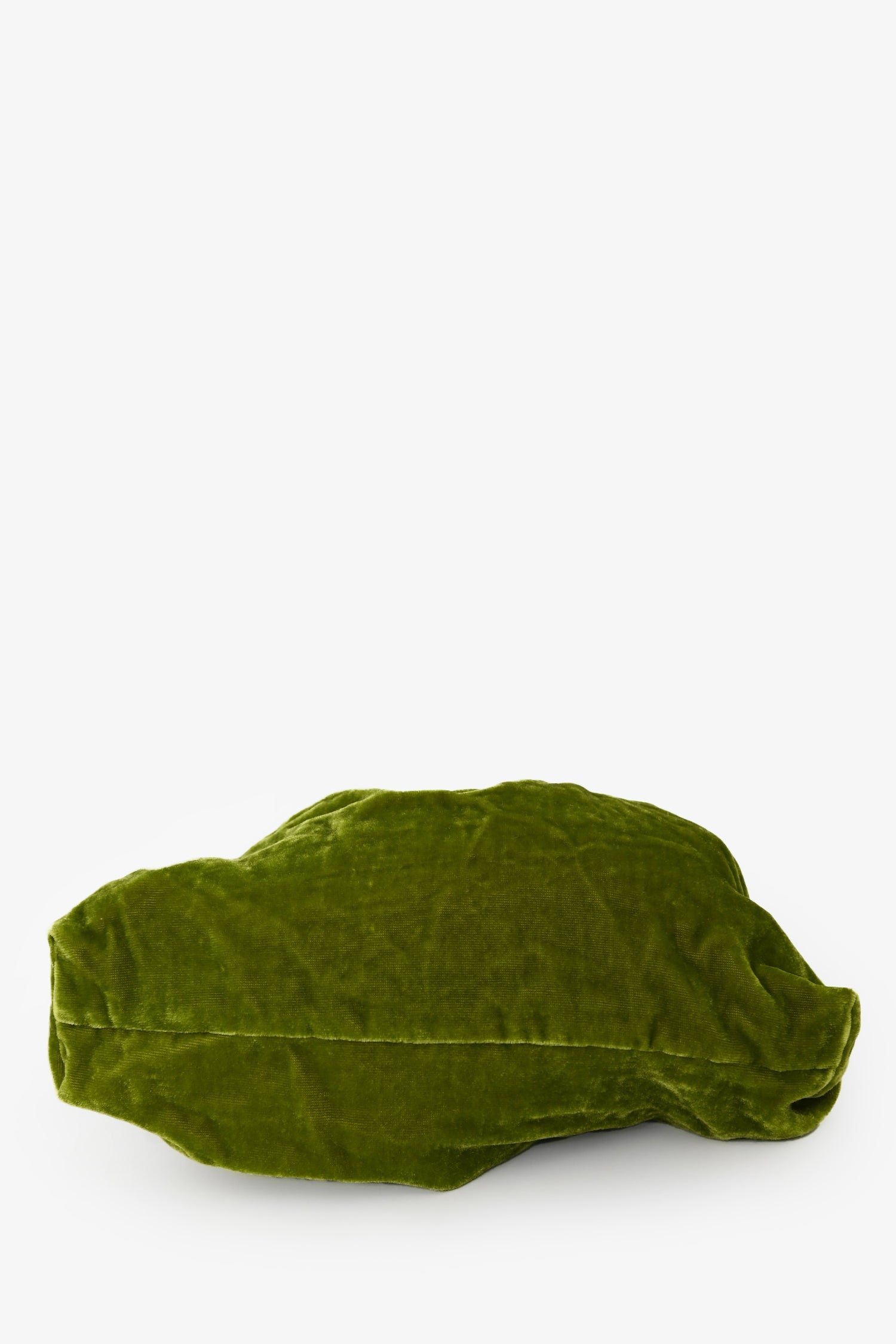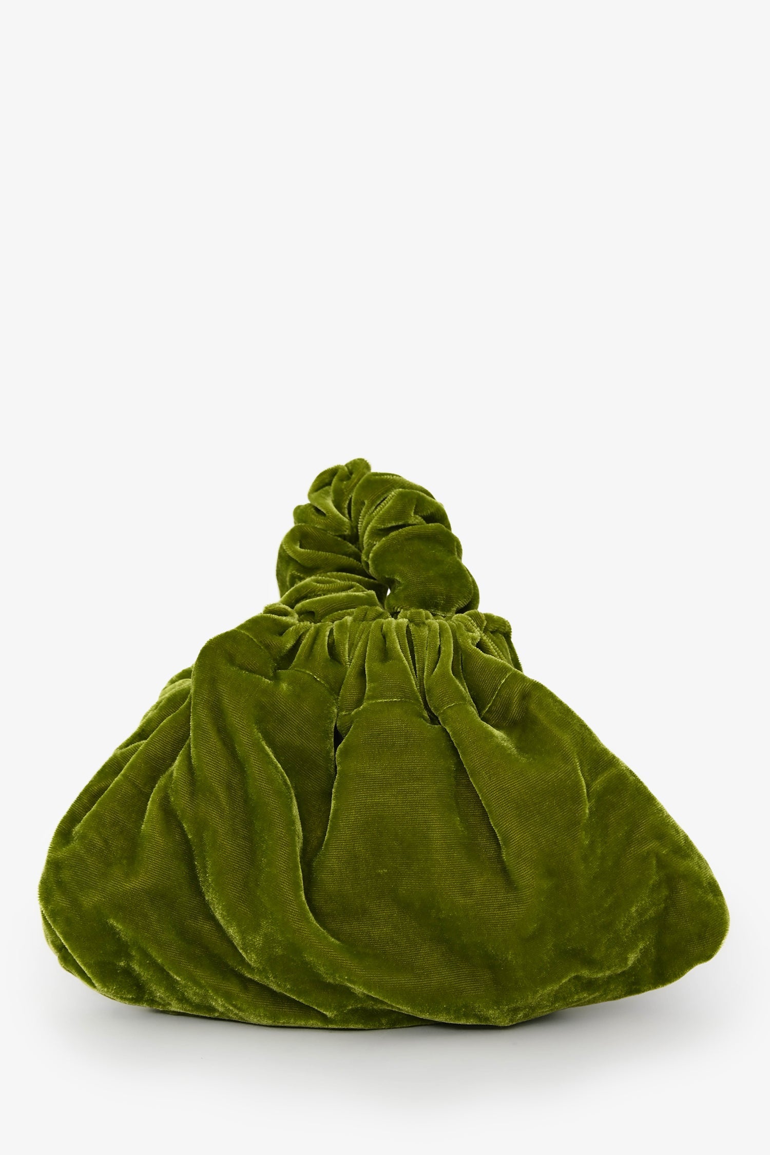 A Bronze Age Green Velvet Scrunch Top Handle. Open top. Open interior. Tonal stitching.