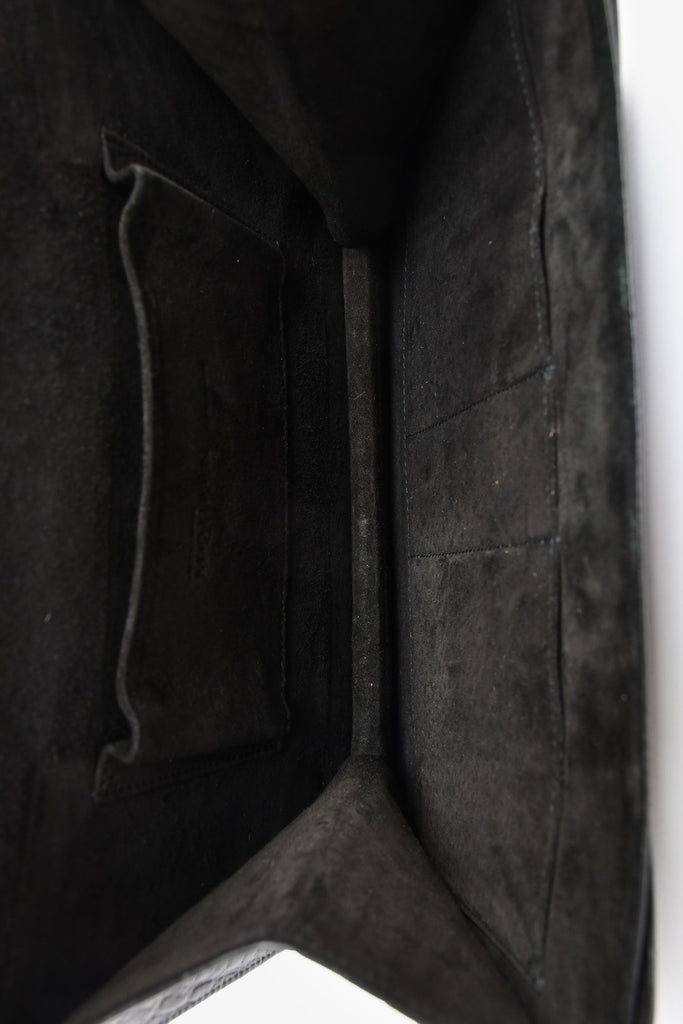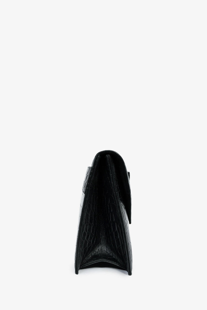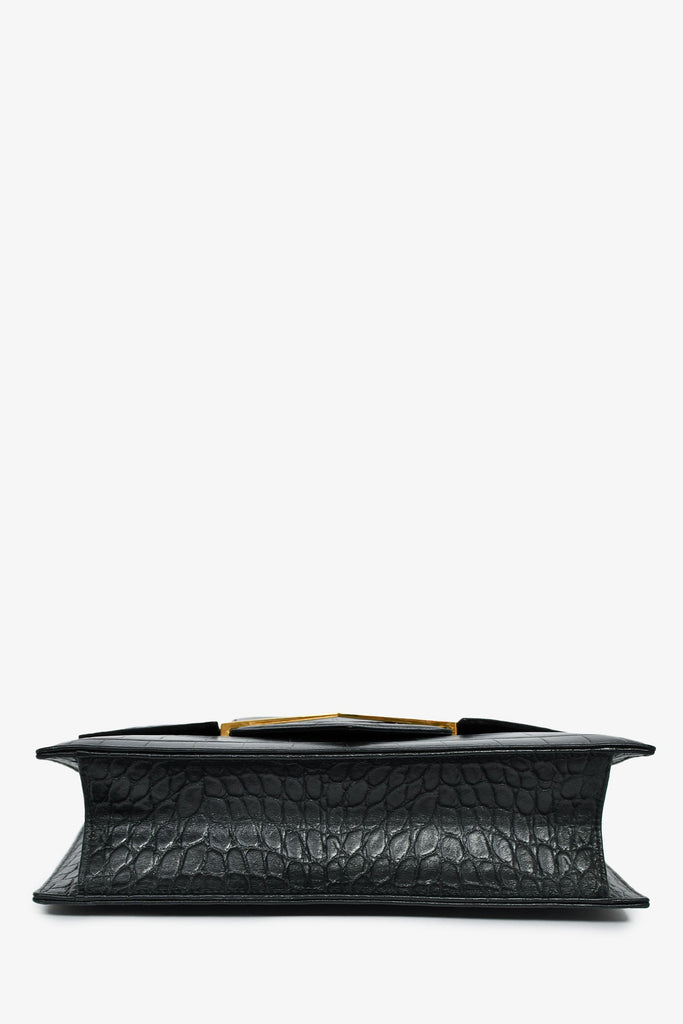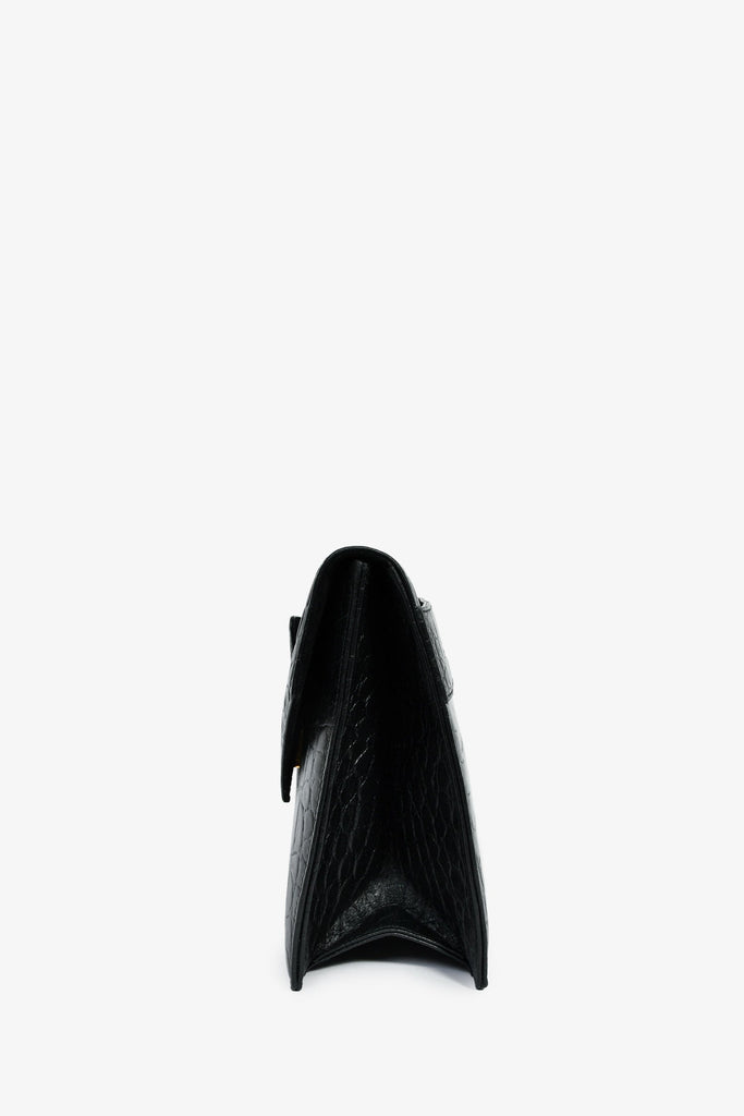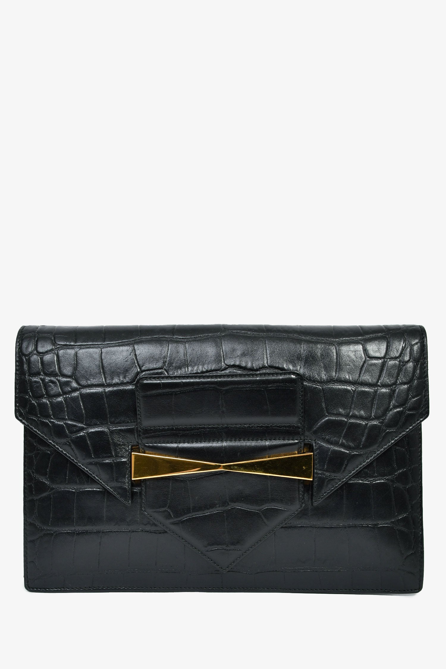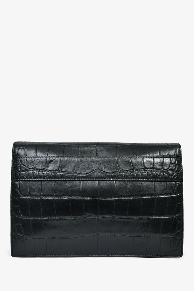 Alexander McQueen Black Croc Effect Leather Envelope Clutch. Fold-over flap with a slip closure. Single rear exterior slip pocket. 2 interior compartments with 3 slip pockets. Gold-tone hardware. Tonal stitching.