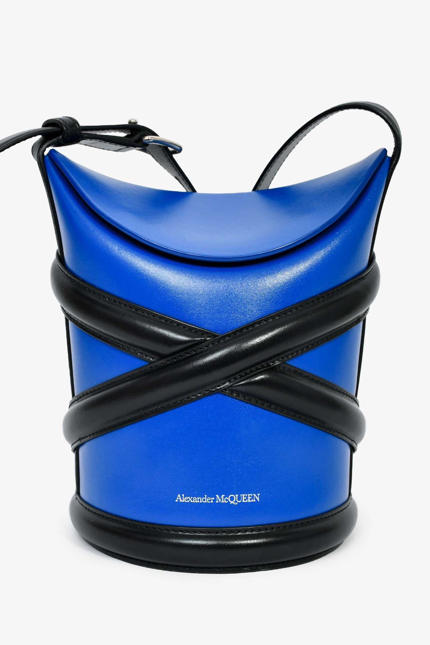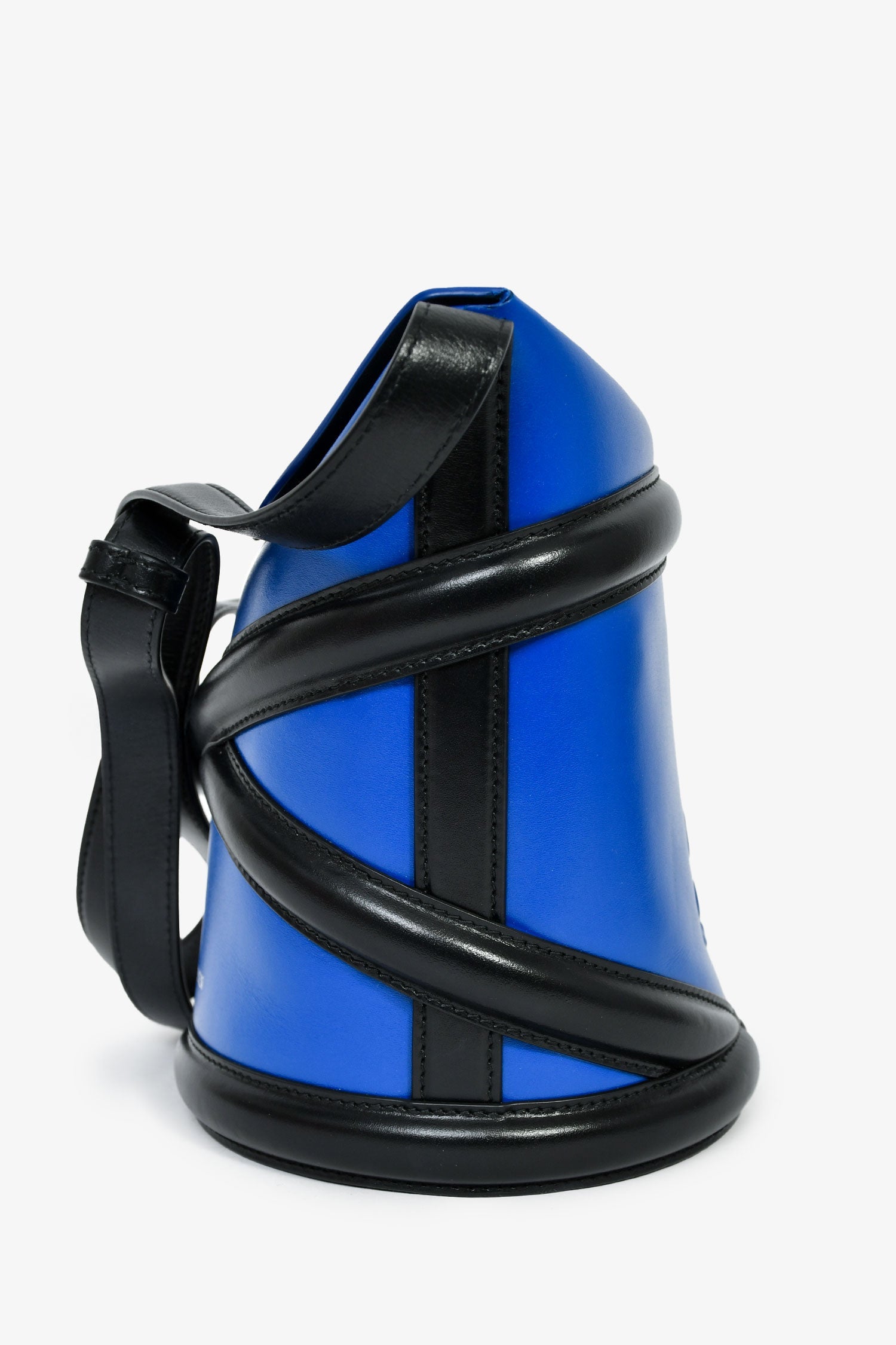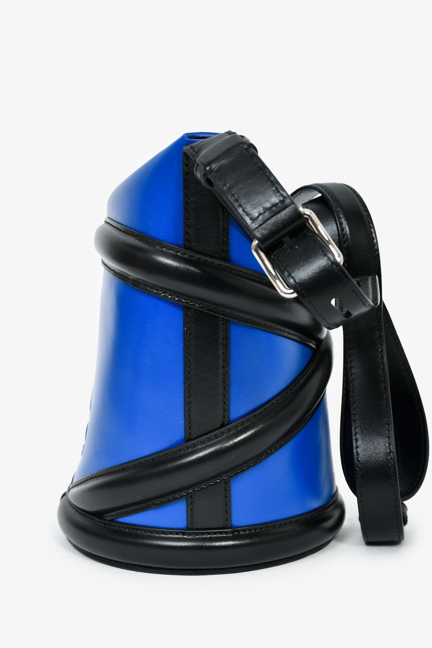 Alexander McQueen Blue/Black Leather Small 'Curve' Crossbody Bag. Front flap with a magnetic closure. Adjustable crossbody. Leather lined interior with a card slot. Silver-tone hardware. Tonal stitching.