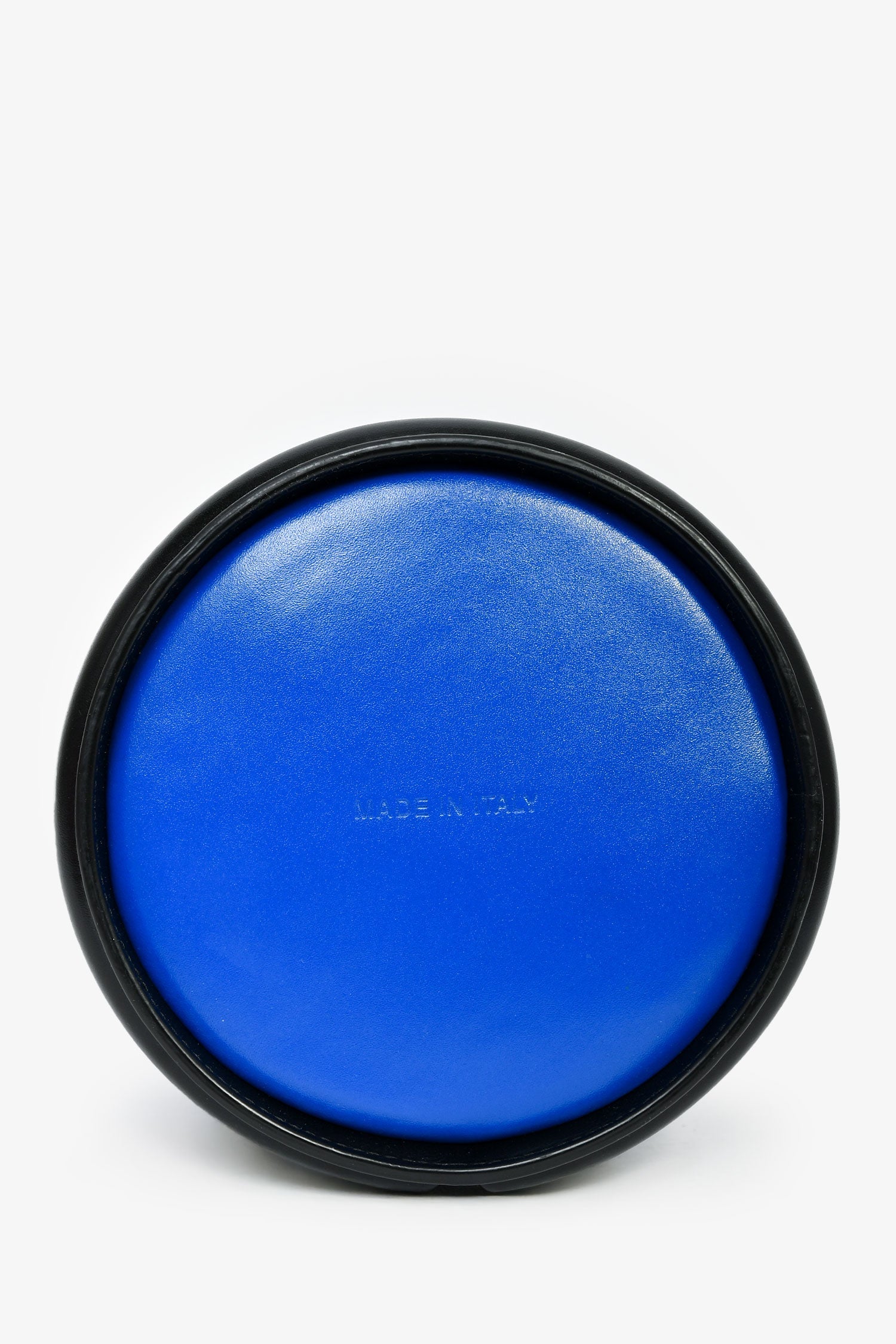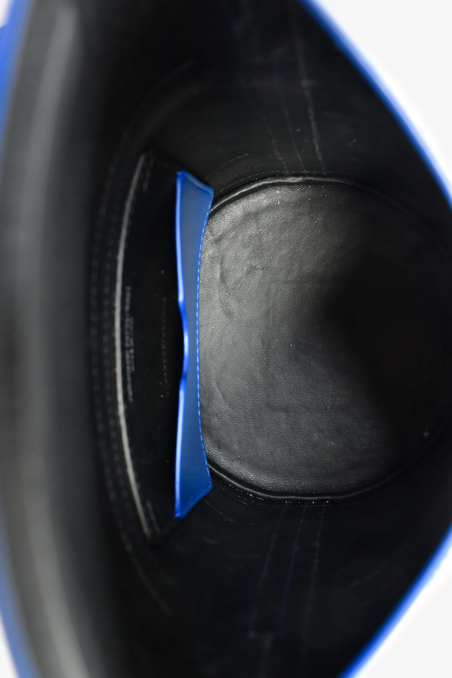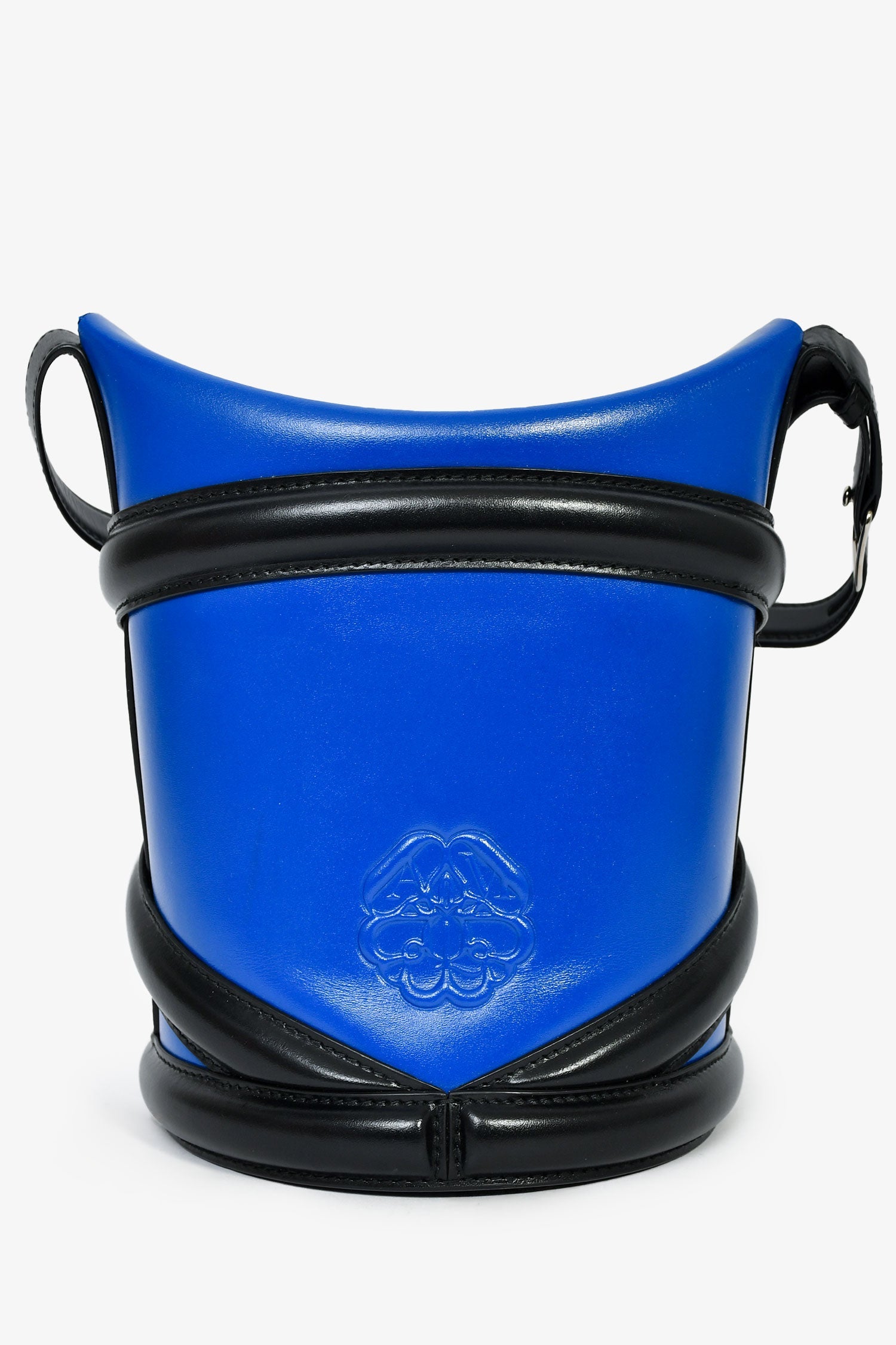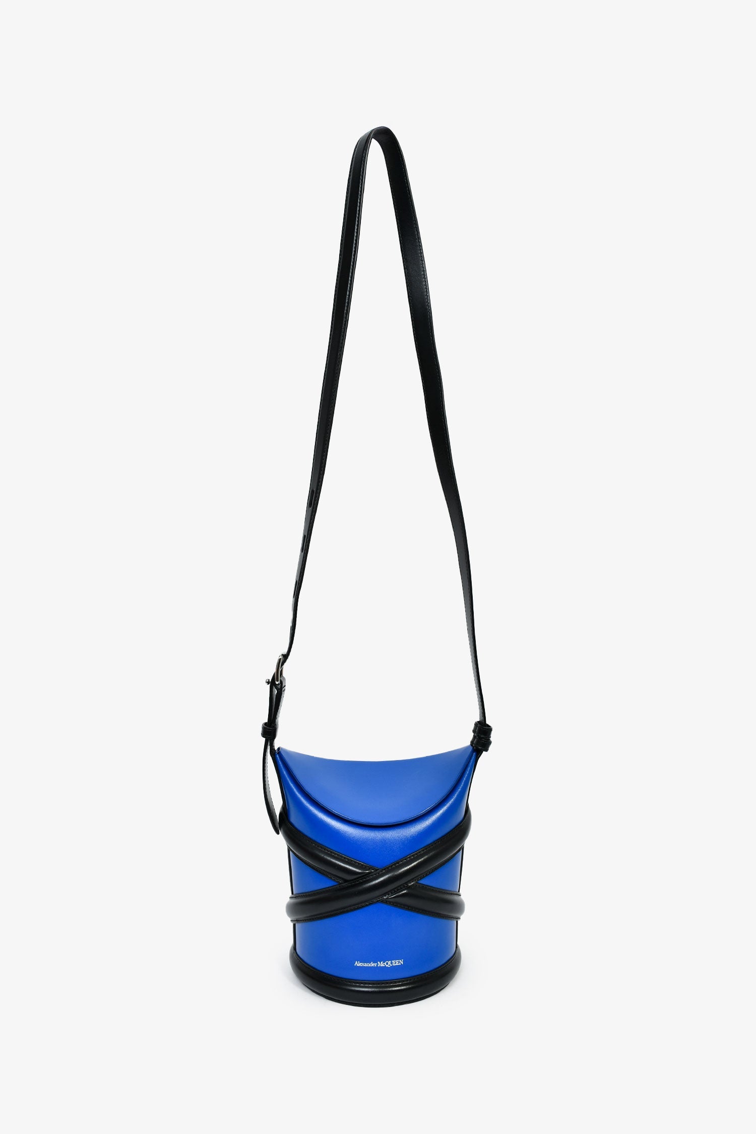 Alexander McQueen Blue/Black Leather Small 'Curve' Crossbody Bag. Front flap with a magnetic closure. Adjustable crossbody. Leather lined interior with a card slot. Silver-tone hardware. Tonal stitching.