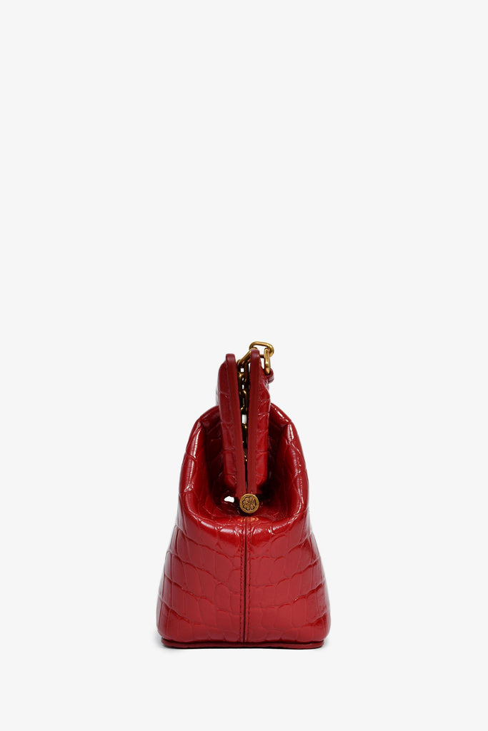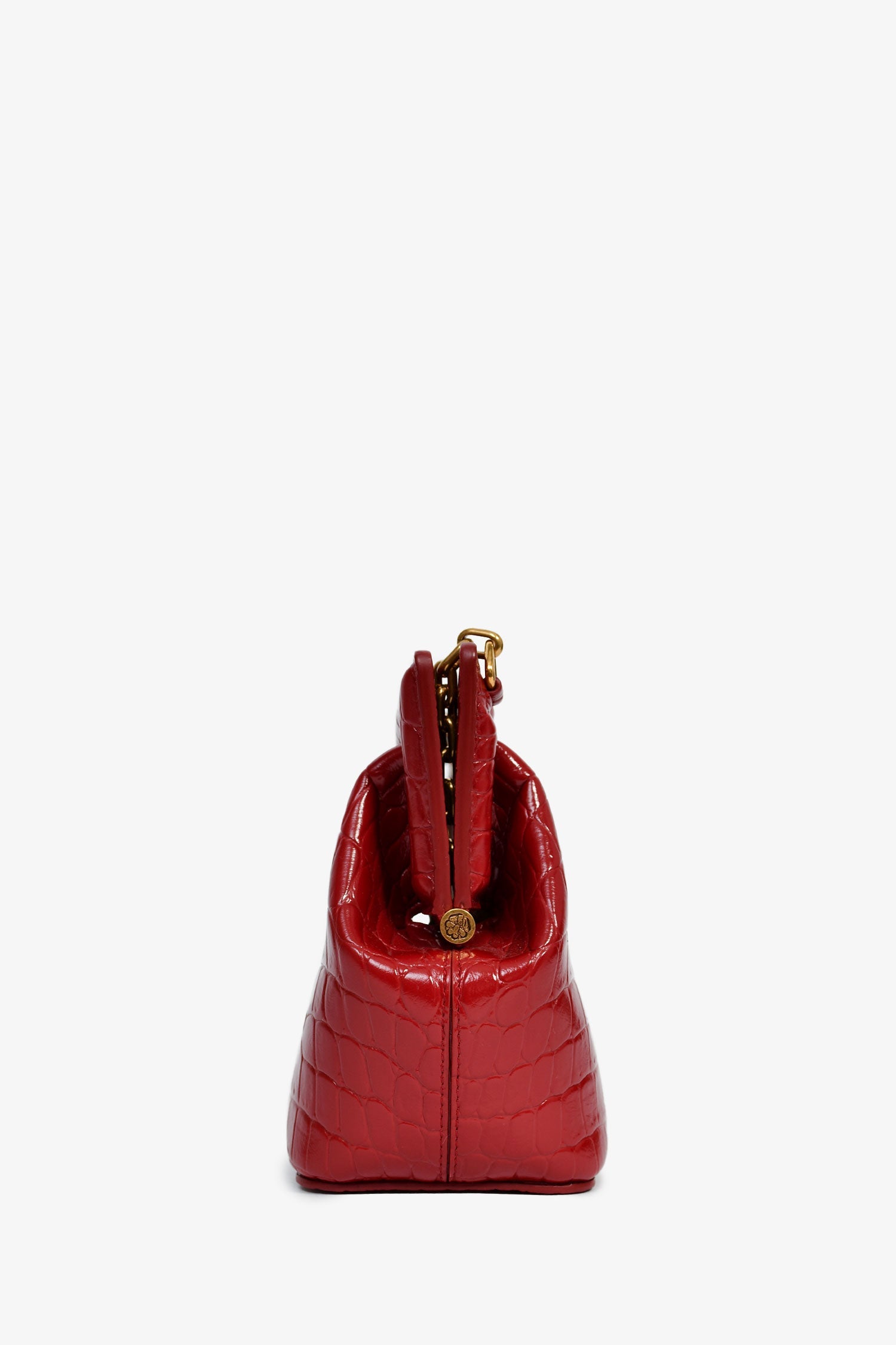 Alexander McQueen Red Croc Effect Leather Chain Crossbody. Gold-tone hardware. Magnetic snap closure. Chain-link crossbody strap. Suede-lined interior. Hand slots. Tonal stitching.