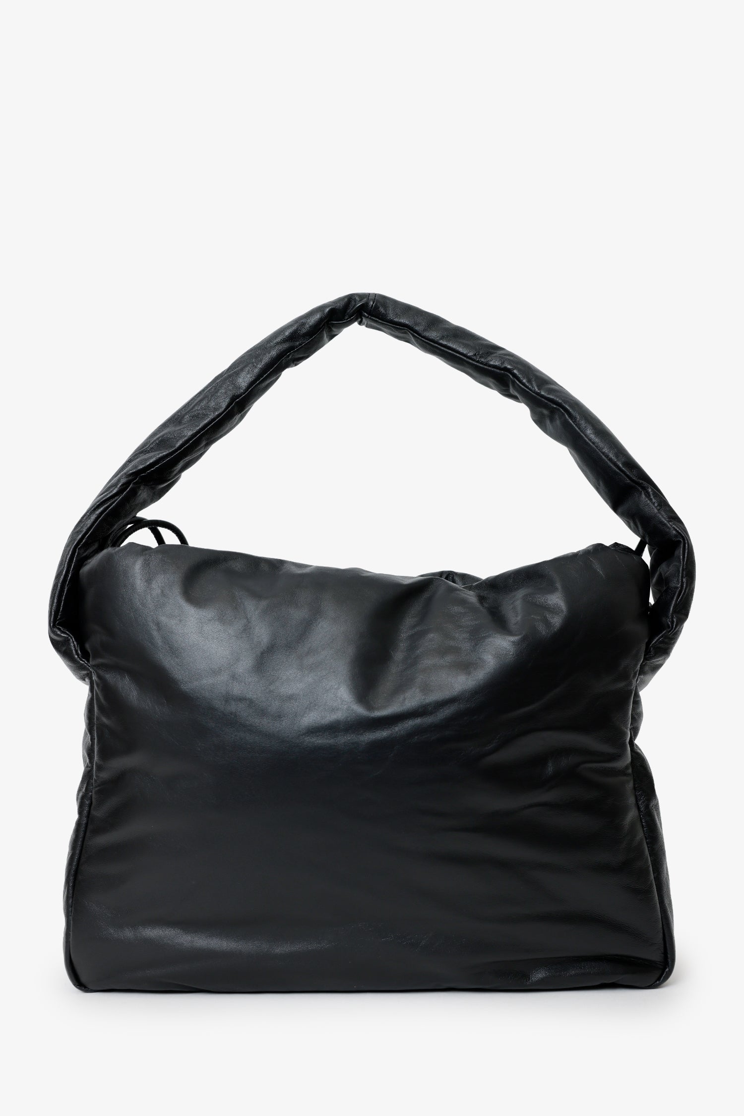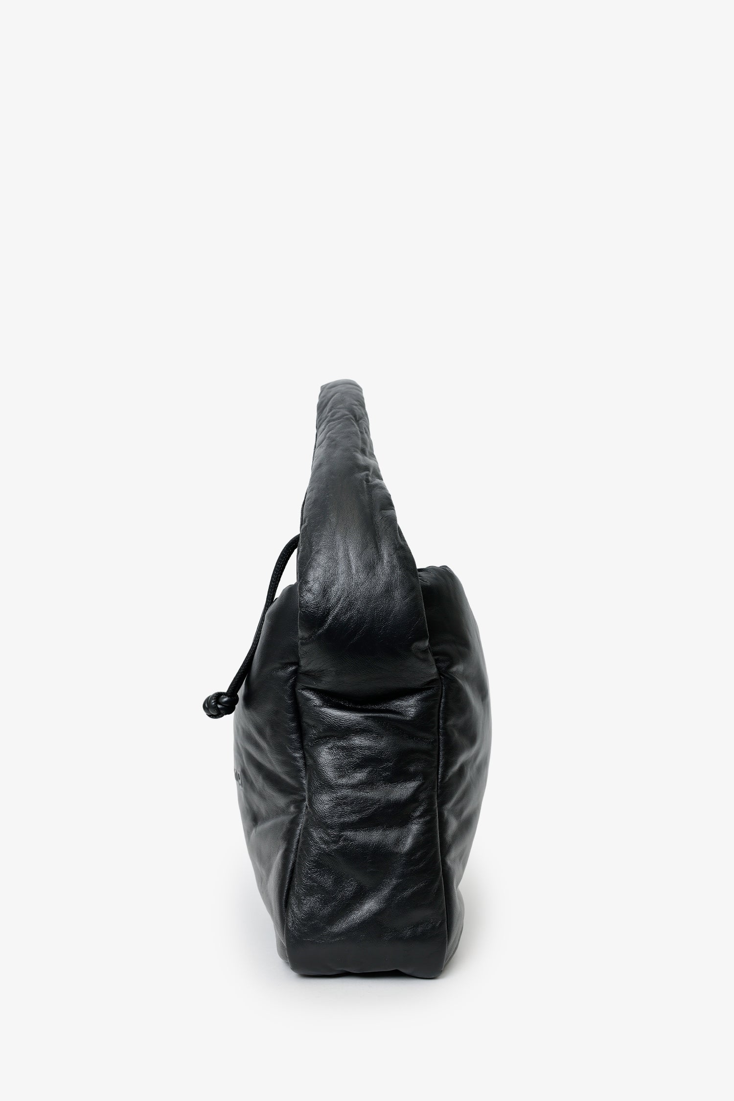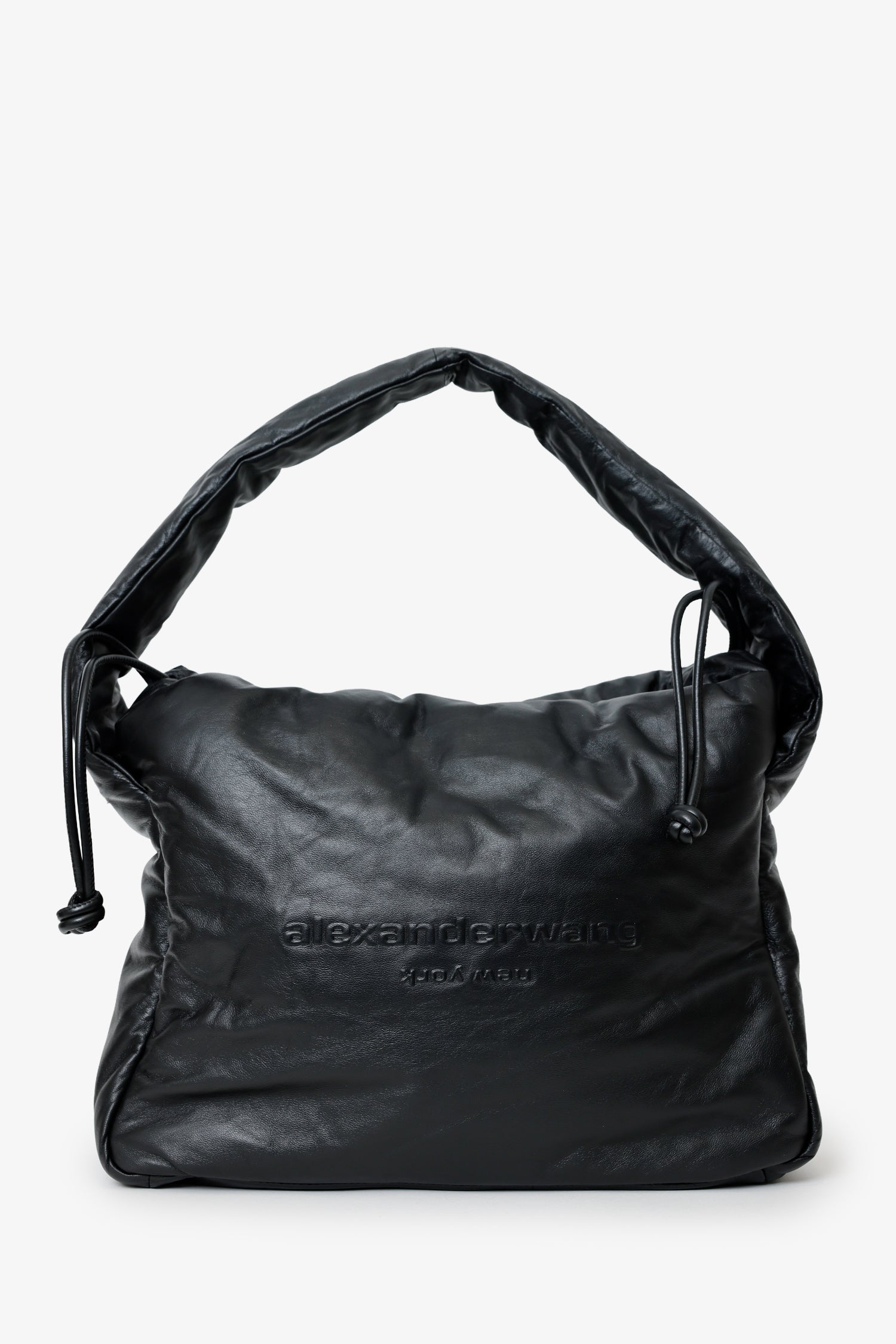 Alexander Wang Black Leather Ryan Puff Shoulder Bag. Top open with side cinching drawstring closures. Top shoulder strap. Lined interior. Single interior slip pocket. Tonal stitching.