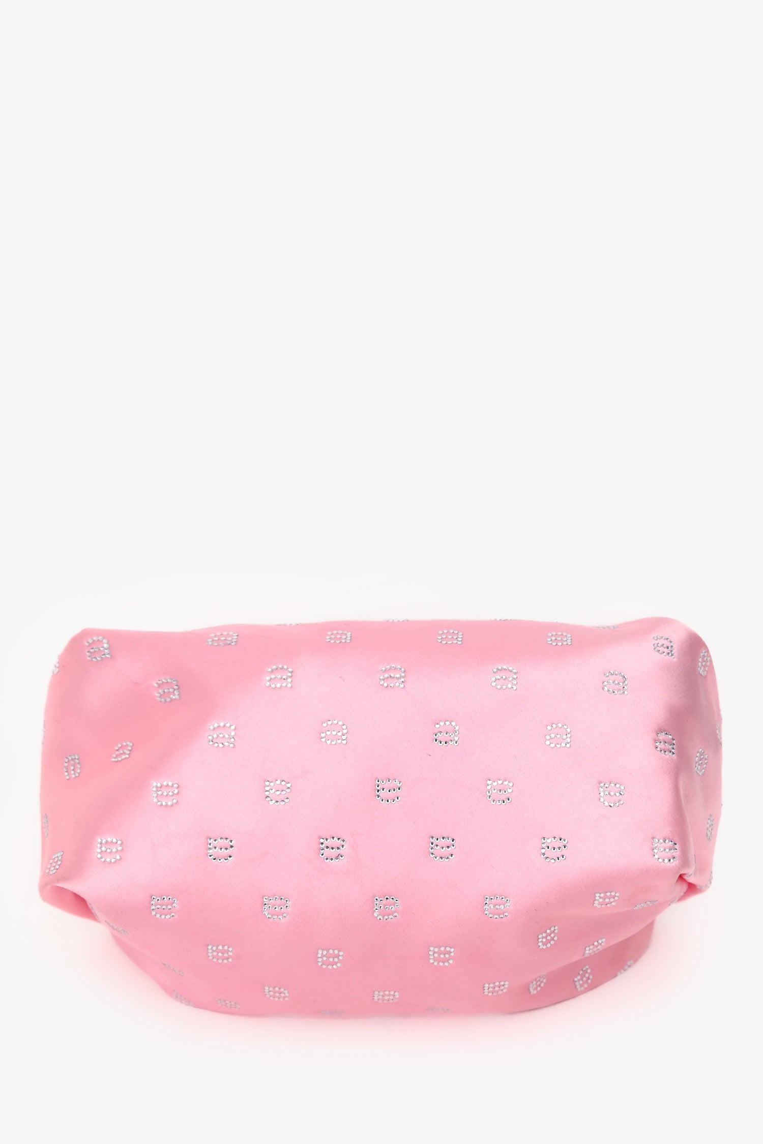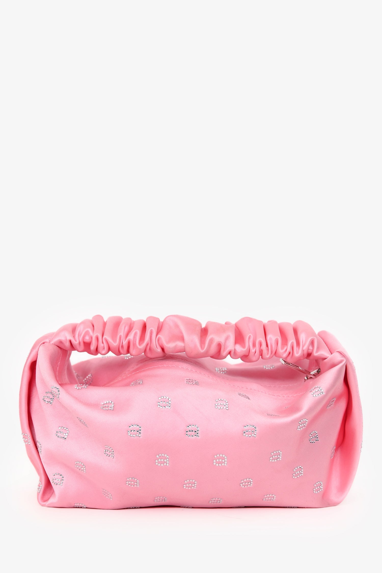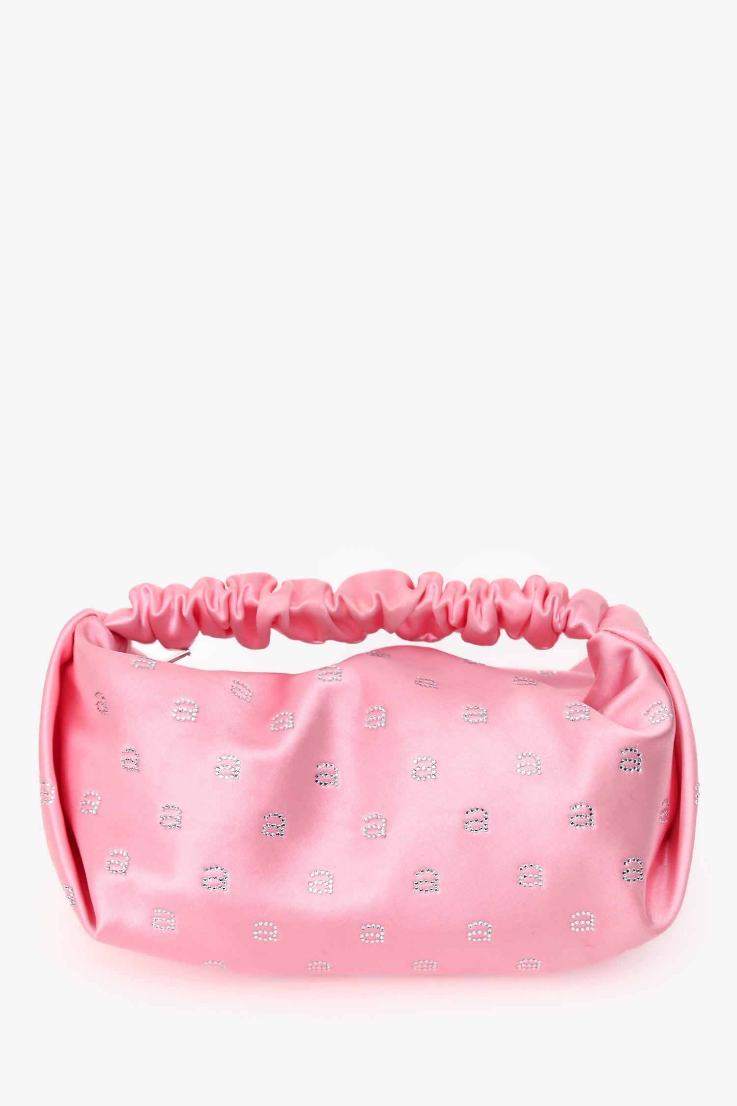 Alexander Wang Pink Satin Monogram 'Mini Scrunchie' Top Handle. Top zip closure. Textile-lined interior. Open interior. Silver-tone hardware. Tonal stitching.