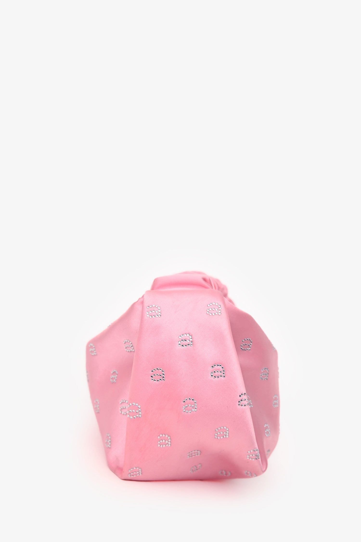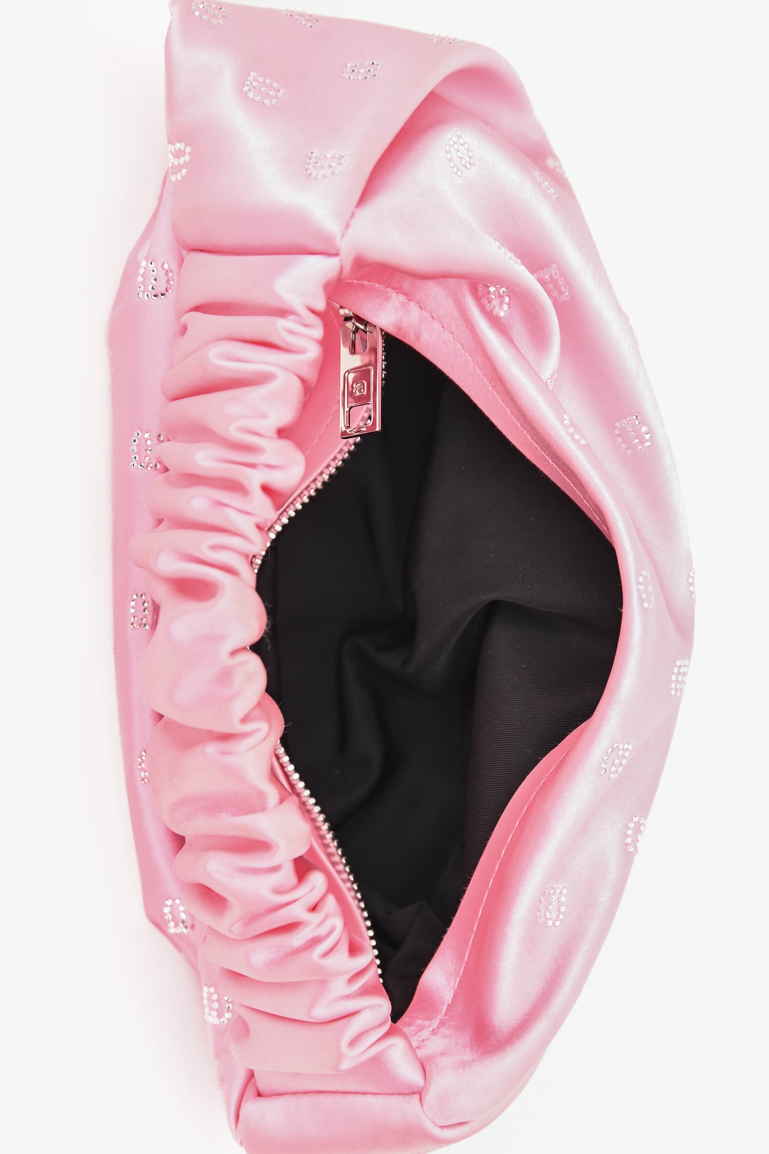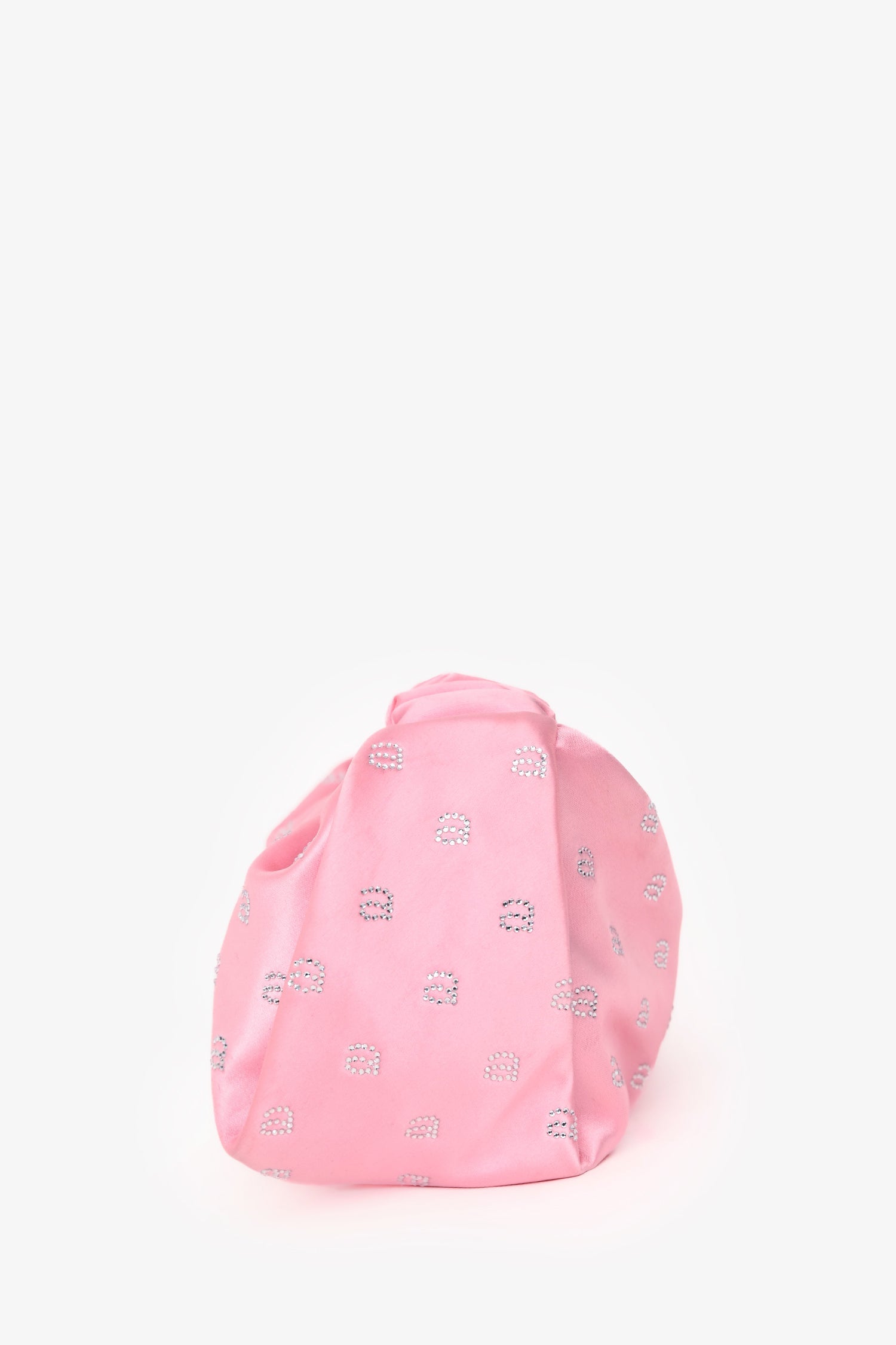 Alexander Wang Pink Satin Monogram 'Mini Scrunchie' Top Handle. Top zip closure. Textile-lined interior. Open interior. Silver-tone hardware. Tonal stitching.