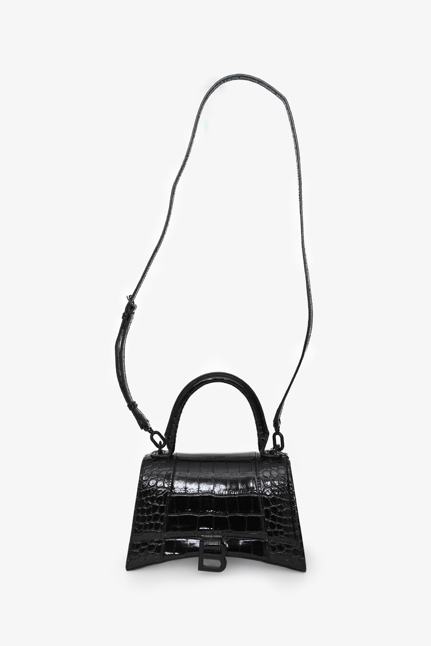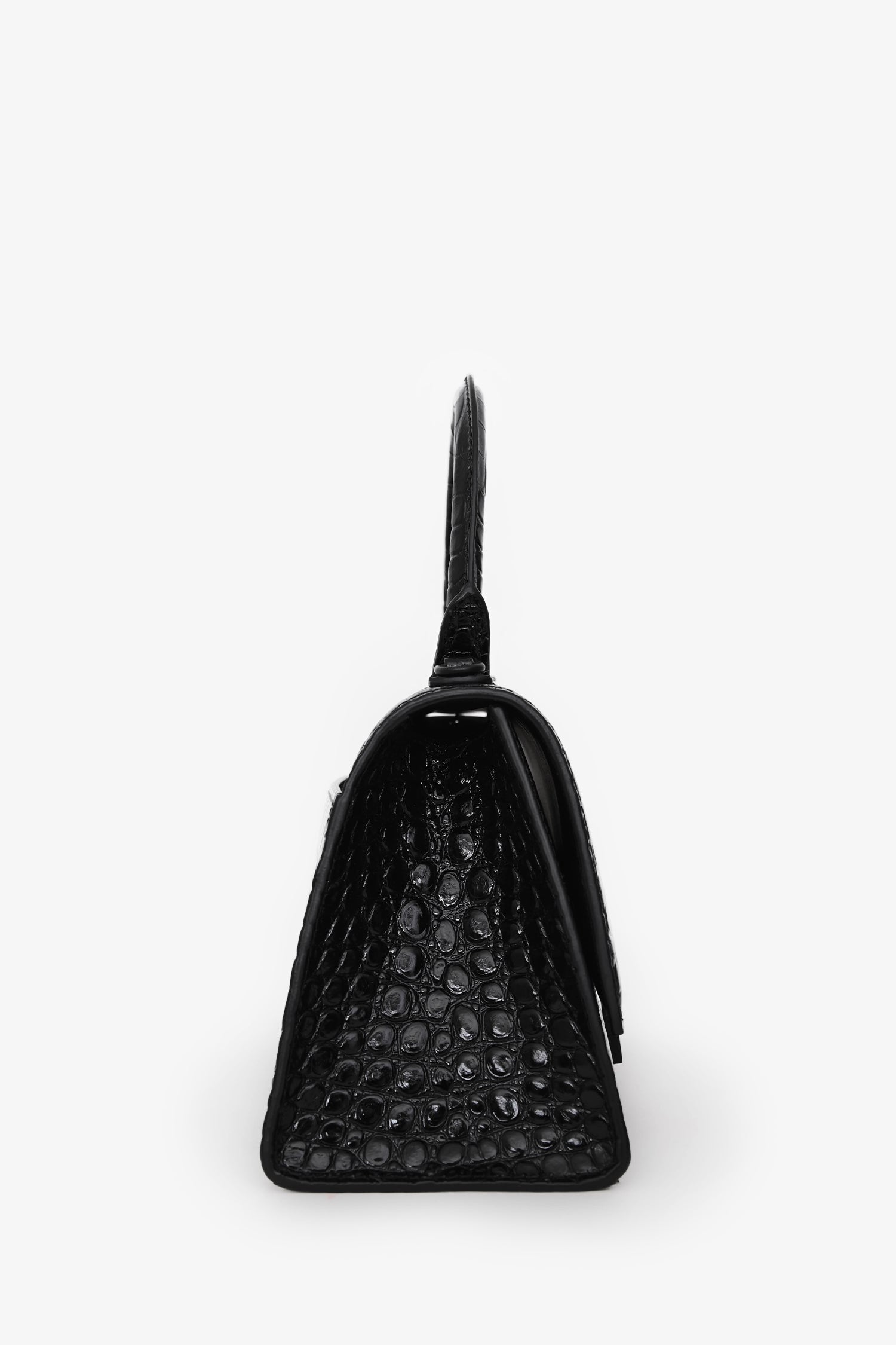 Balenciaga Black Croc Embossed Small Hourglass Top Handle Bag with Strap. Top fold-over flap with snap button closure. Single top handle. Detachable shoulder strap with lobster clasp. 1 interior compartment. 1 wall pocket with zip closure. Leather-lined interior. Tonal hardware. Tonal stitching.