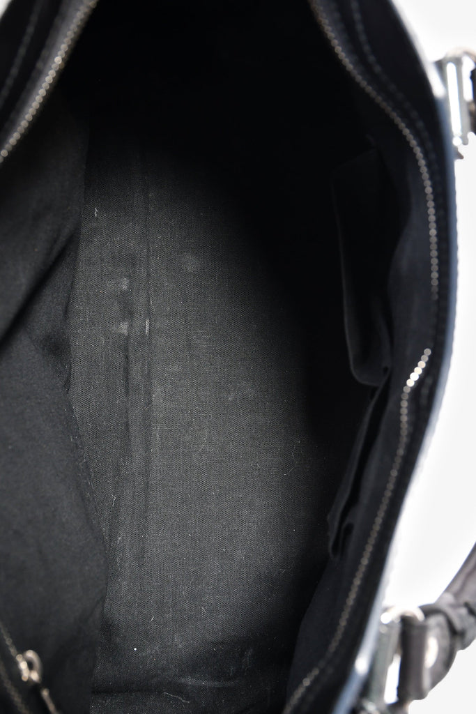 Balenciaga Black Leather '12 Nickel City' Bag with Strap. Top zip closure. Dual braided handles. Front exterior zip pocket. Tonal textile interior lining. Three interior wall pockets; two slip and one with zip closure. Detachable and adjustable shoulder strap. Detachable mini mirror. Silver-tone hardware.