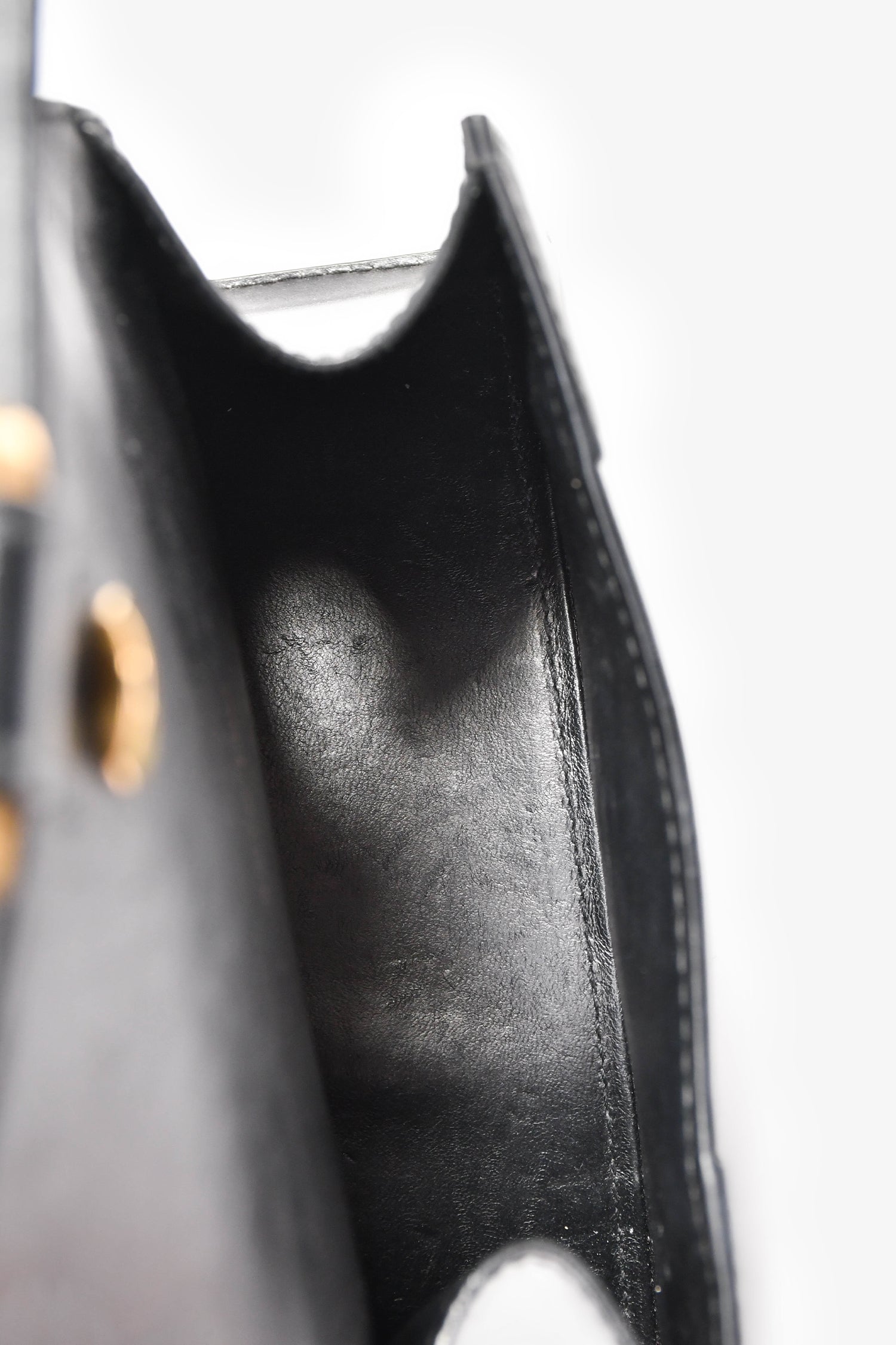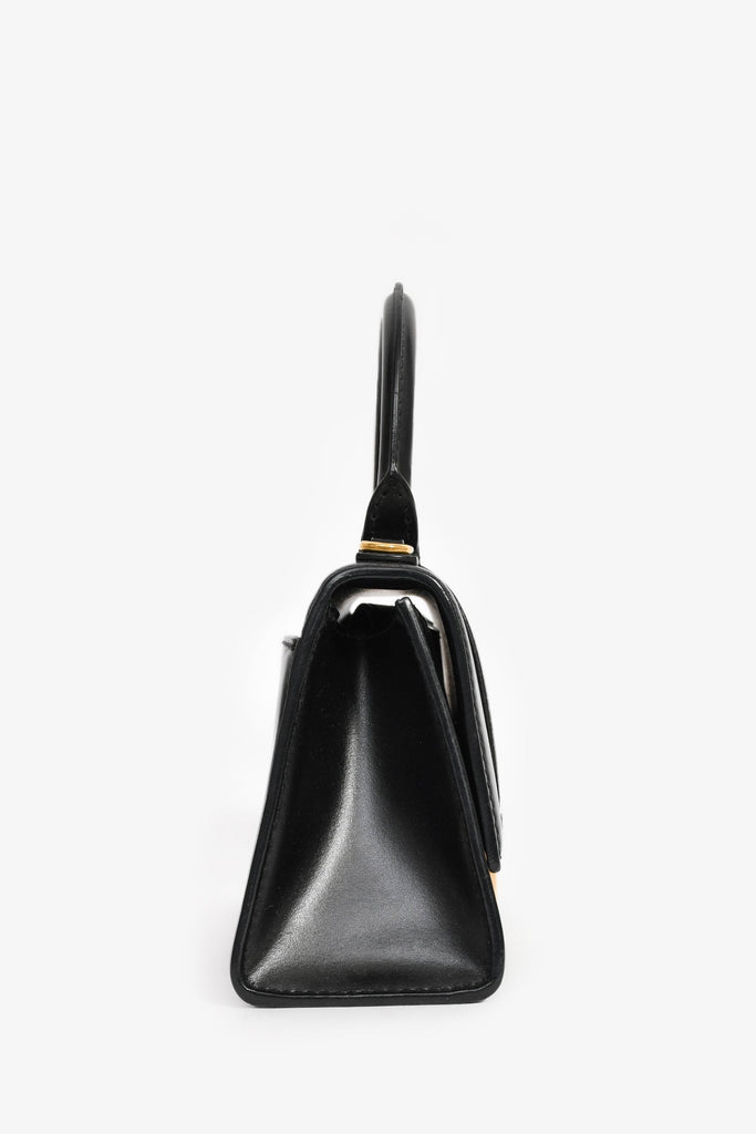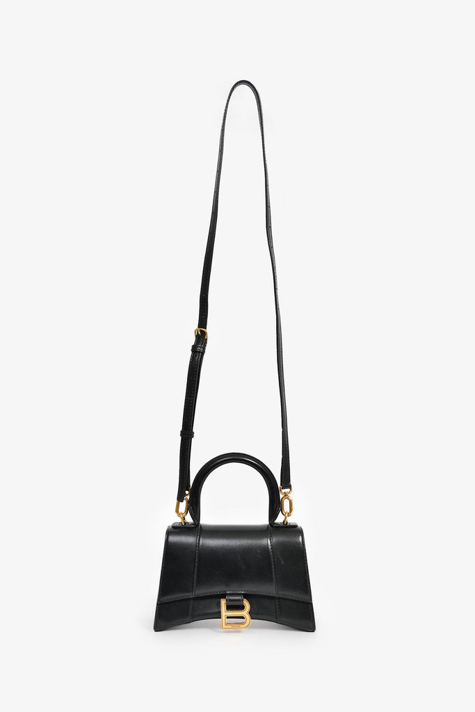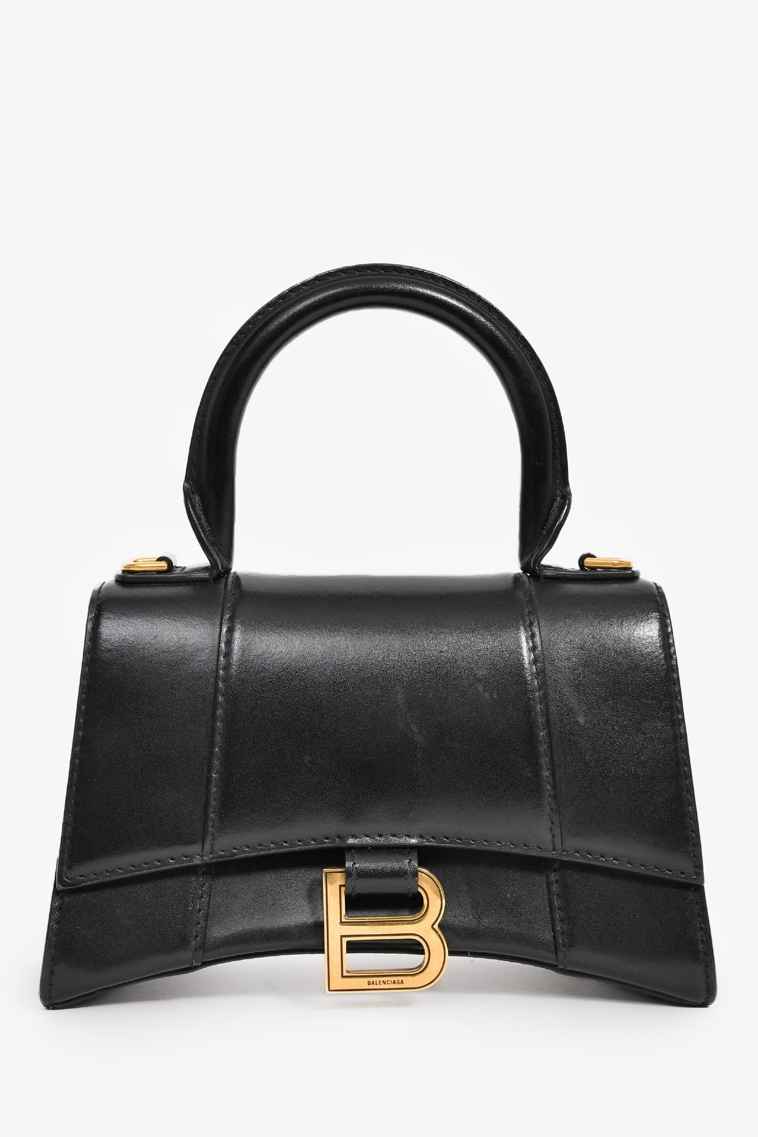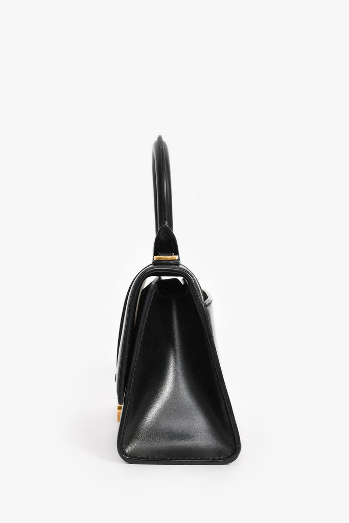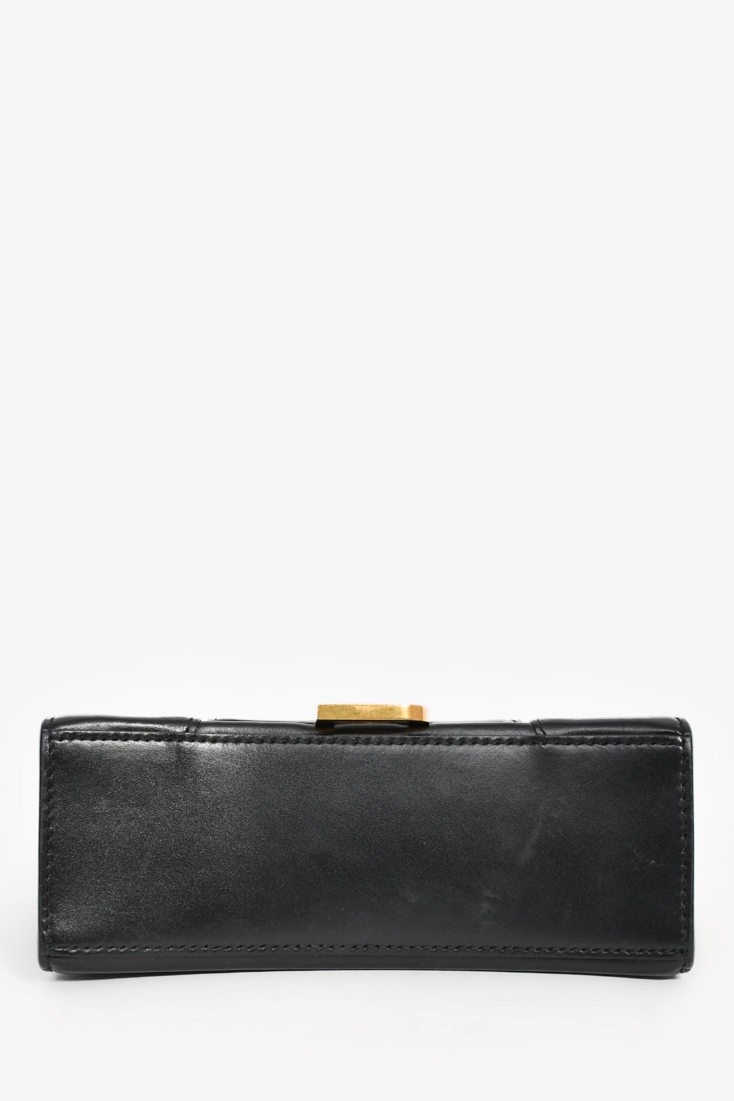 Balenciaga Black Leather Small Hourglass Bag with Strap. Top handle. Front fold-over flap with magnetic closure. Single interior compartment. Rear exterior slip pocket. Detachable strap. Leather-lined interior. Gold-tone hardware. Tonal stitching.