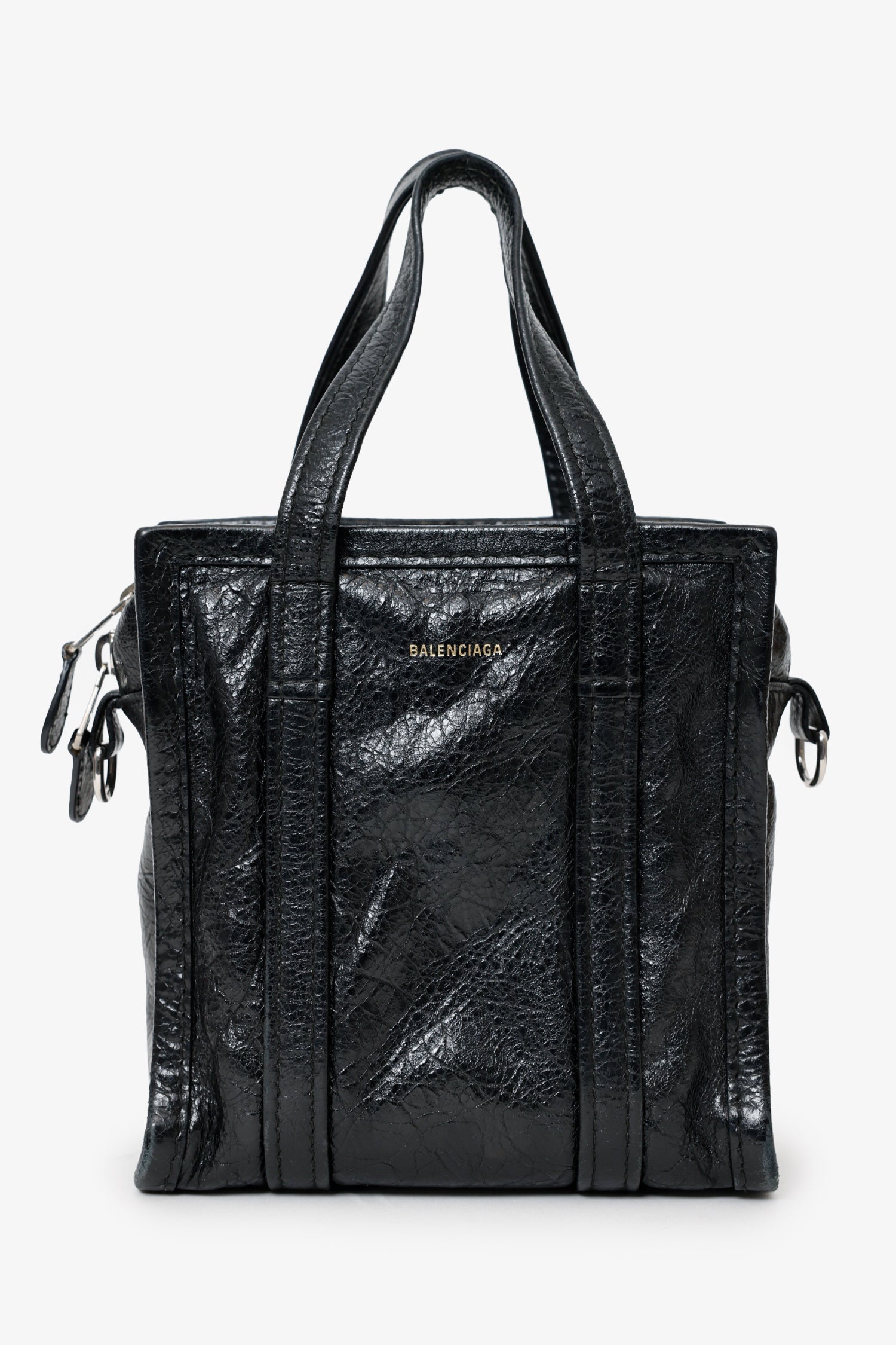 Balenciaga Black Leather XXS Bazar Leather Tote with Strap. Top zip closure. Twin top handles. Removable and adjustable push-pin buckle closure crossbody strap with clasp closure. Lined interior. 2 interior pockets; 1 slip and 4 cardholders. Silver-tone hardware. Tonal stitching.
