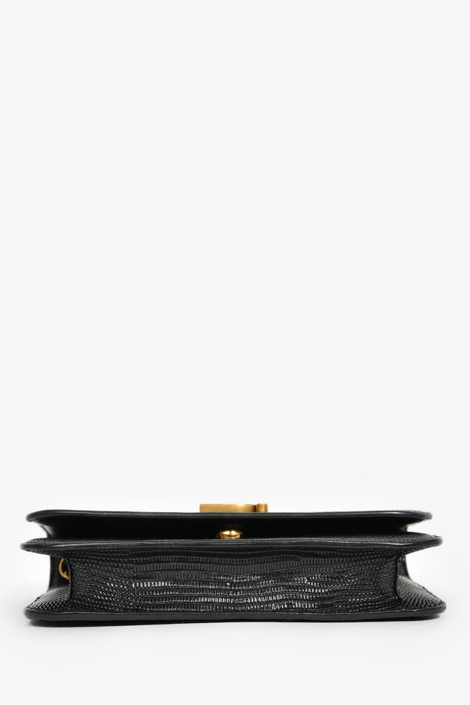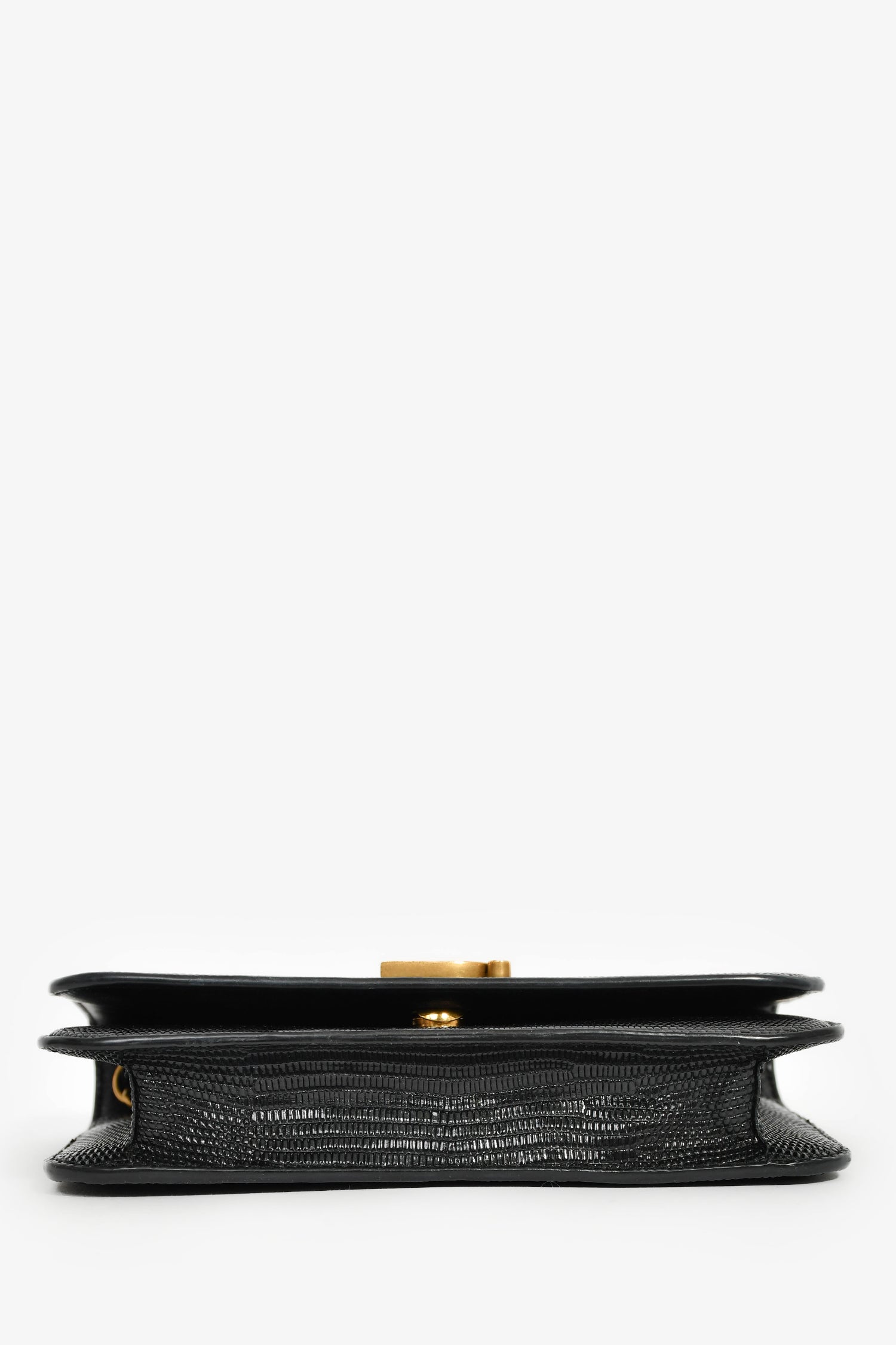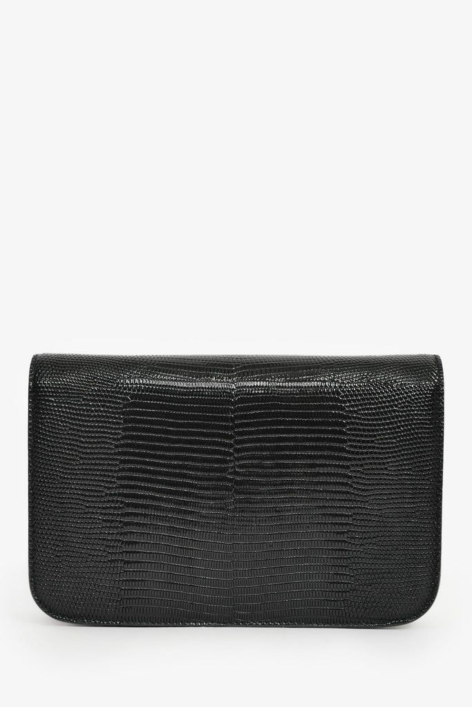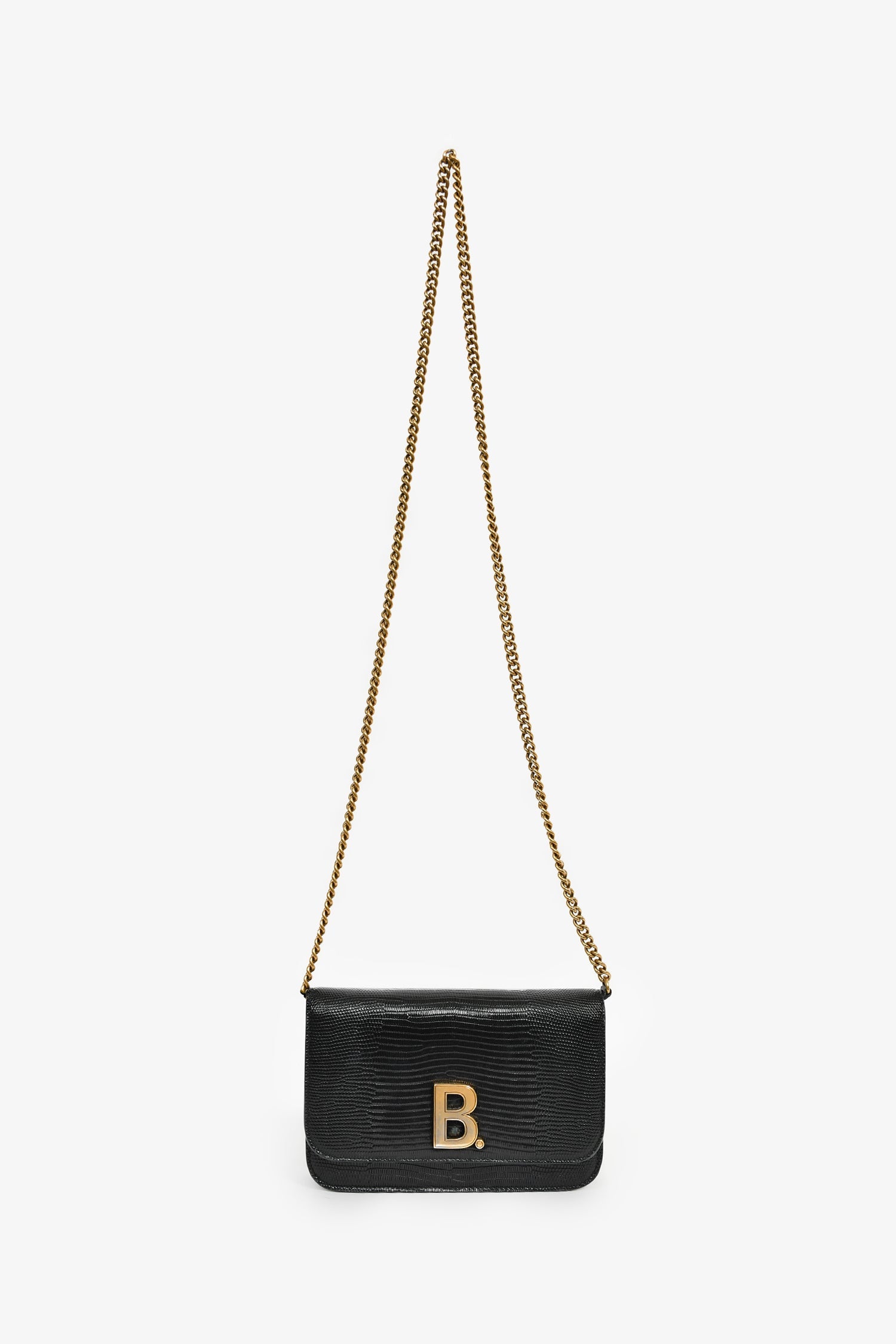 Balenciaga Black Lizard Embossed B. Logo Wallet On Chain Crossbody. Fold-over flap with a snap closure. Chain-link crossbody strap. 1 exterior zip, 1 interior slip, and 6 card slots. Gold-tone hardware. Tonal stitching.