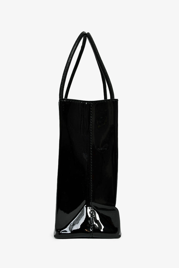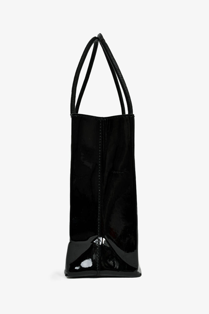 Balenciaga Black Patent Logo XXS Shopping Tote Bag. Rolled top handles. Lined interior. 2 interior pockets; 1 slip and 1 zip. Tonal stitching. Silver-tone hardware.