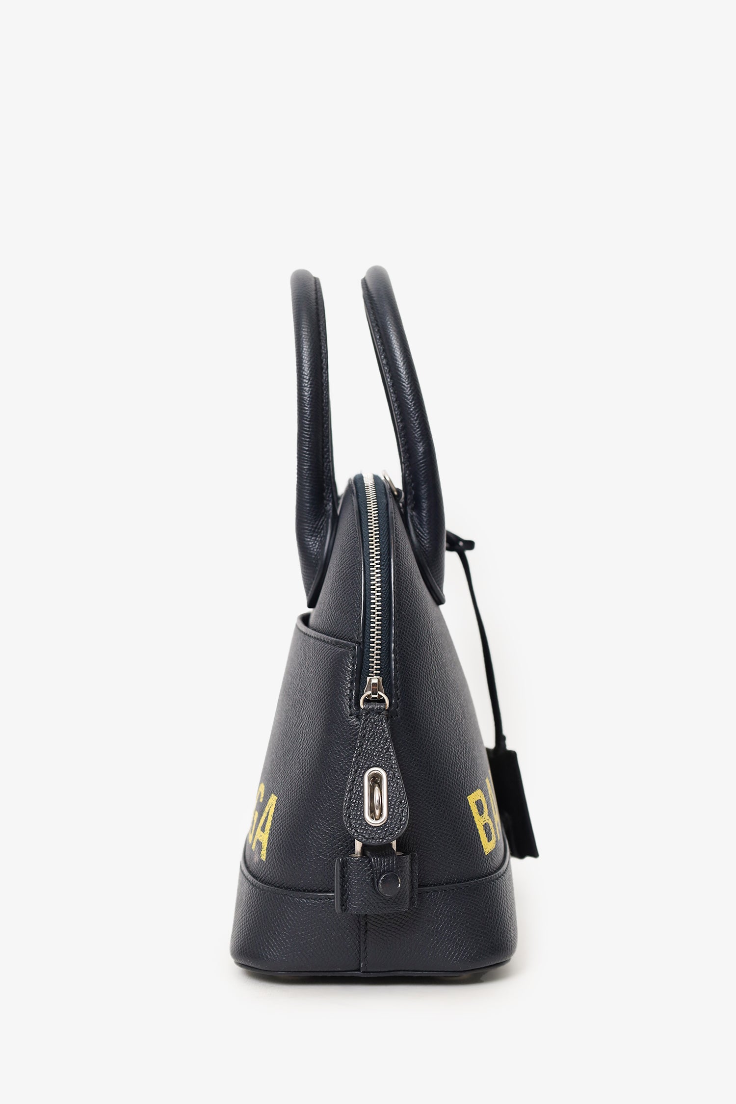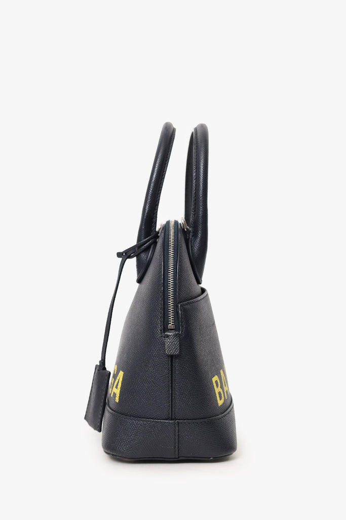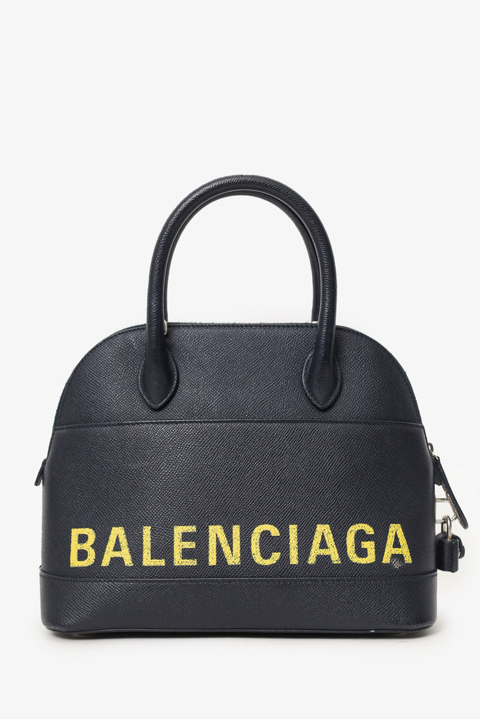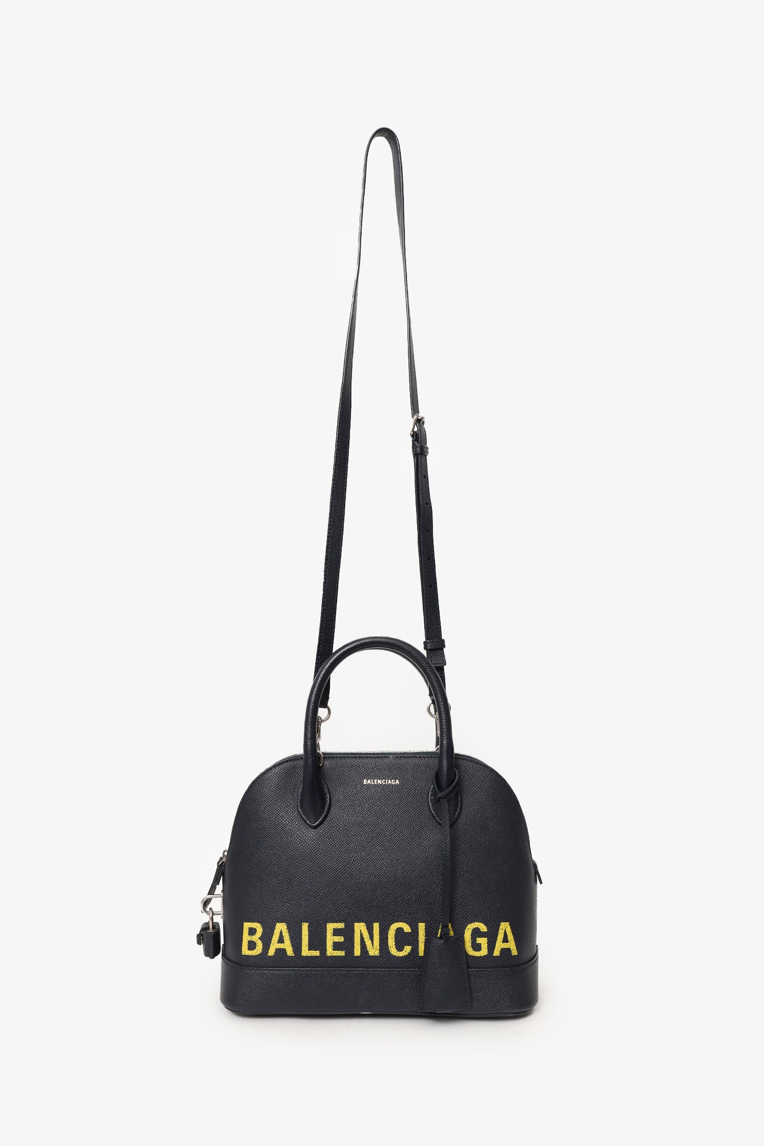 Balenciaga Black/Yellow Leather Logo Ville Leather Top Handle Bag with Strap. Top zip closure. Twin top handles. Removable strap with adjustable buckle closure. Protective base studs. Single rear exterior slip pocket. Lined interior. 2 interior pockets; slip and pockets. Silver-tone hardware. Tonal stitching. Includes clochette (lock and keys).