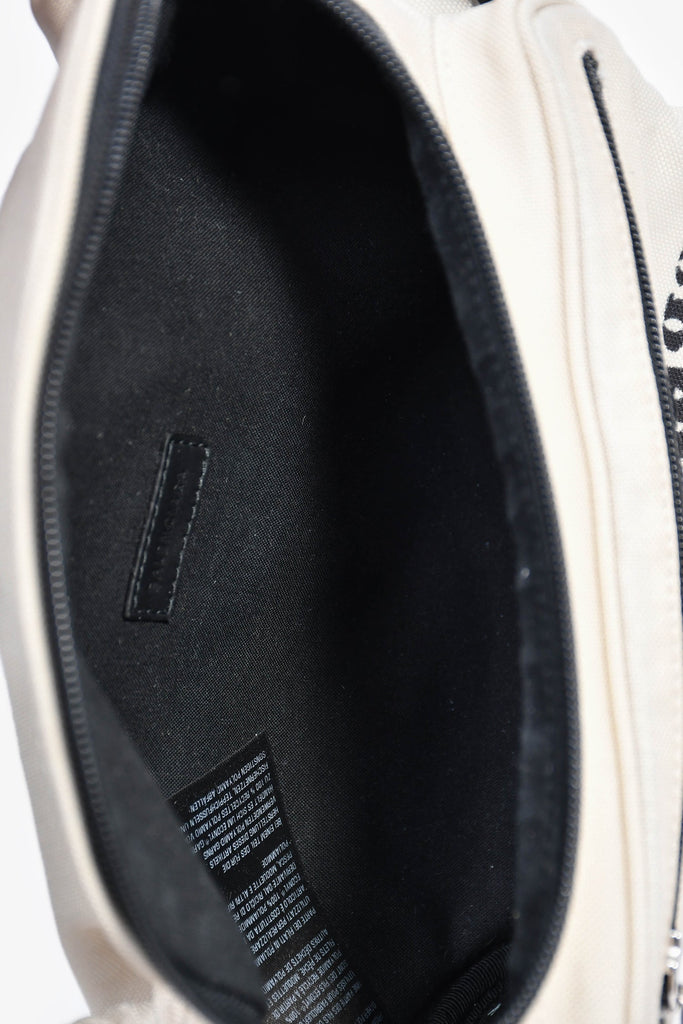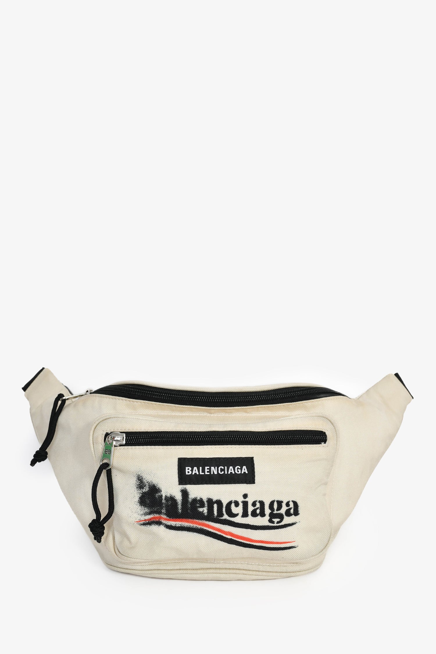 Balenciaga Cream Canvas Graffiti Logo Belt Bag. Top zip closure into main compartment. Front zip closure into second compartment. Open interior to both compartments. Adjustable and detachable belt strap. Tonal stitching. Silver-tone hardware.