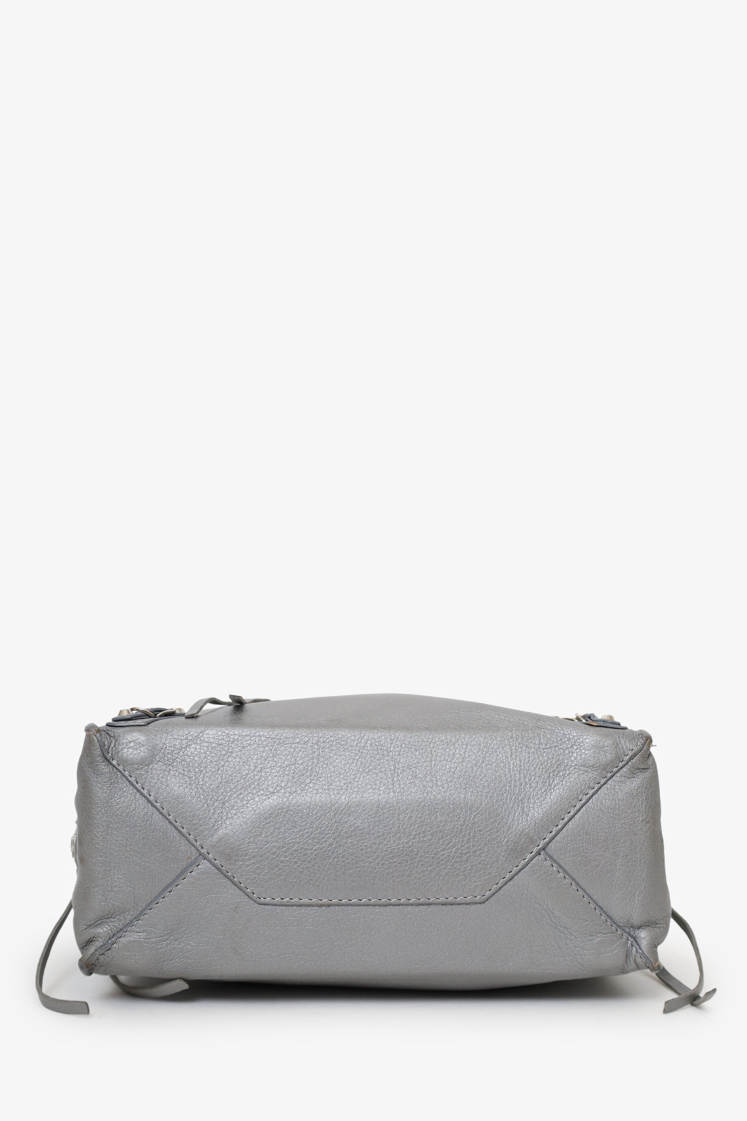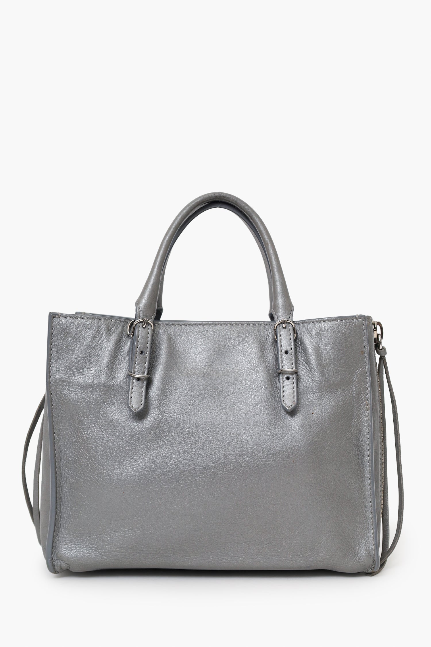 Balenciaga Grey Calfskin Papier Mini A4 Zip Around Tote With Strap. Magnetic button closure. Adjustable twin top handles with push pin buckle closure. Removable and adjustable push pin buckle crossbody strap with clasp closure. Single exterior zip pocket. Leather lined interior. 1 interior compartment with back wall slip pocket. Silver-tone hardware. Tonal stitching.