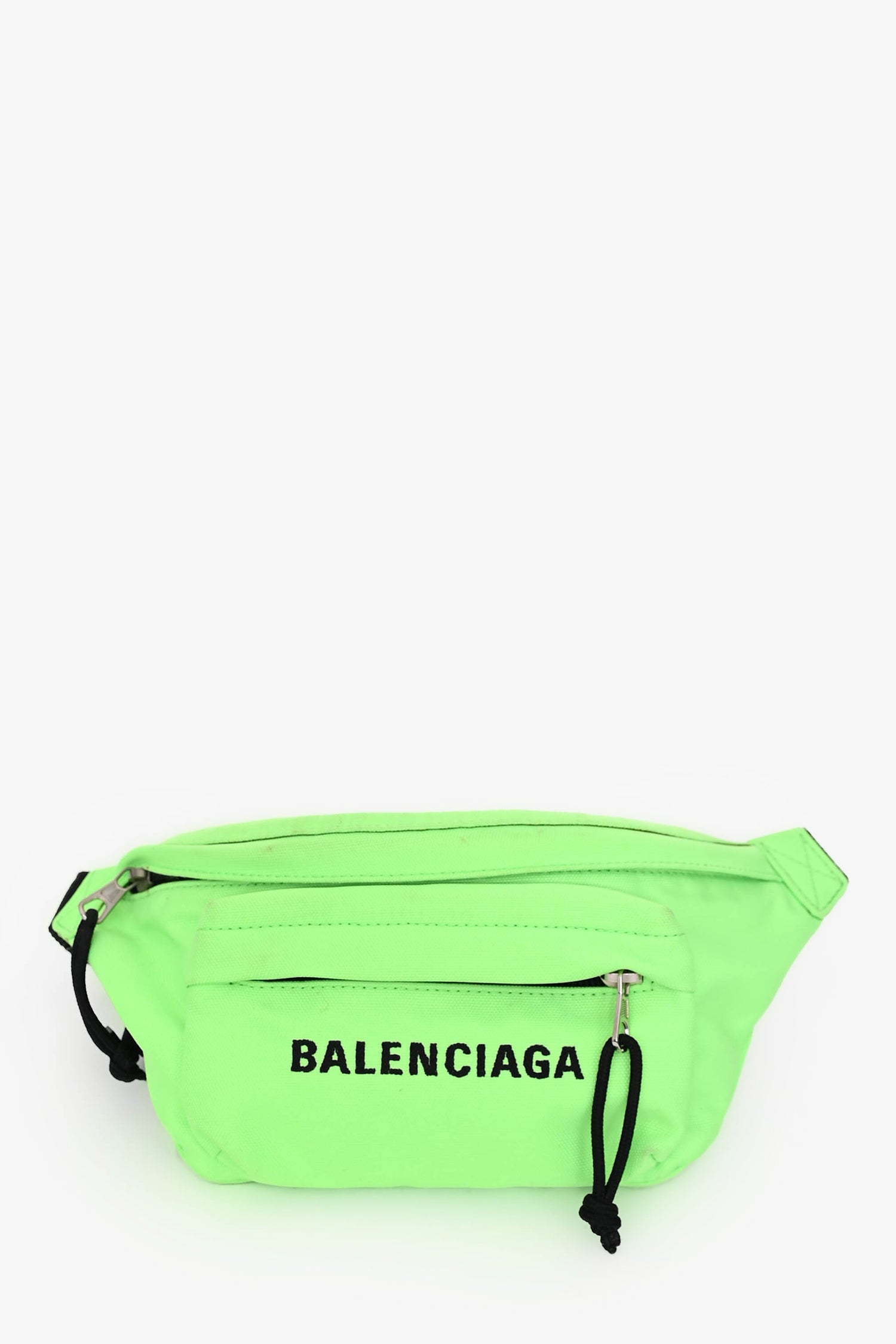 Balenciaga Neon Green Canvas Logo Belt Bag. Front zip closure. Adjustable belt strap with buckle fastening. 1 exterior zip pocket. Silver-tone hardware. Tonal stitching.
