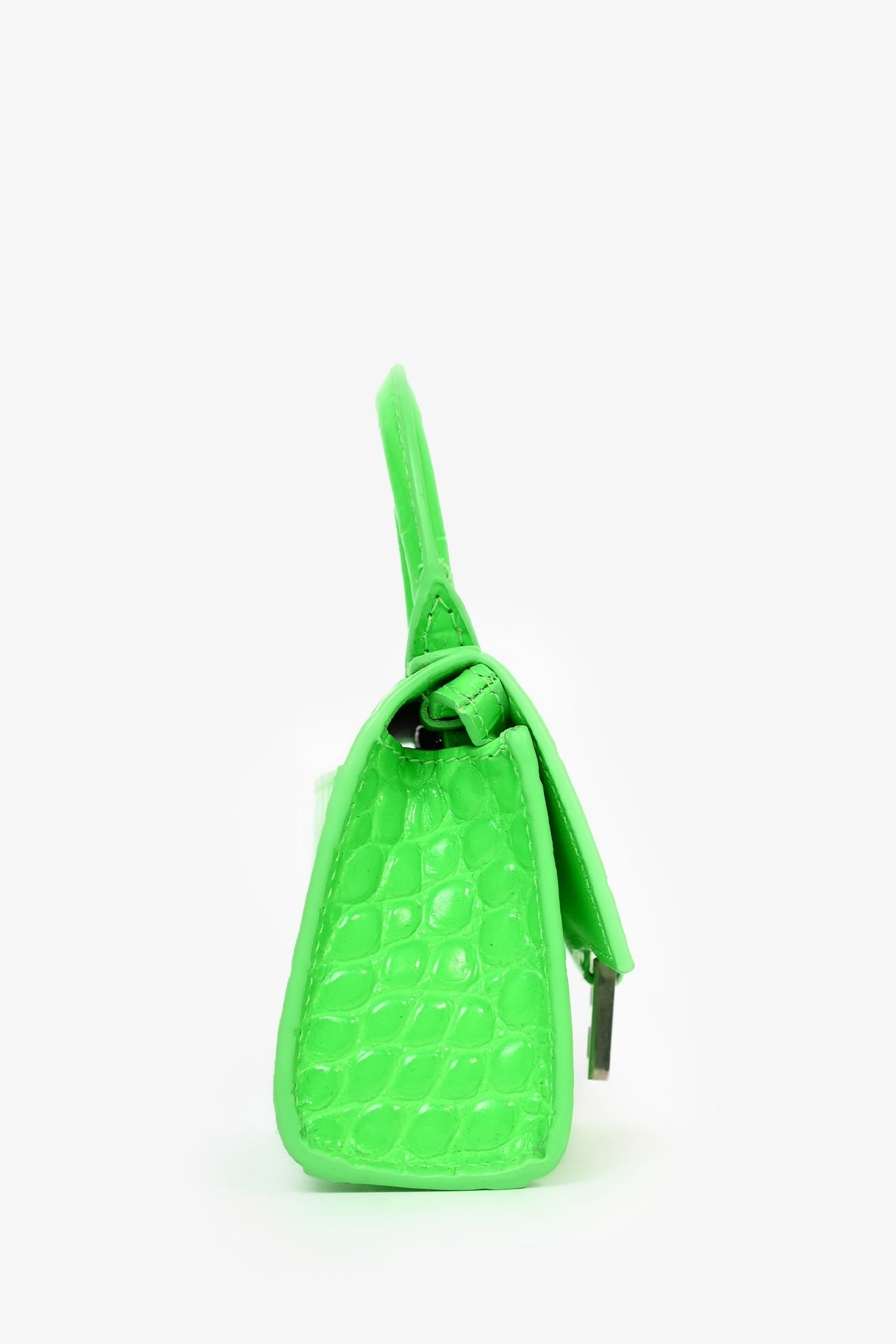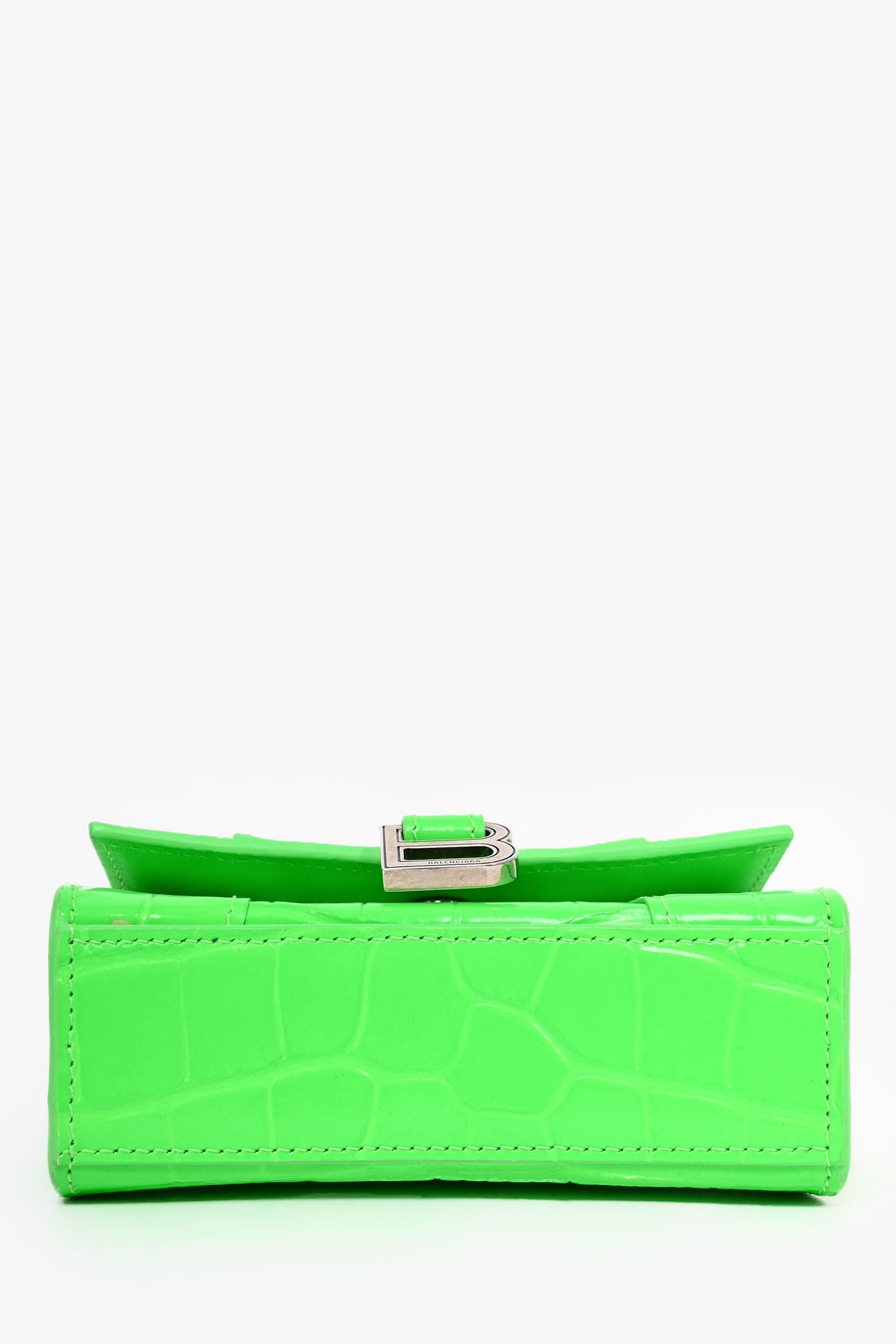 Balenciaga Neon Green Croc Embossed Nano Hourglass Crossbody. Fold-over flap with a snap closure. Silver-tone hardware. Single rolled top handle. Single adjustable crossbody strap. Tonal stitching.