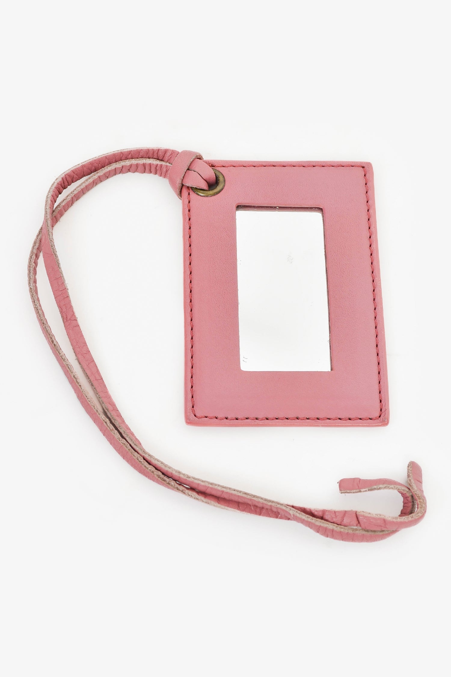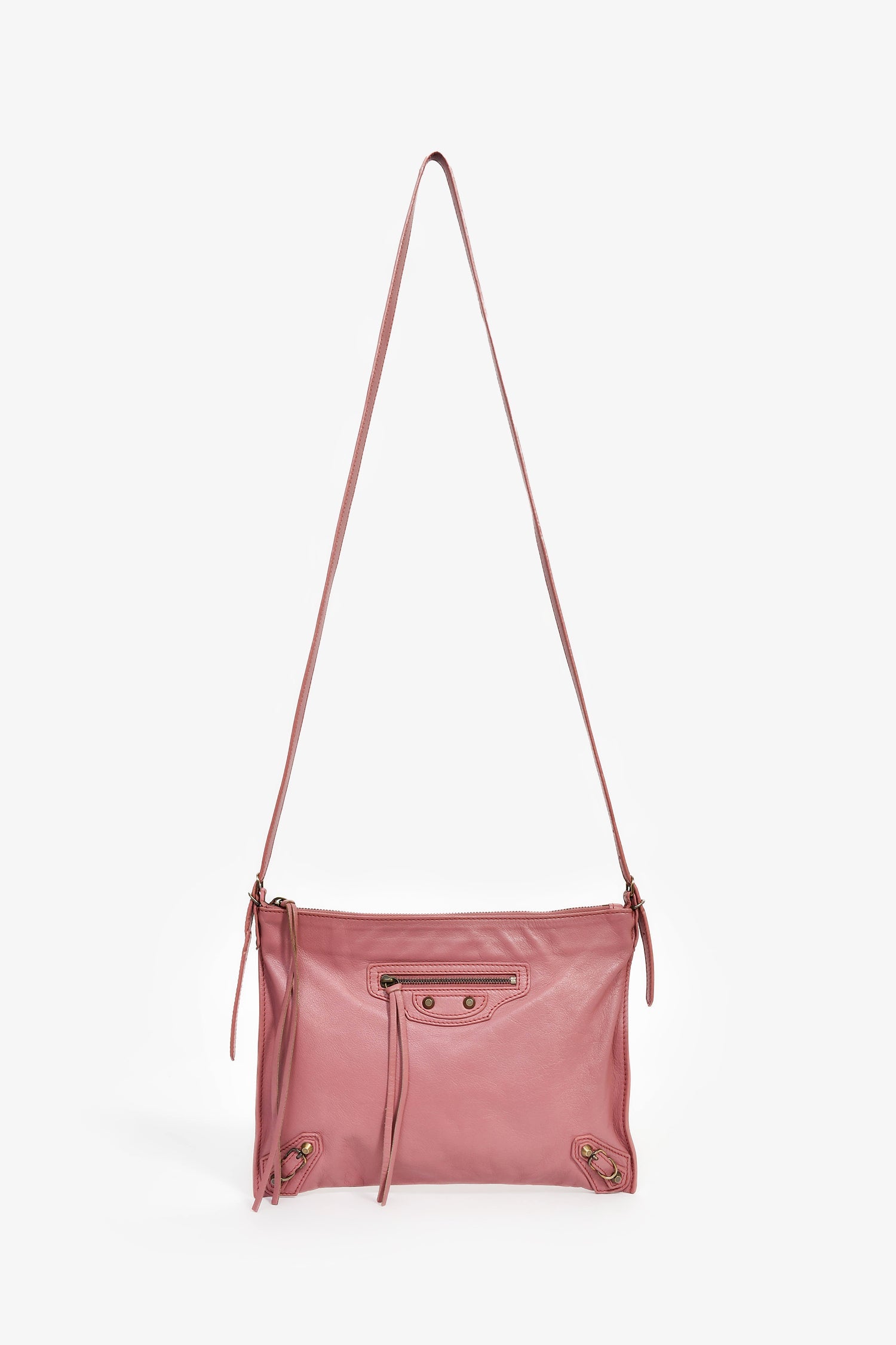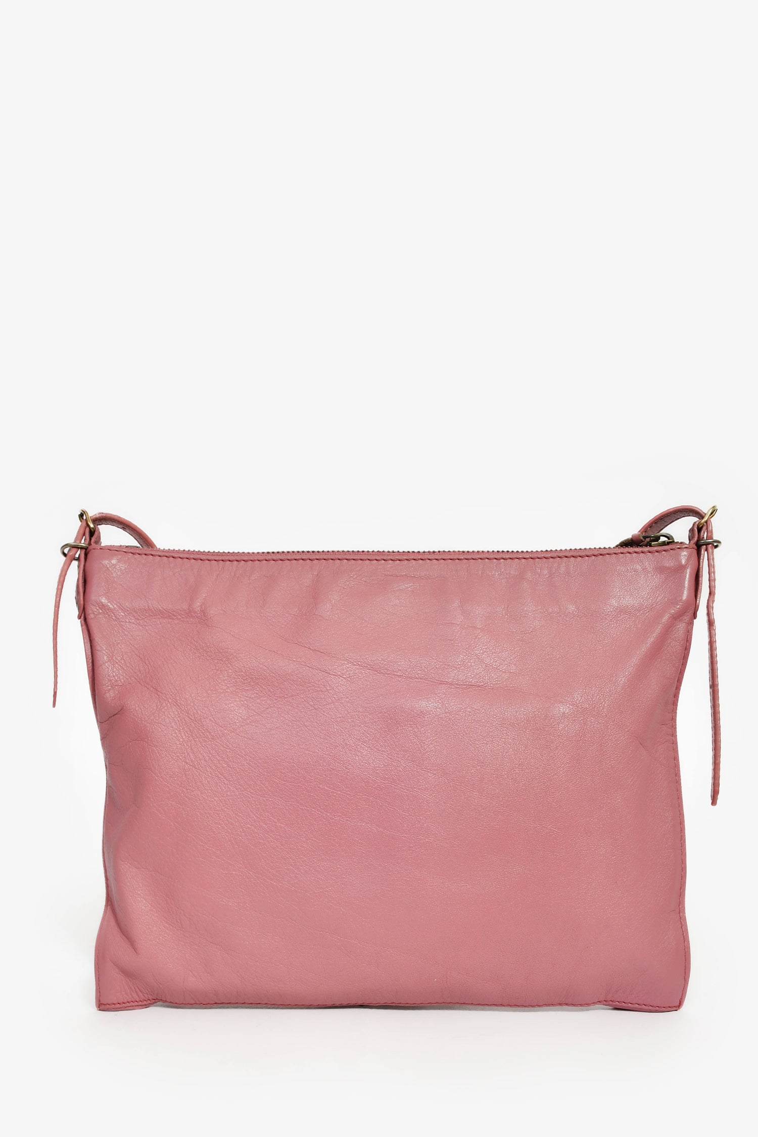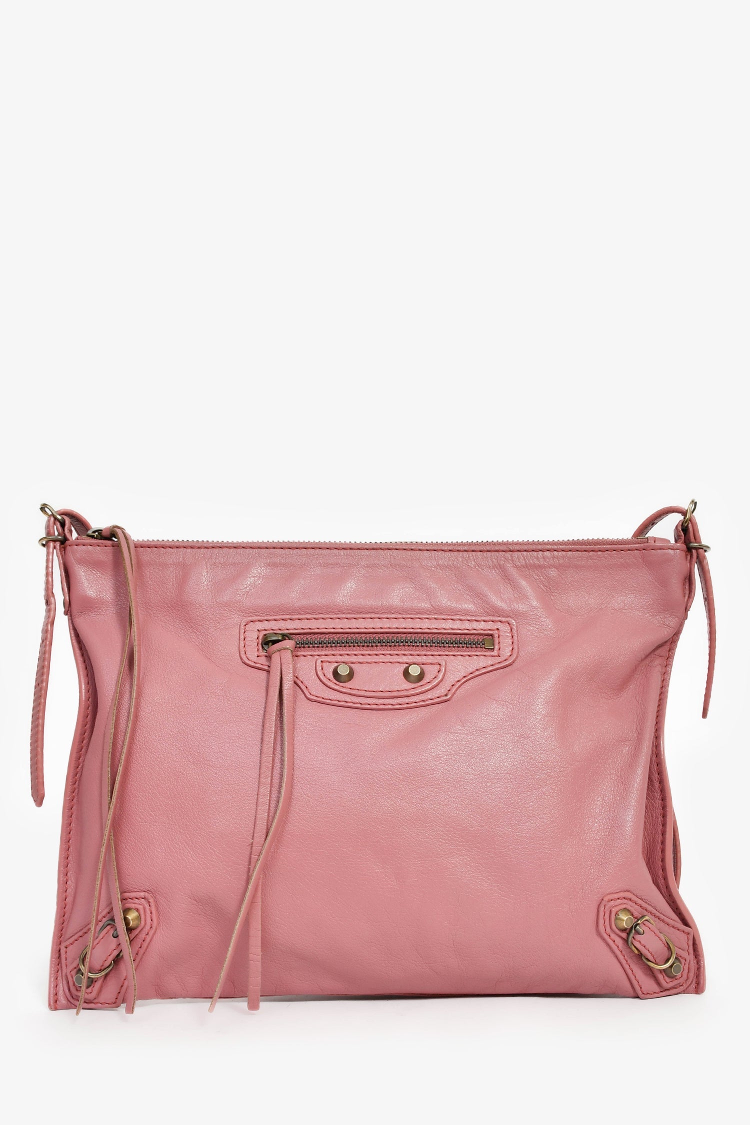 Balenciaga Pink Leather 'Papier Neo' Crossbody Bag. Top zip closure. Adjustable strap. Front exterior zip pocket. Leather-lined interior. 2 interior wall slip pockets. Detachable mini mirror. Gold-tone hardware. Tonal stitching.