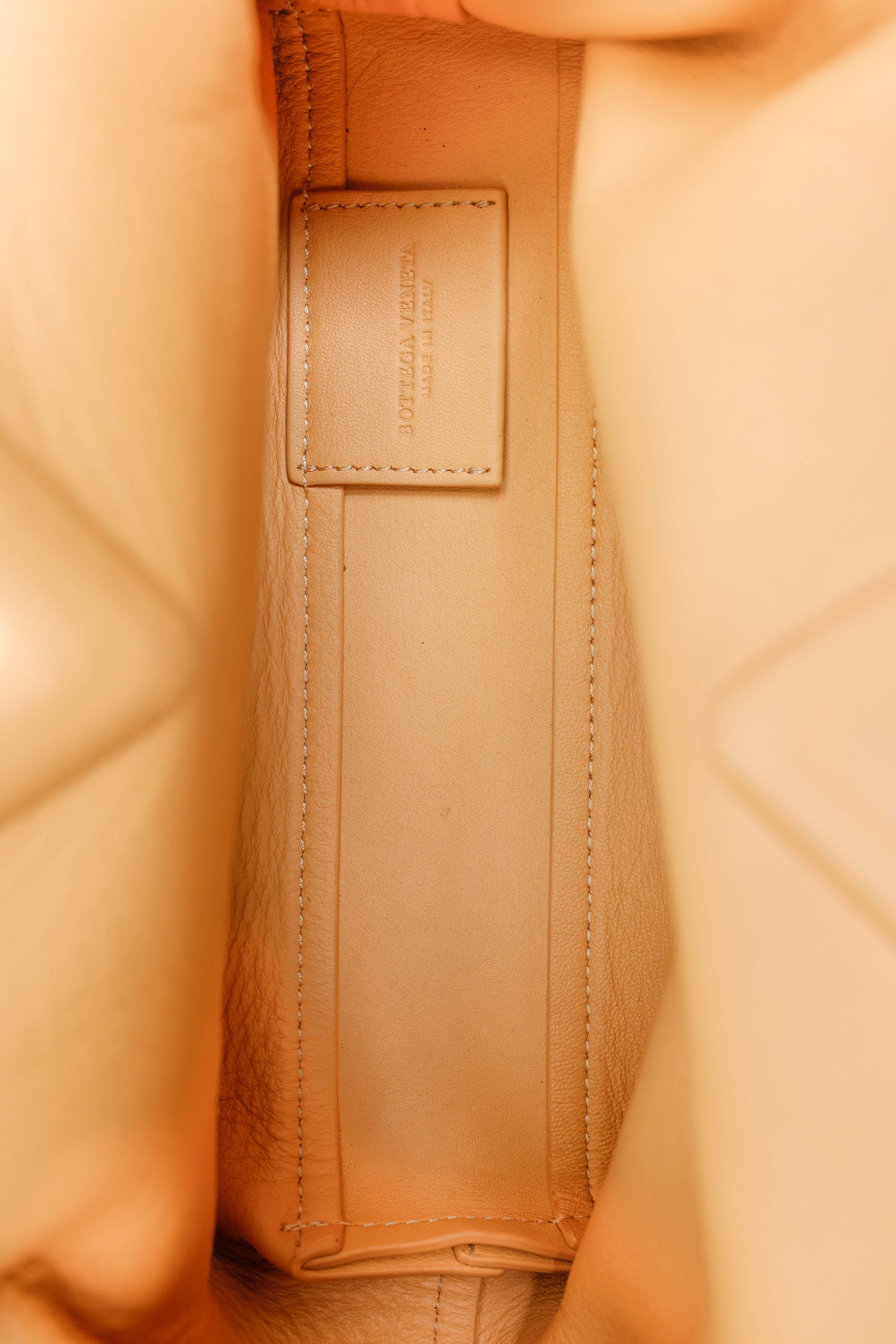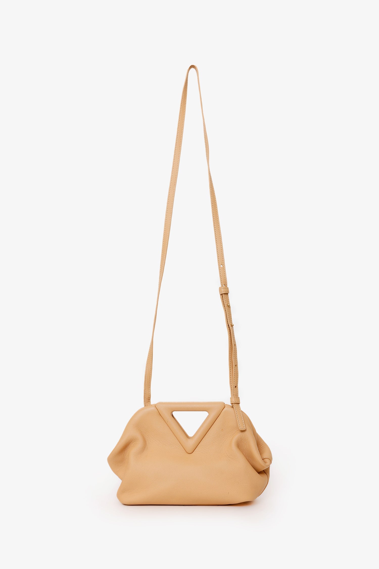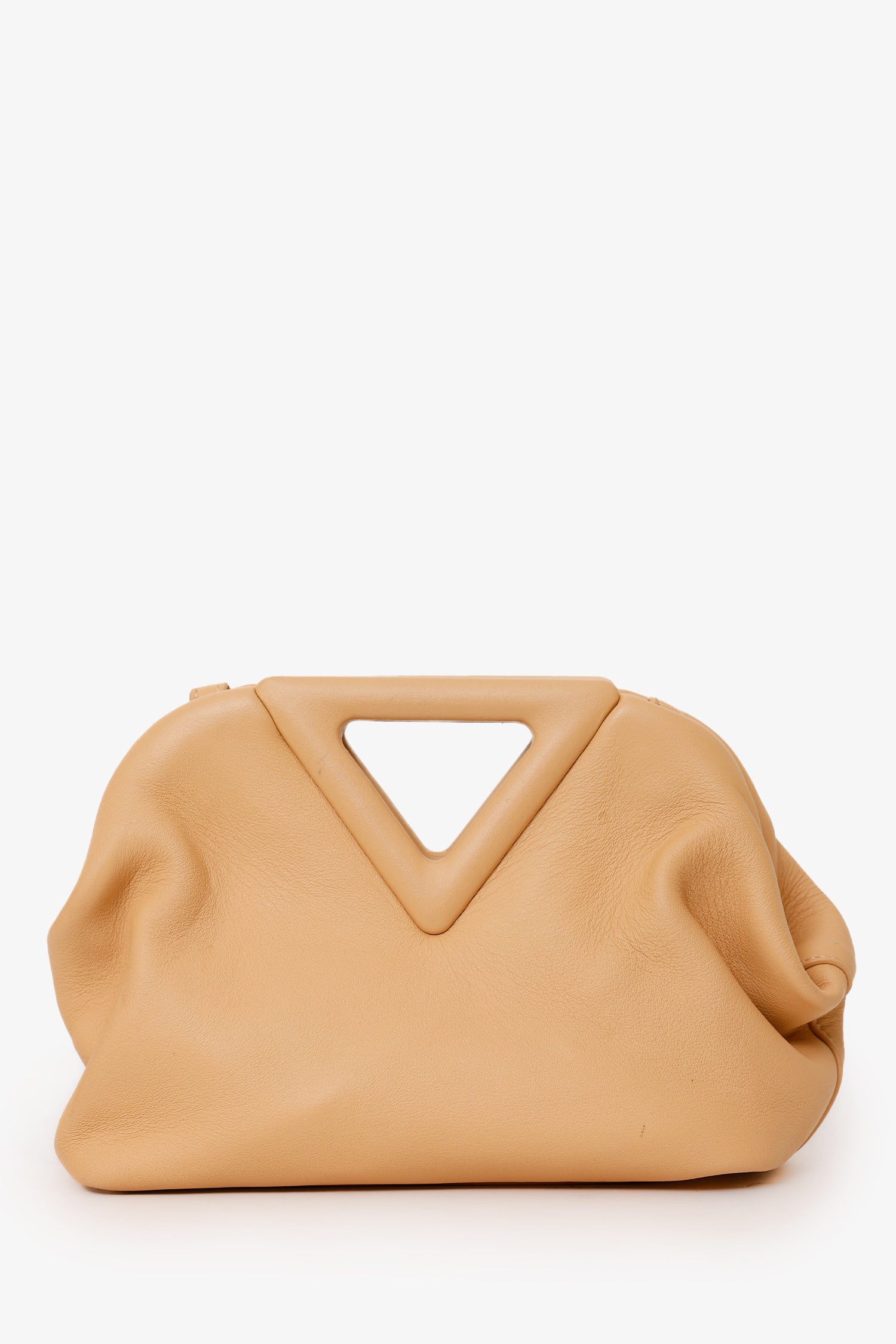 Bottega Veneta Beige Leather Small Point Clutch With Strap. Magnetic top closure. Top handles. Removable crossbody strap with adjustable pull-through push-pin closure. Leather-lined interior. Gold-tone hardware. Tonal stitching.