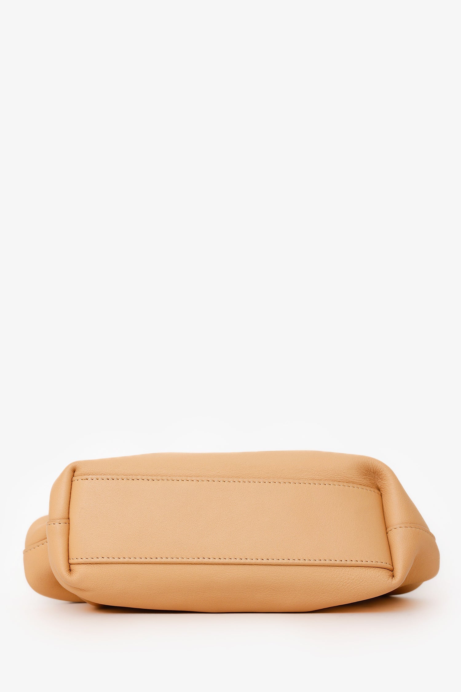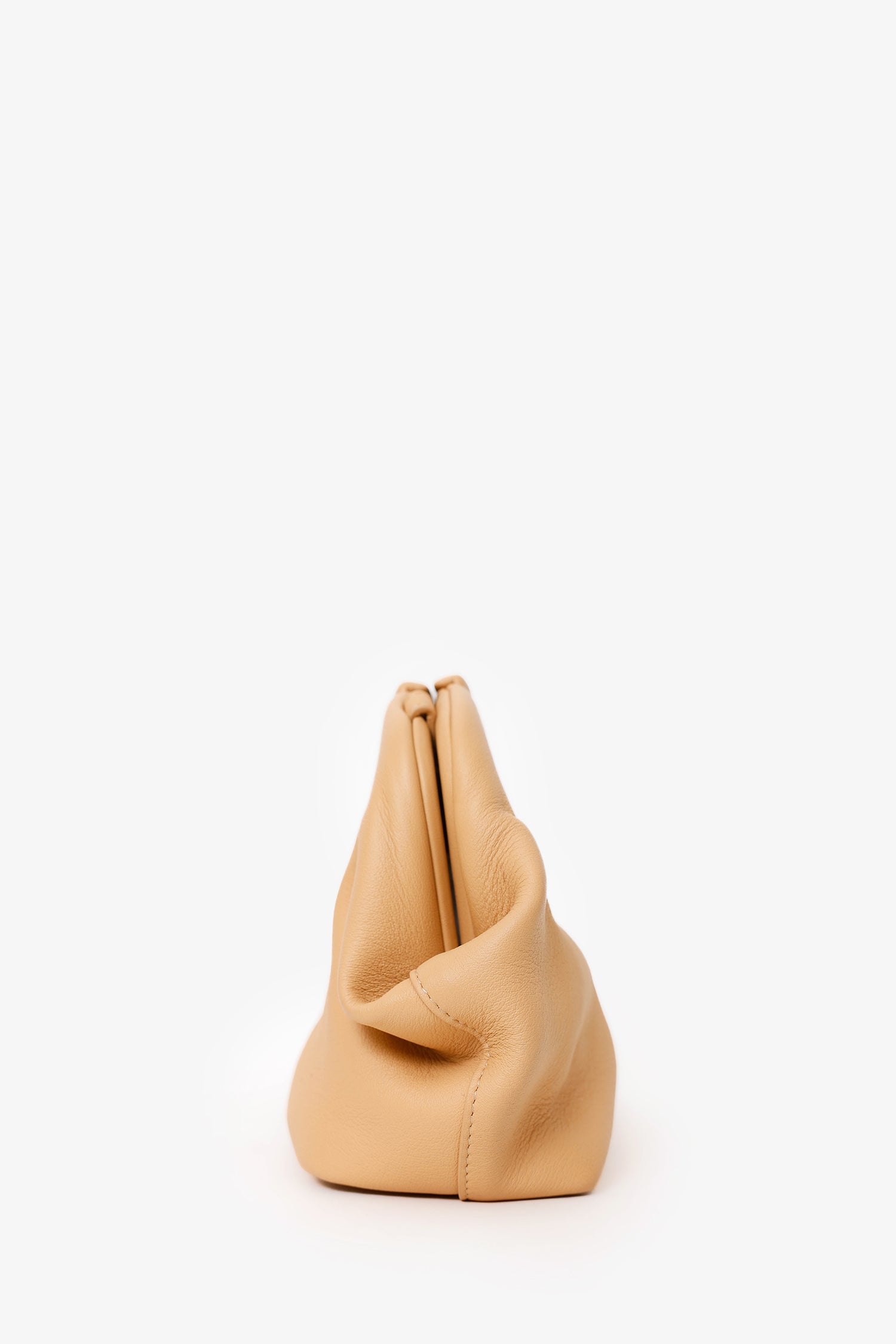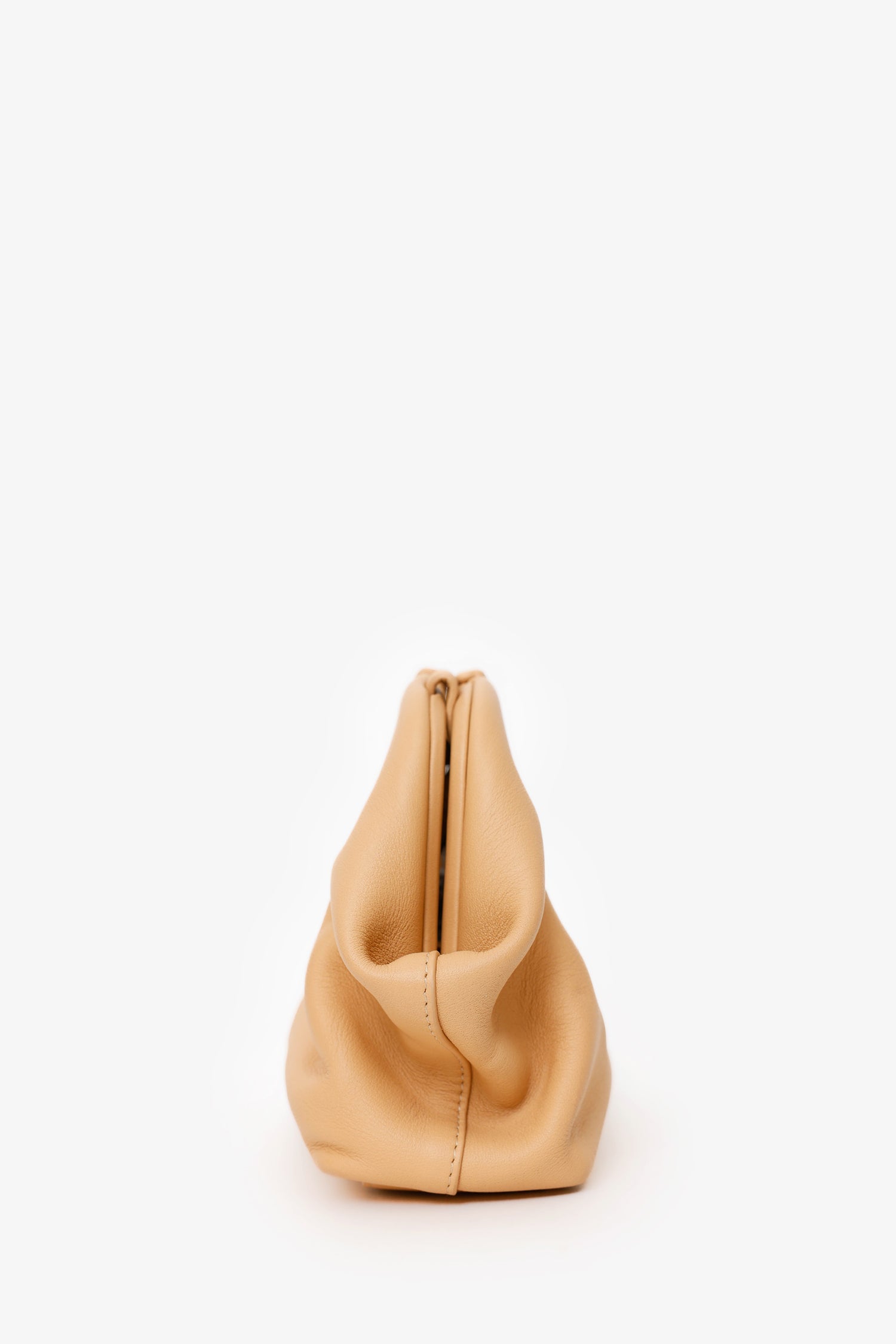 Bottega Veneta Beige Leather Small Point Clutch With Strap. Magnetic top closure. Top handles. Removable crossbody strap with adjustable pull-through push-pin closure. Leather-lined interior. Gold-tone hardware. Tonal stitching.