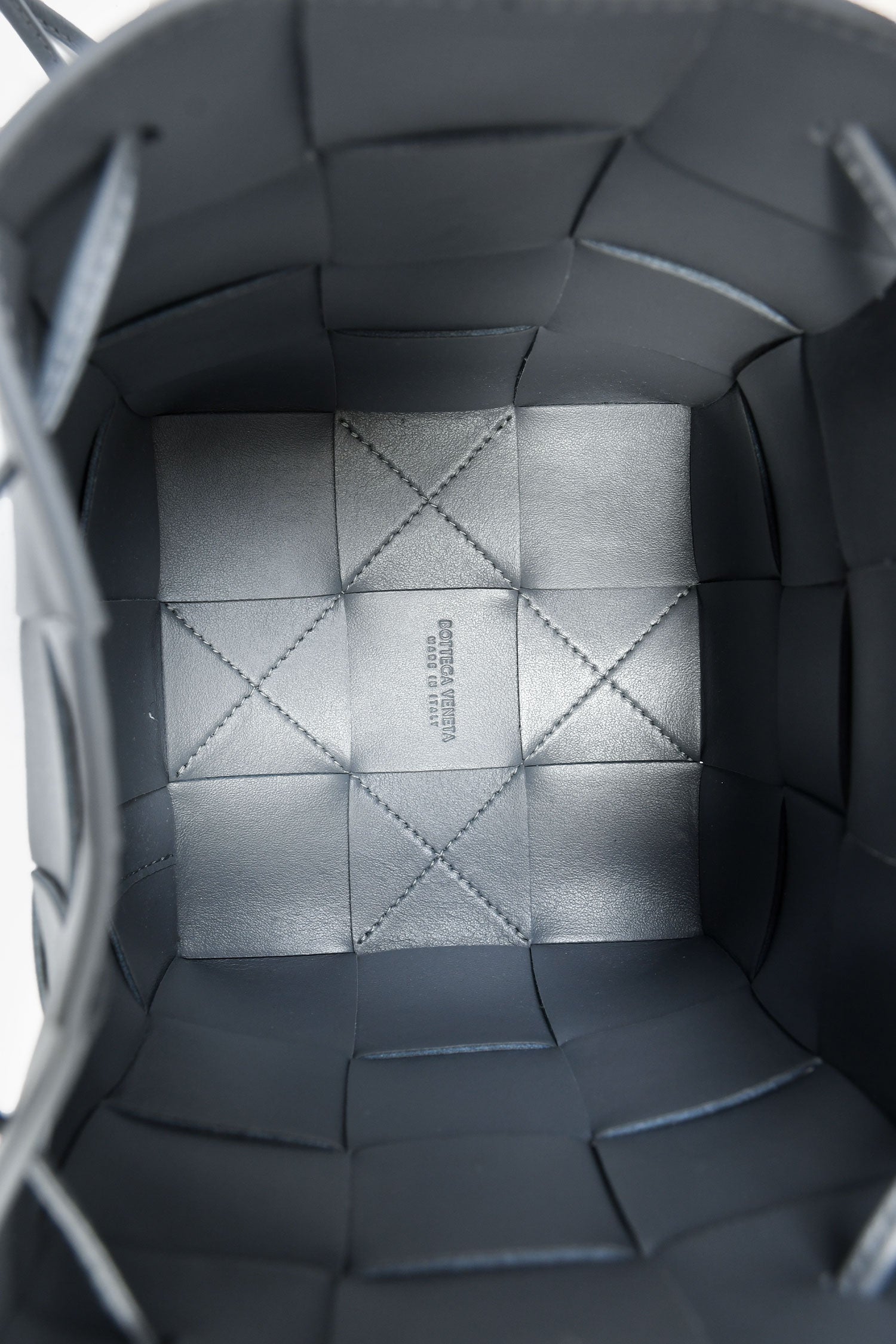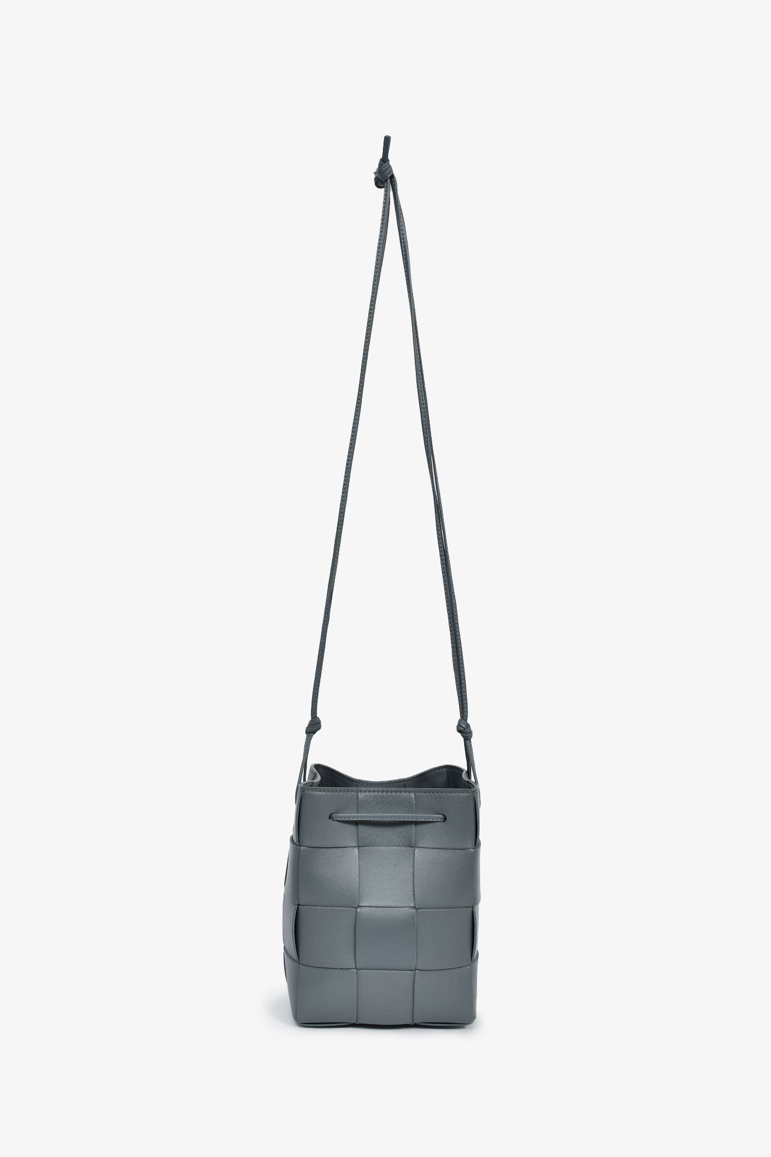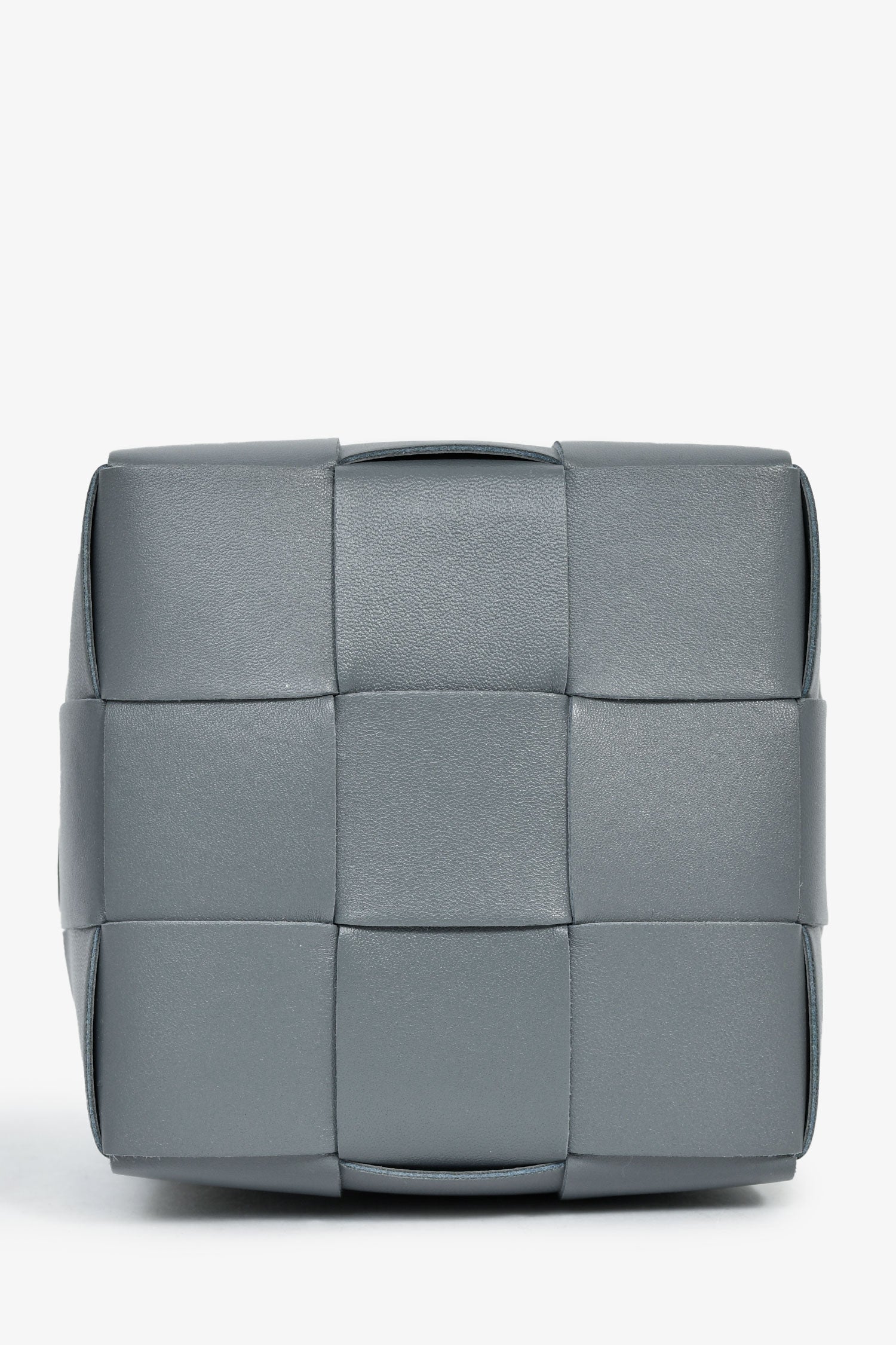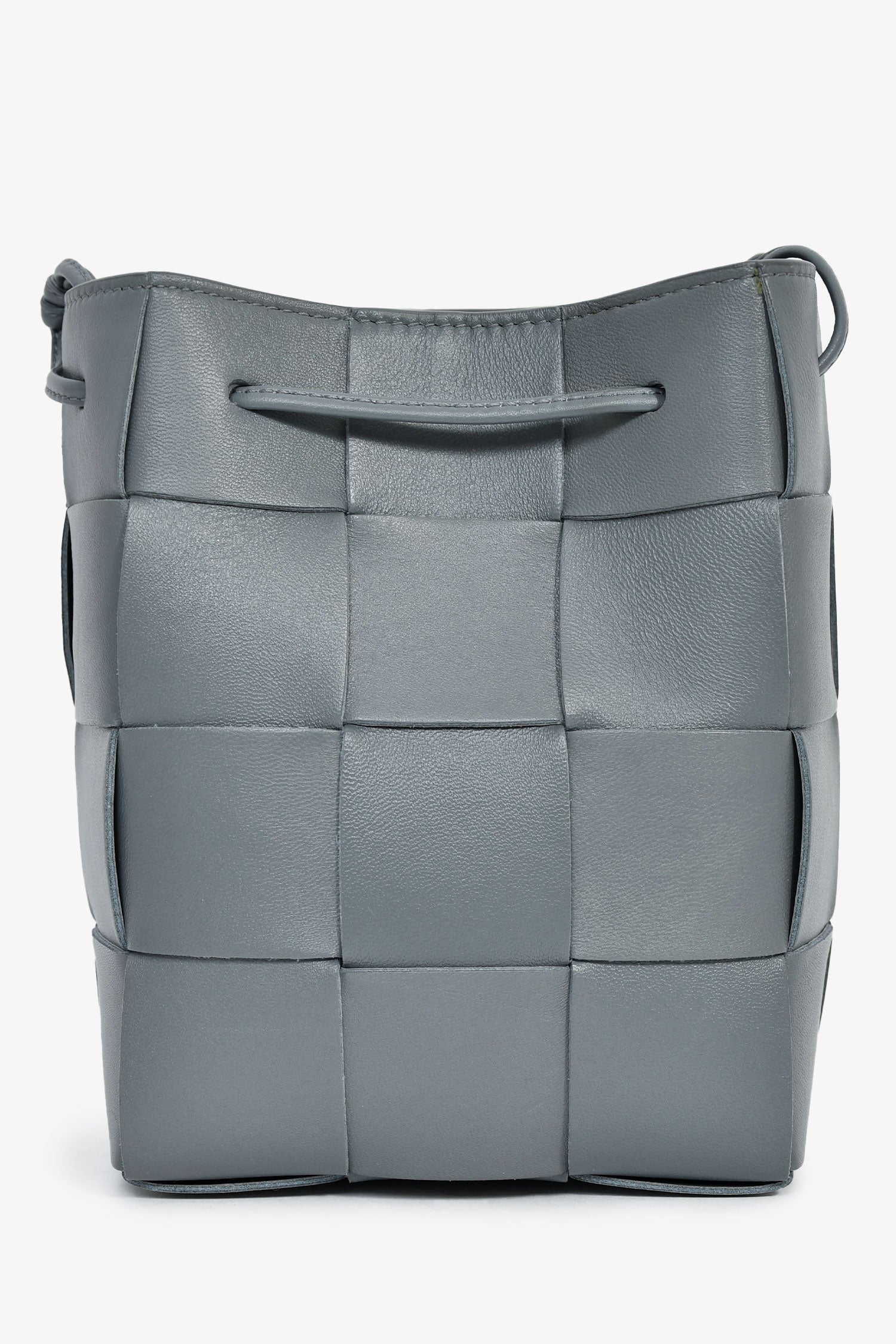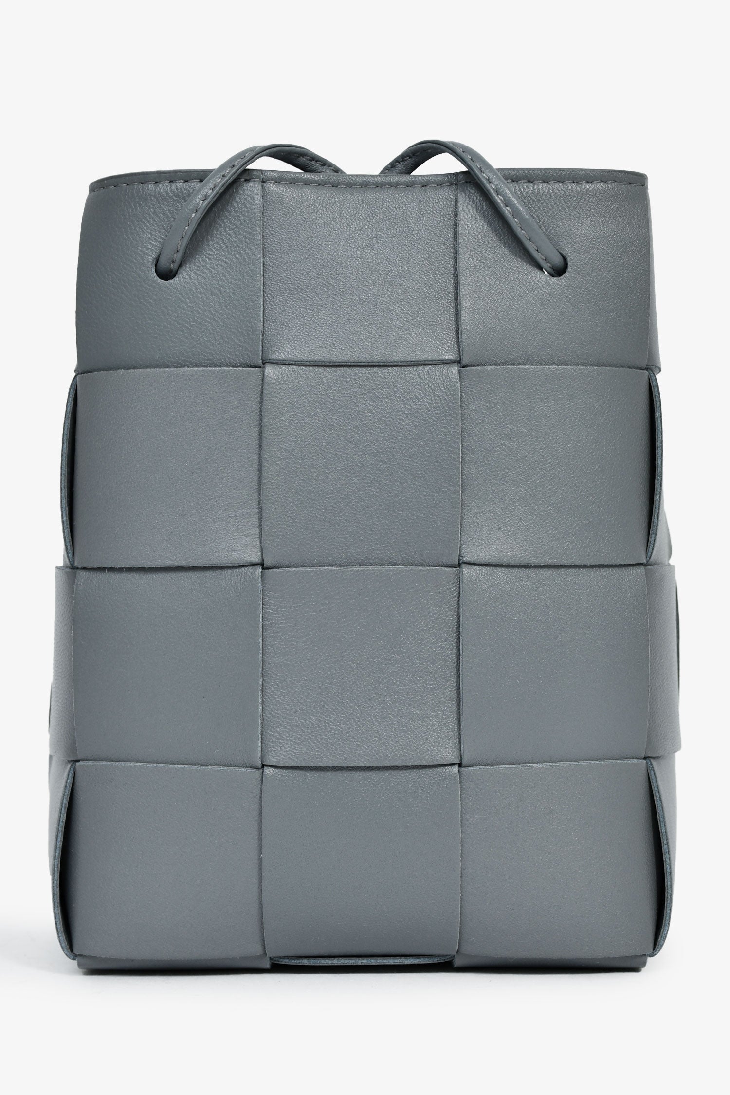 Bottega Veneta Grey Lambskin Cassette Mini Bucket Bag. Open interior. Double shoulder straps. Tonal stitching.