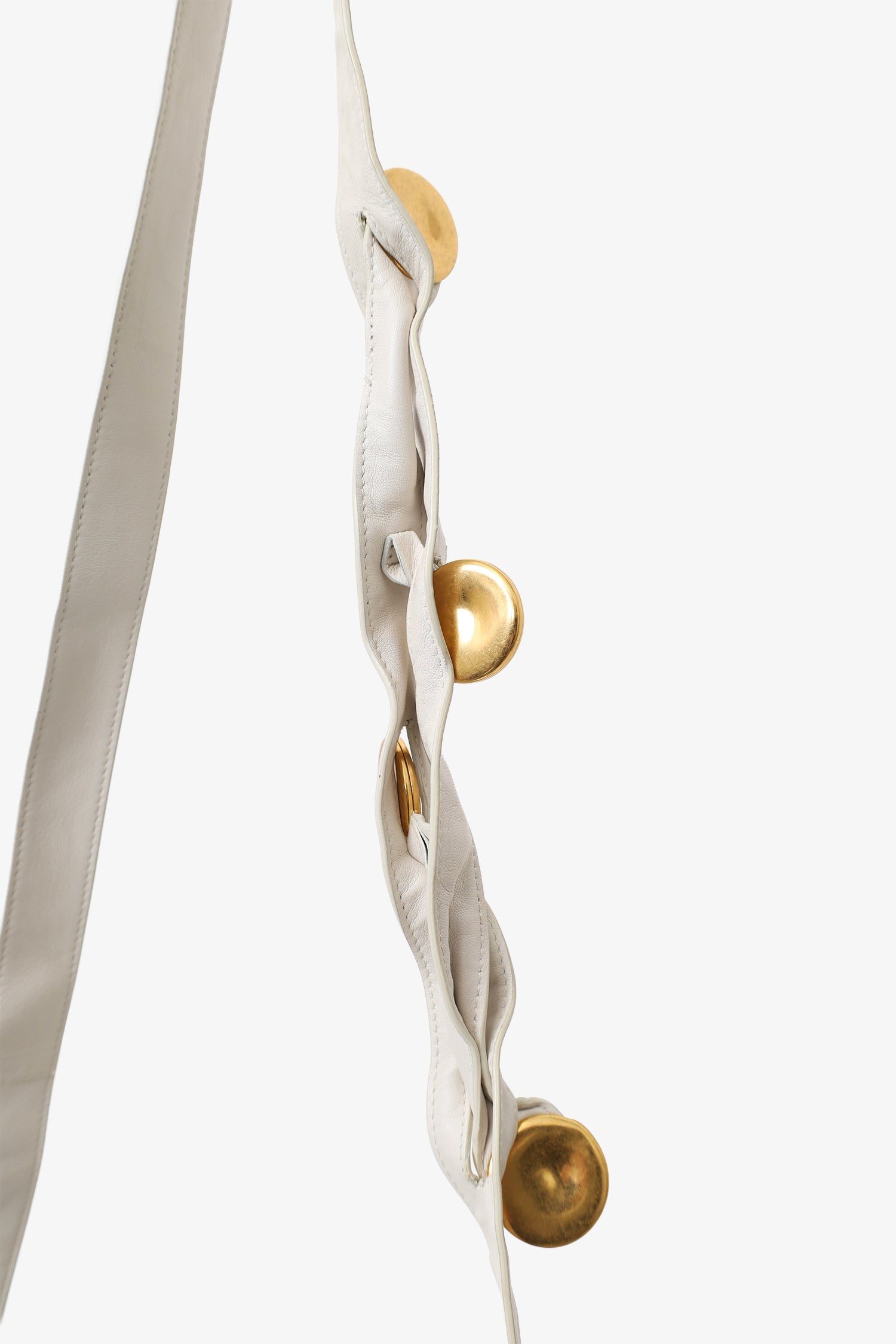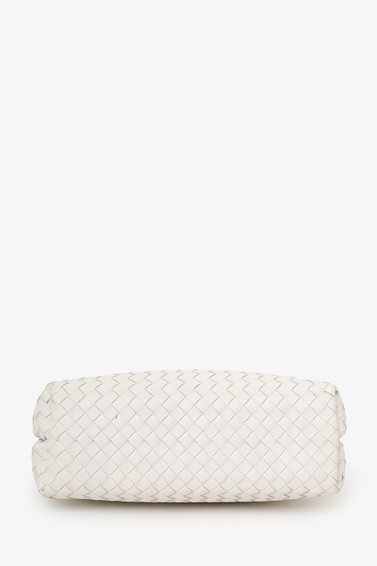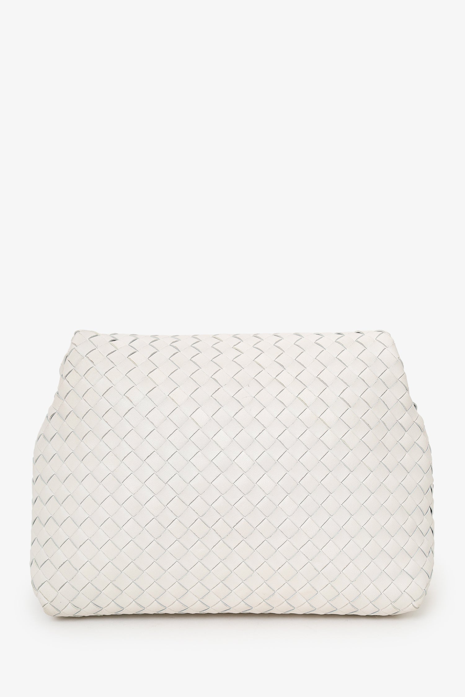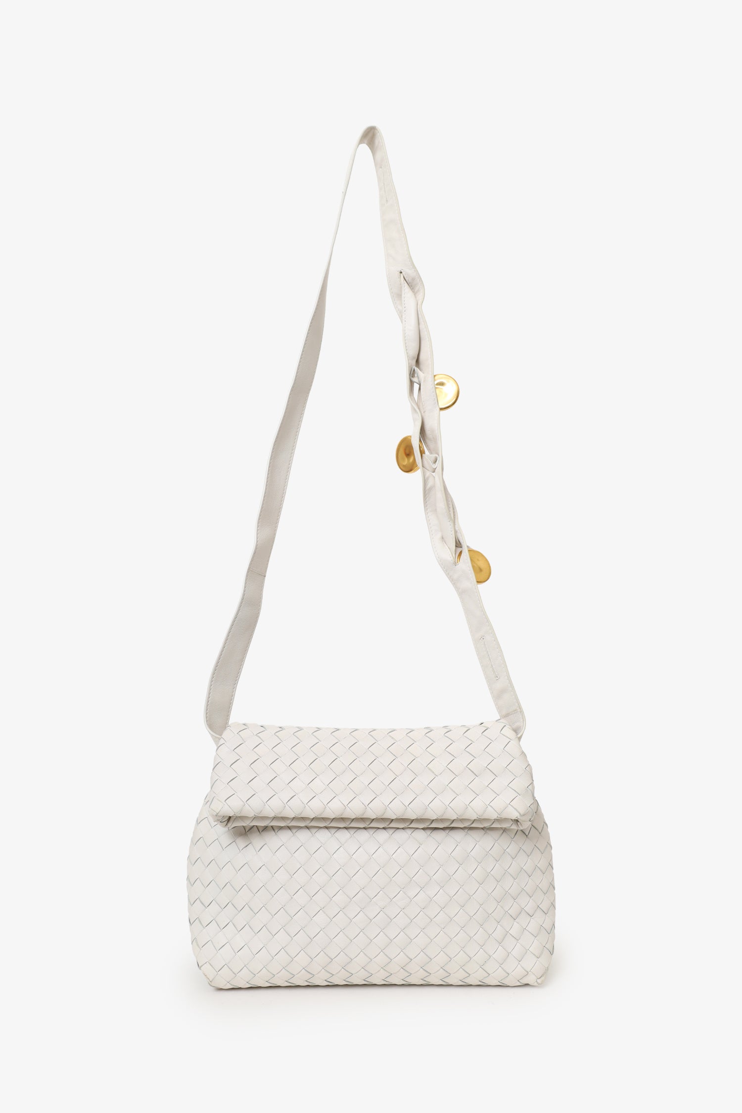 Bottega Veneta White Intrecciato Leather Fold Bag. Front-fold-over-flap. Adjustable and removable crossbody strap. Leather-lined interior with single rear slip pocket. Gold-tone hardware. Tonal stitching.