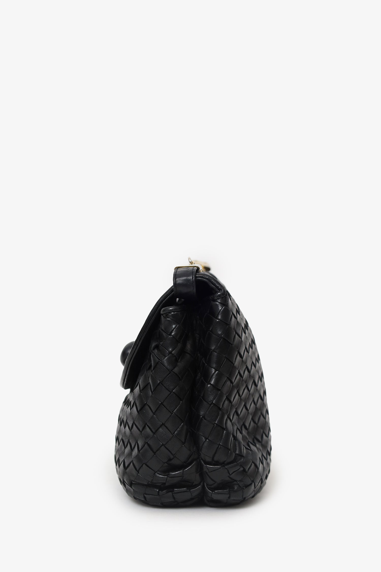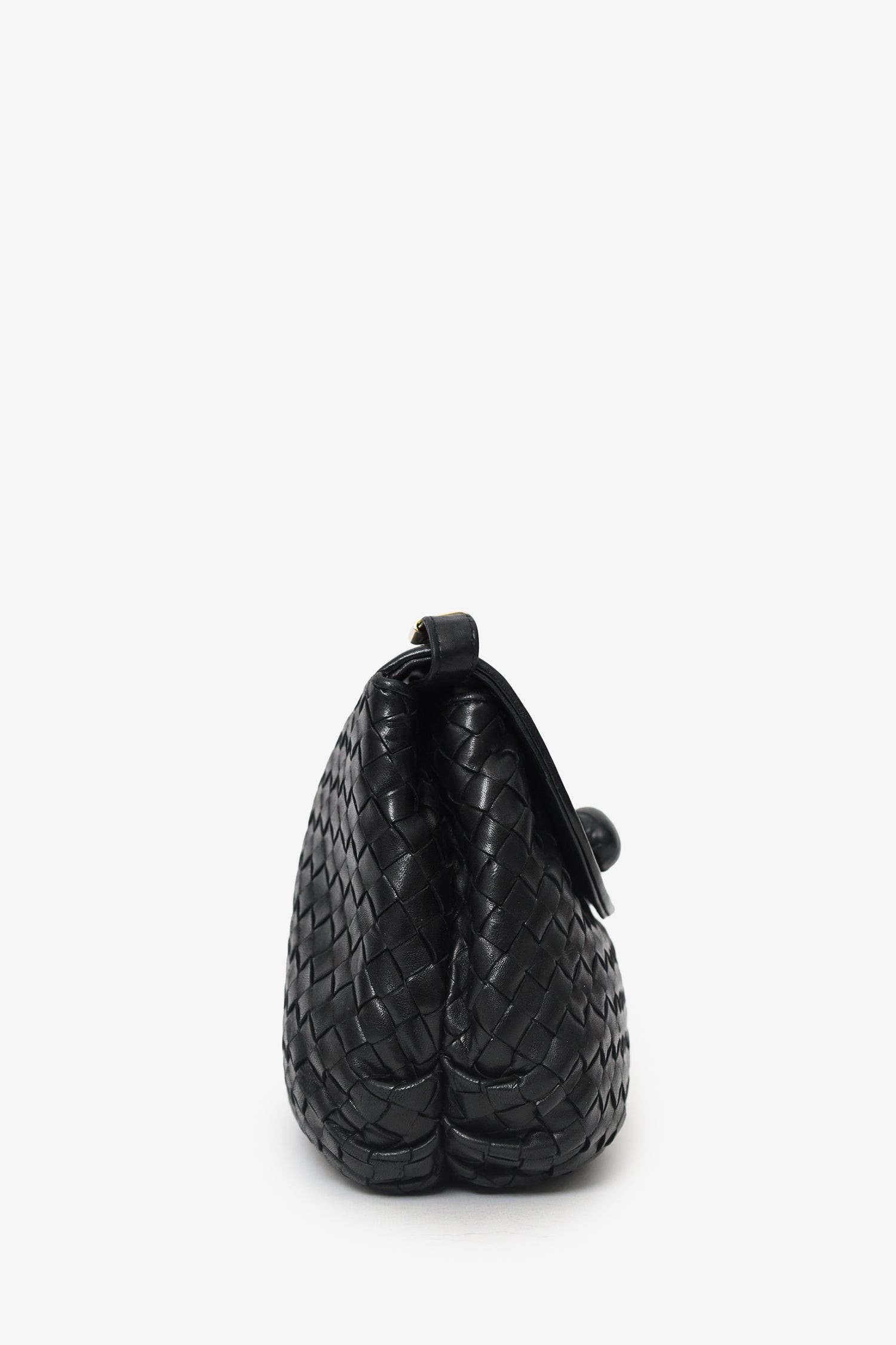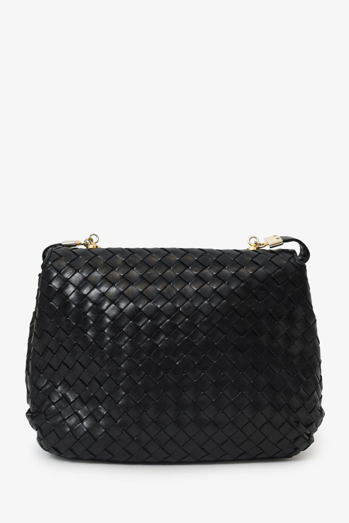 Bottega Venetta Black Intrecciato Crossbody Bag. Front fold-over flap with turn-lock closure. Crossbody strap. Suede-lined interior with single zip pocket. Gold-tone hardware. Tonal stitching.