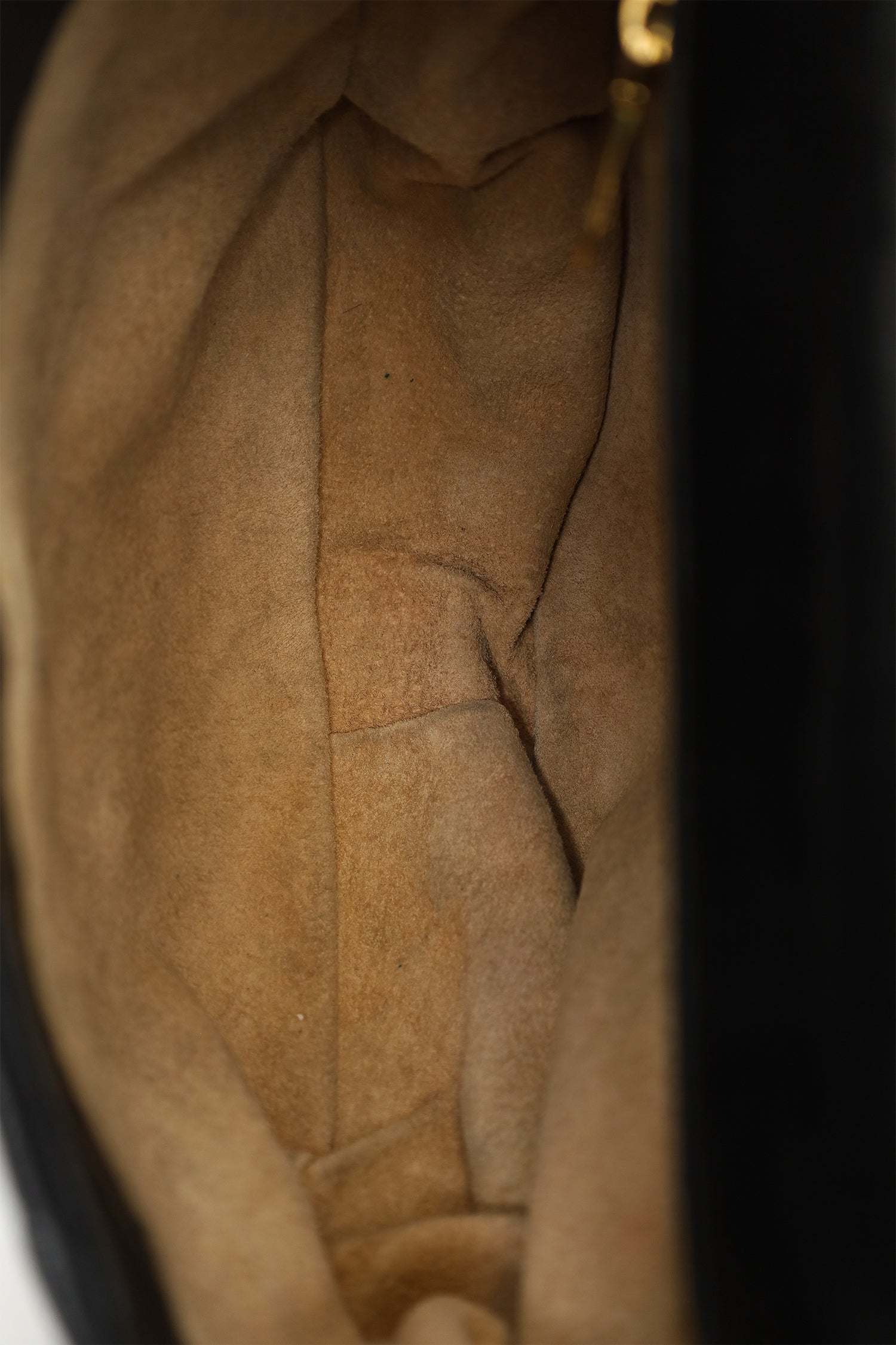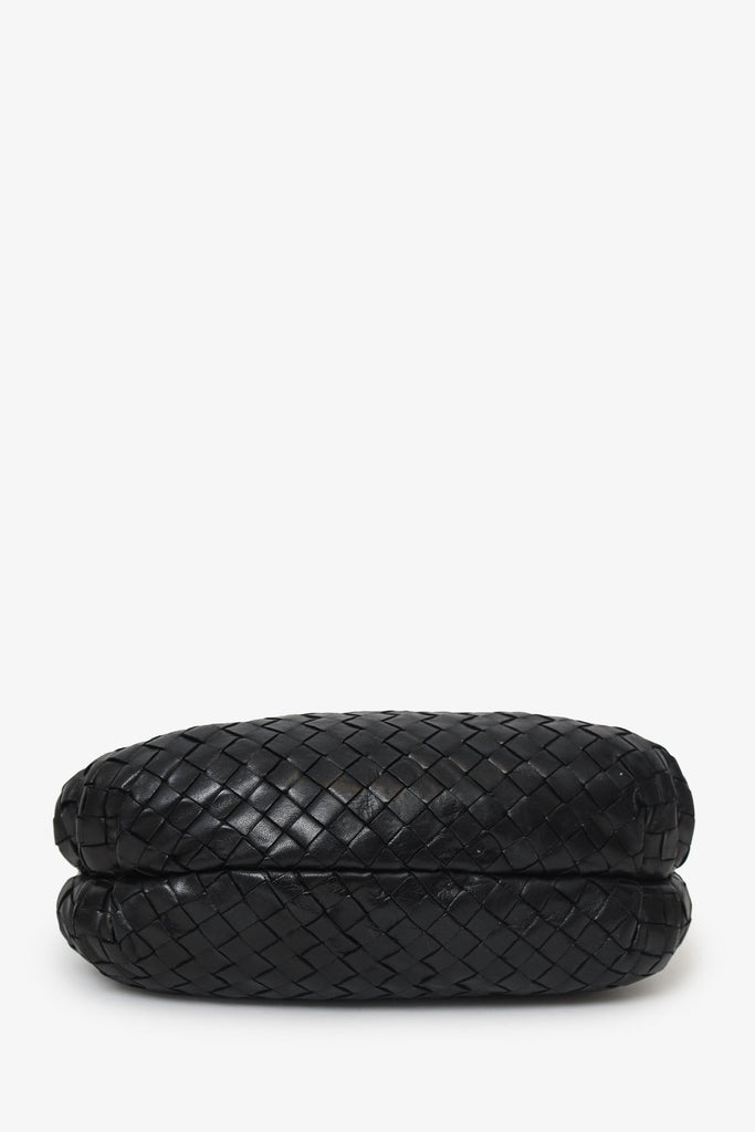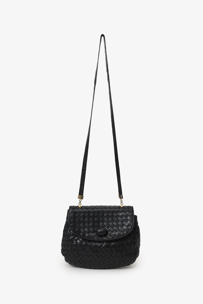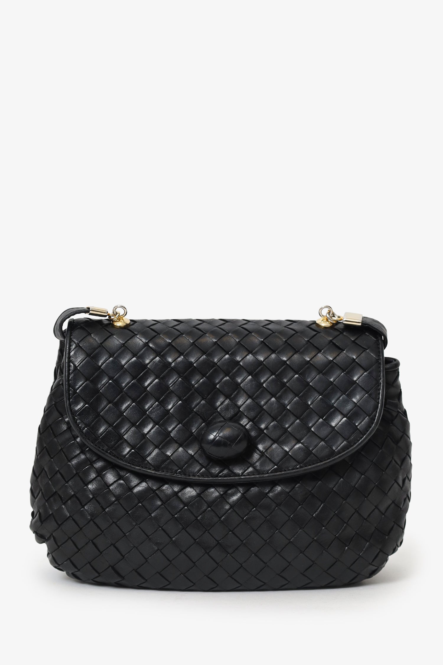 Bottega Venetta Black Intrecciato Crossbody Bag. Front fold-over flap with turn-lock closure. Crossbody strap. Suede-lined interior with single zip pocket. Gold-tone hardware. Tonal stitching.