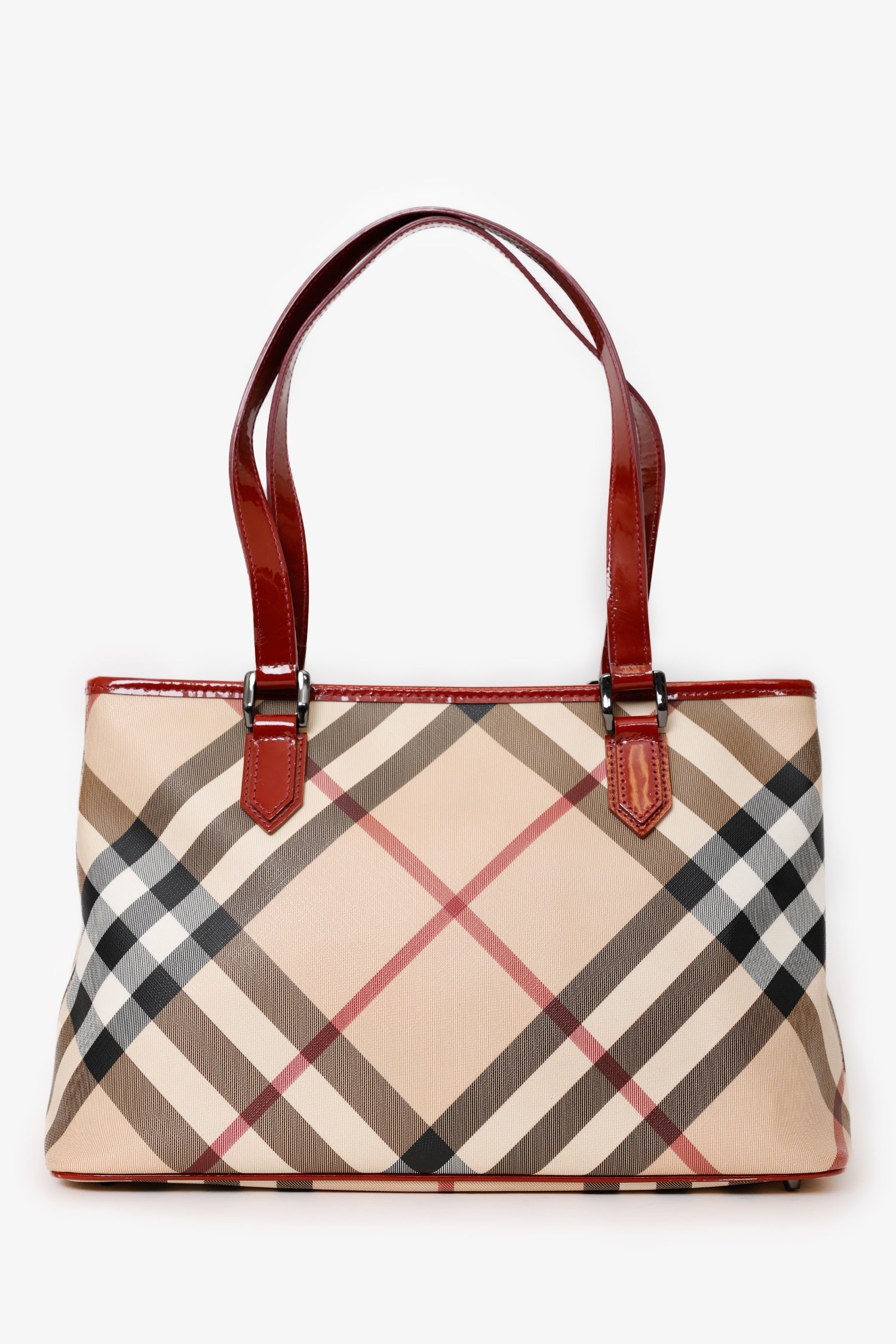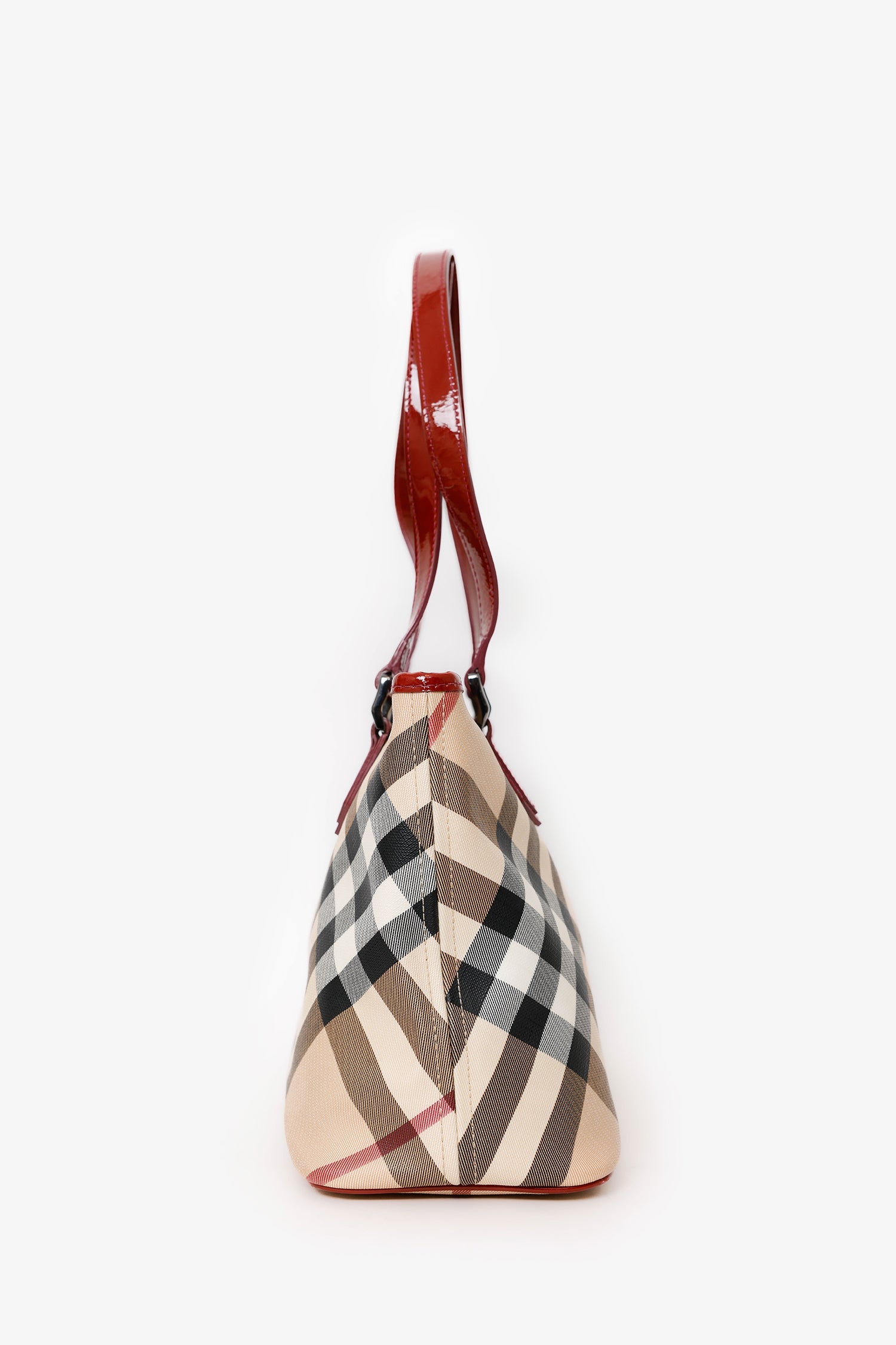 Burberry Beige/Red Coated Canvas Novacheck Top Handle Bag. Top zip closure. Twin top handles. Protective base studs. Lined interior. 3 interior pockets; 2 slip and 1 rear wall with zip closure. Gunmetal-tone hardware. Tonal stitching.