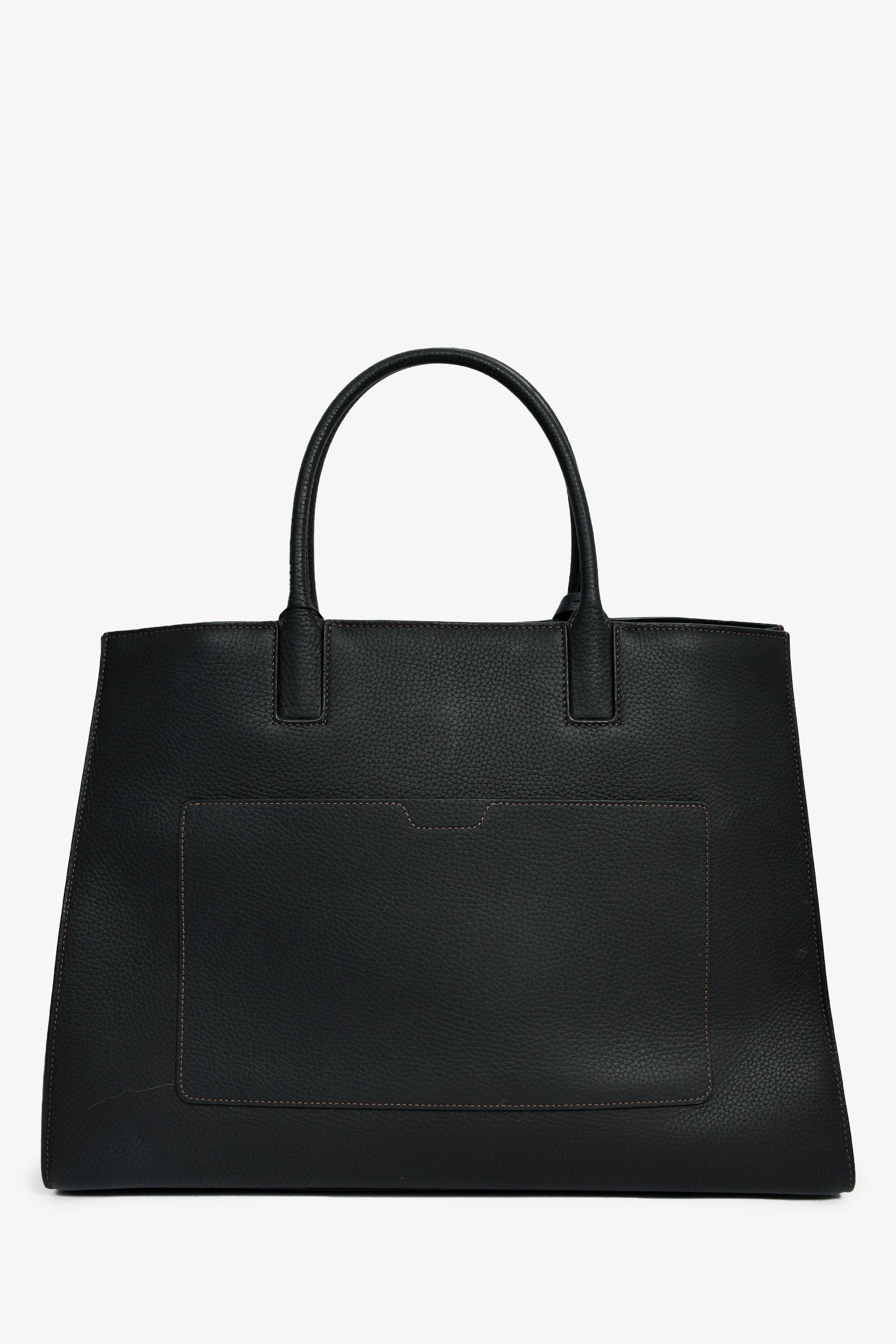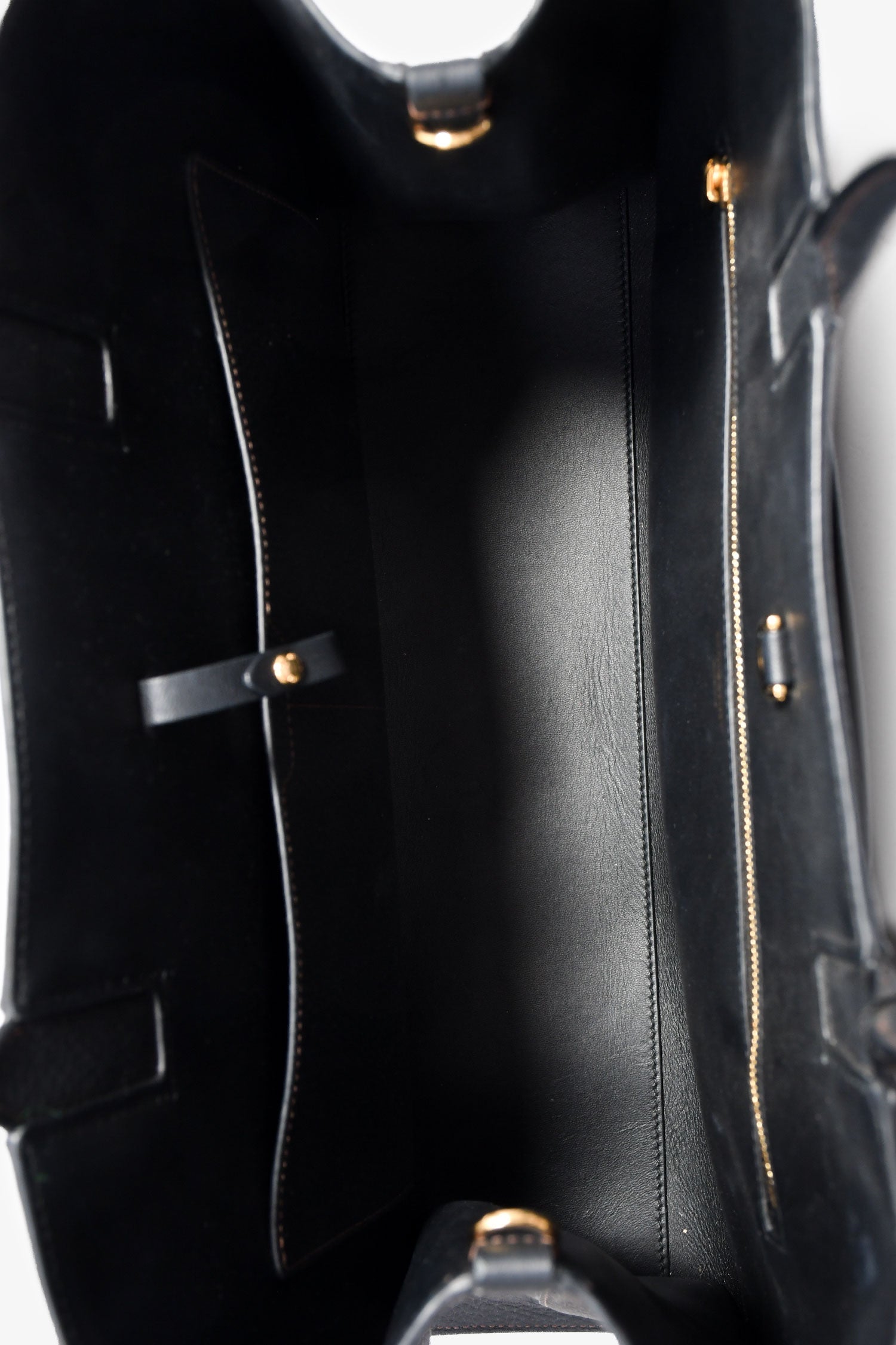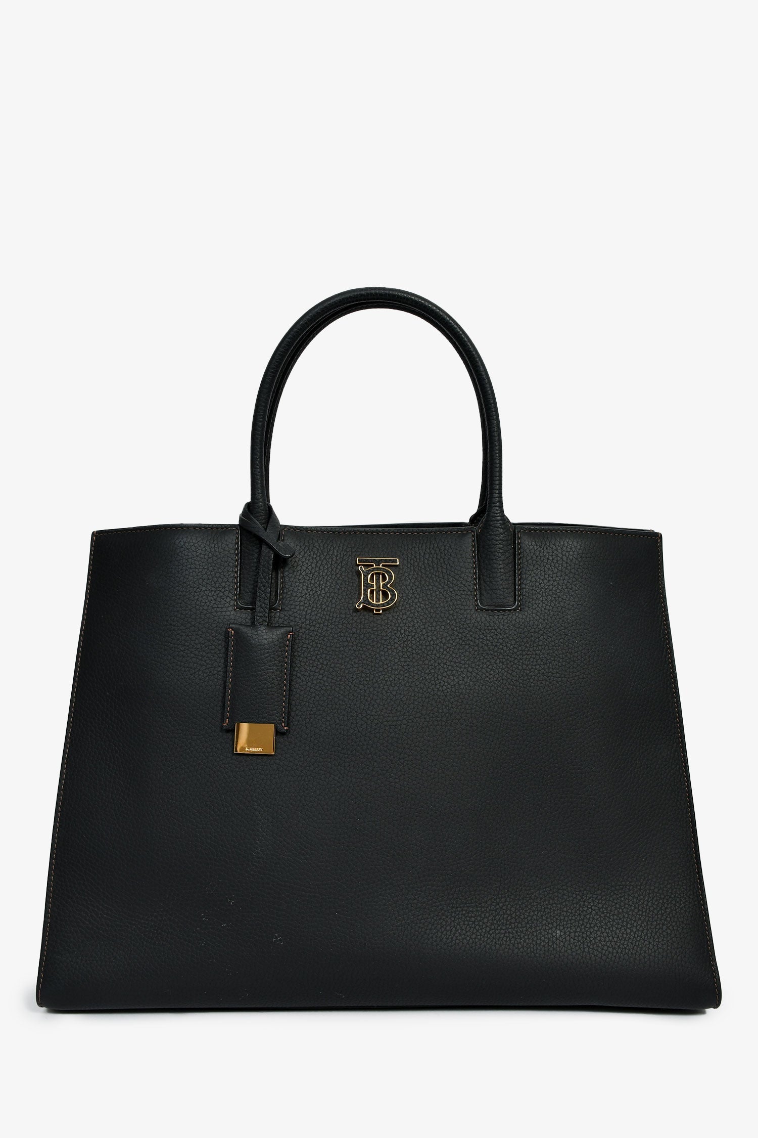 Burberry Black Leather 'Frances' Tote Bag. Open top with strap closure. Dual top handles. Protective base studs. Single exterior rear slip pocket. 3 interior wall pockets; 2 slip, 1 with zip closure. Detachable clochette. Gold-tone hardware. Tonal stitching.