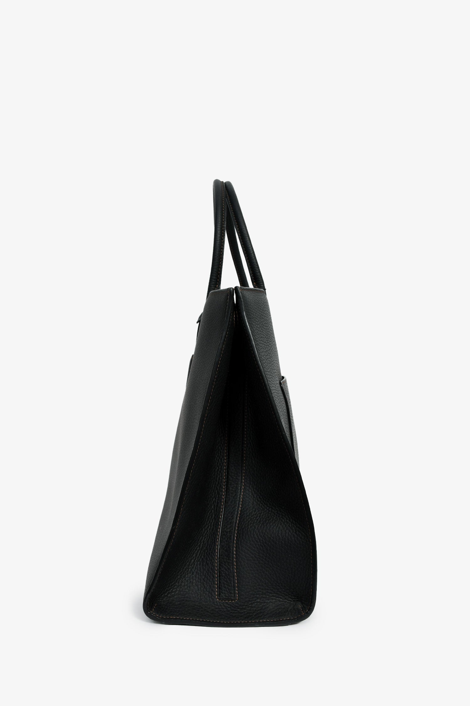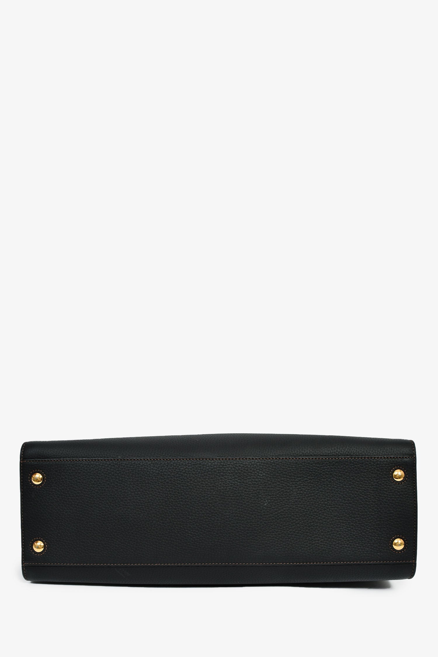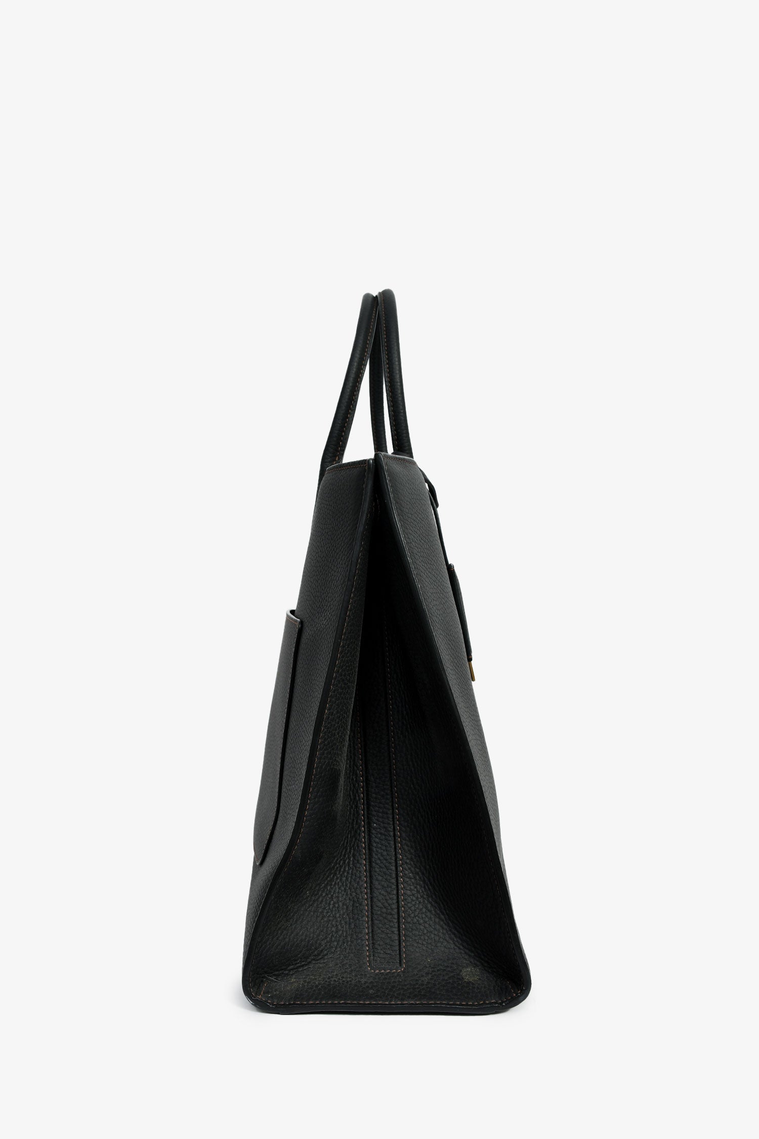 Burberry Black Leather 'Frances' Tote Bag. Open top with strap closure. Dual top handles. Protective base studs. Single exterior rear slip pocket. 3 interior wall pockets; 2 slip, 1 with zip closure. Detachable clochette. Gold-tone hardware. Tonal stitching.