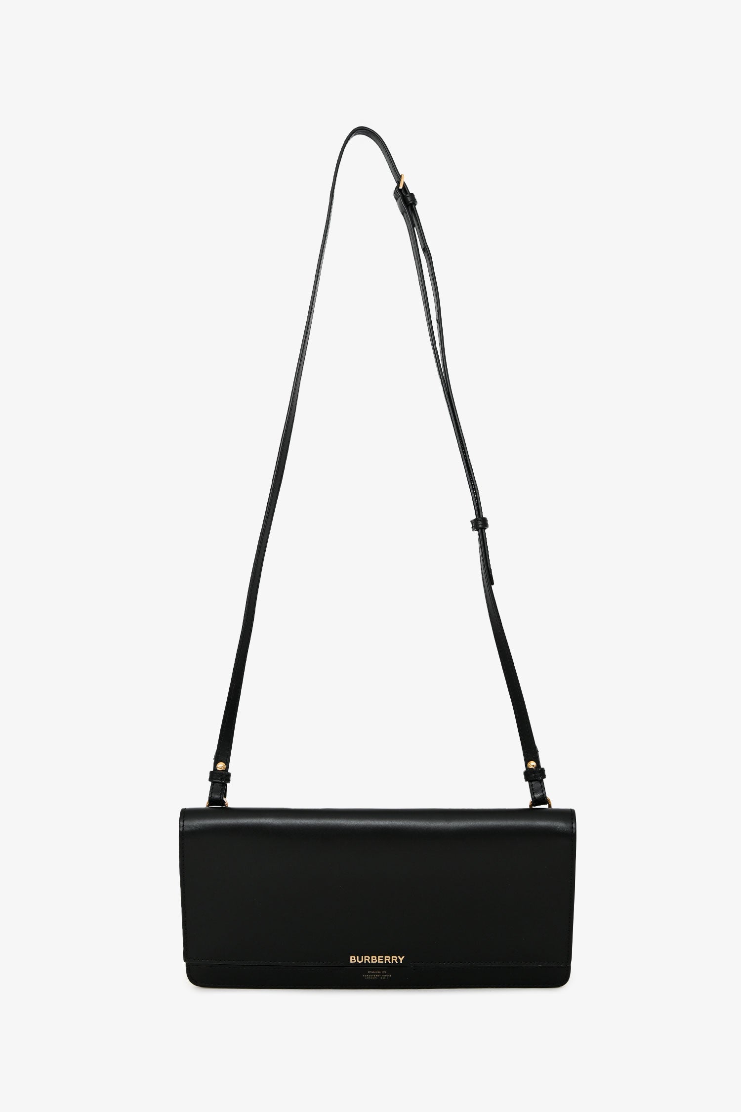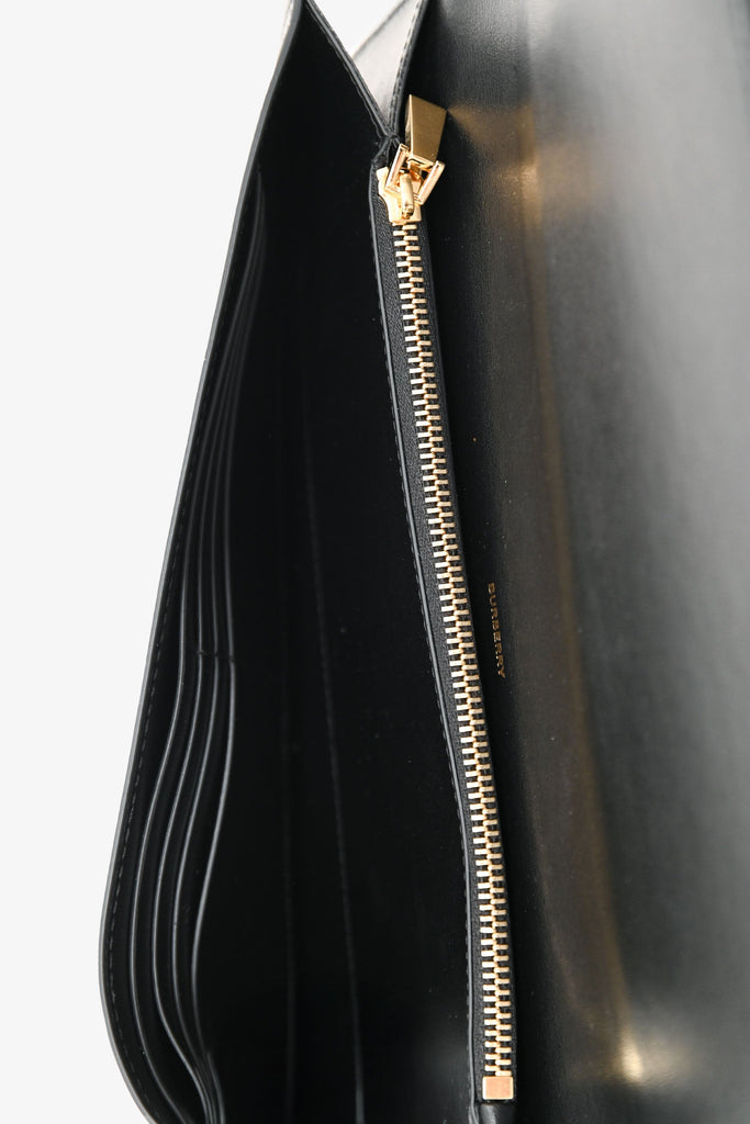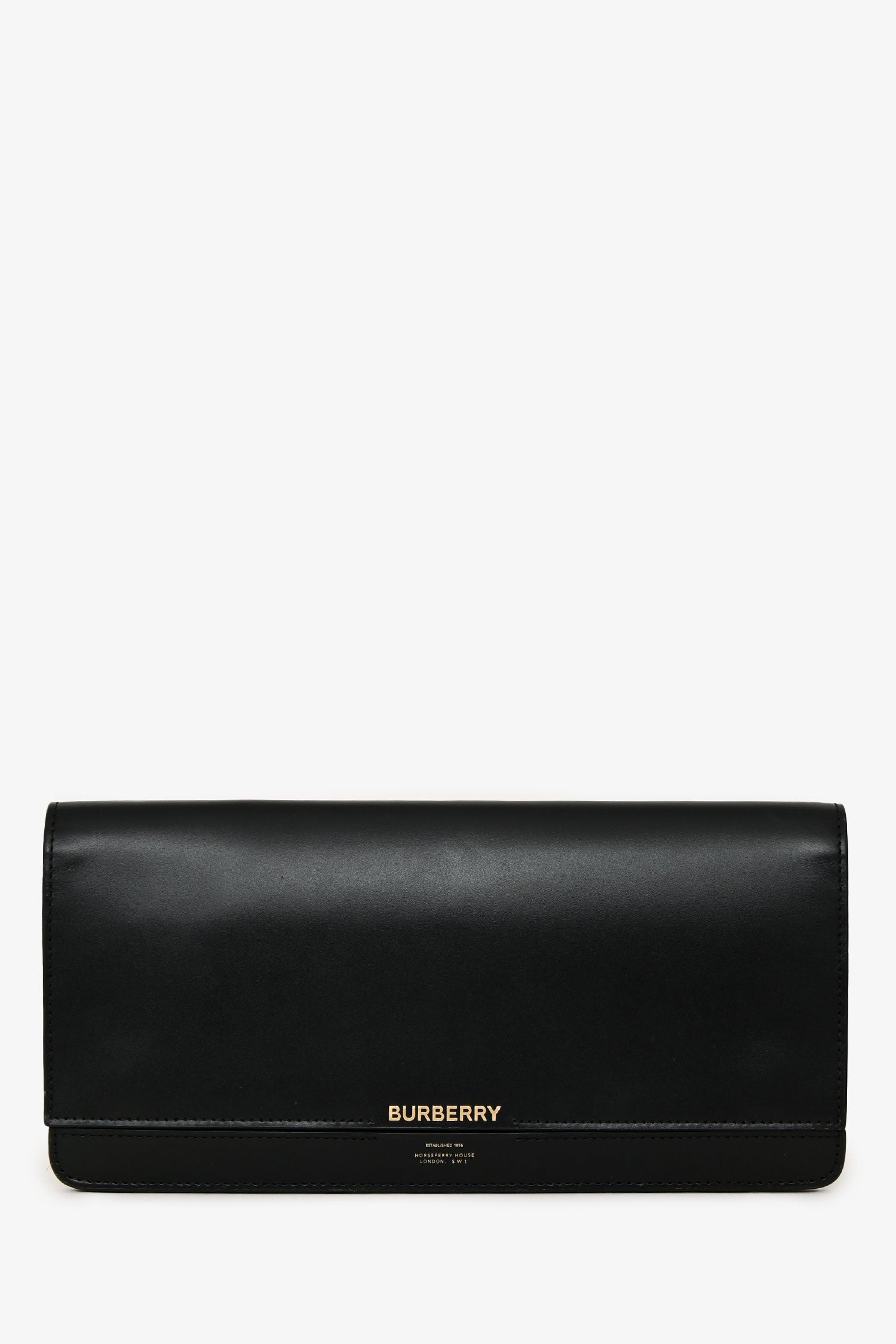 Burberry Black Leather Wallet Crossbody Bag. Front fold-over flap with concealed magnetic closures. 1 rear exterior slip pocket. 2 interior compartments with 3 pockets; 2 slips and 1 zip. 12 interior card slots. Gold-tone hardware. Tonal stitching.