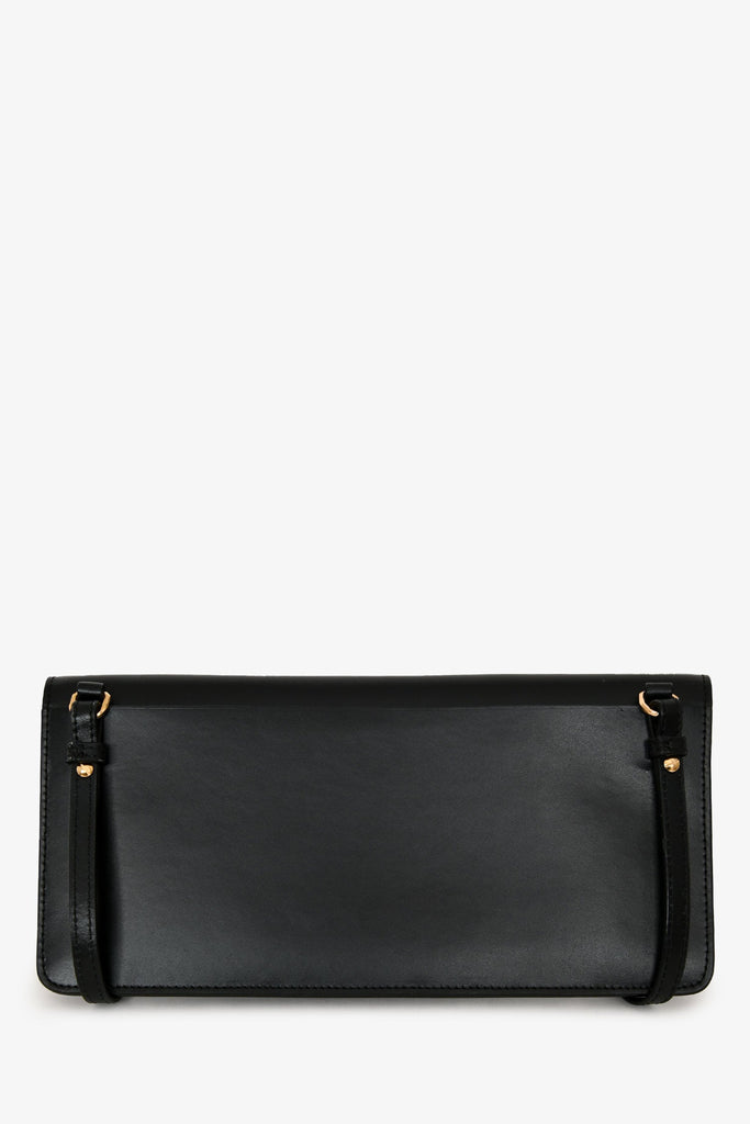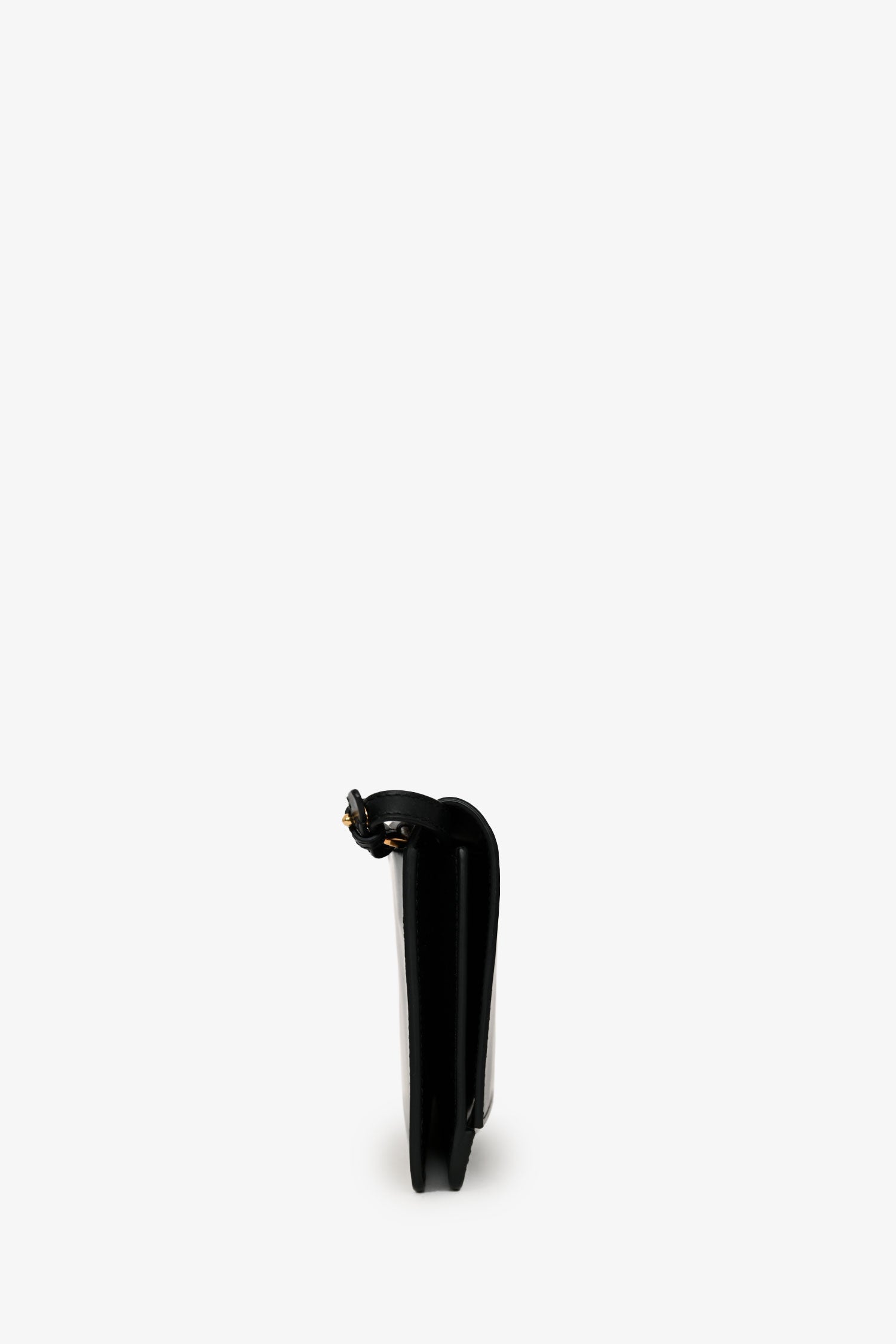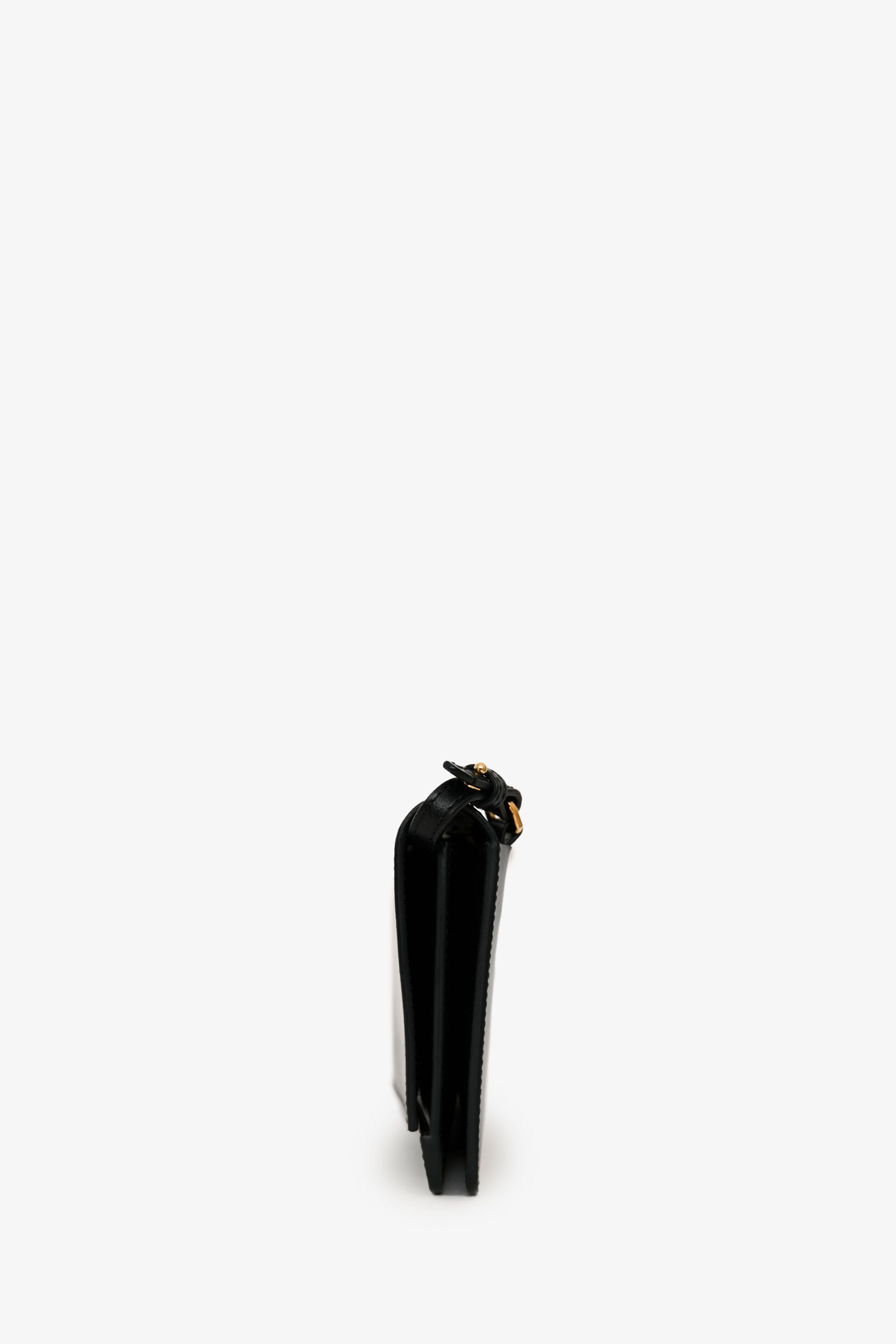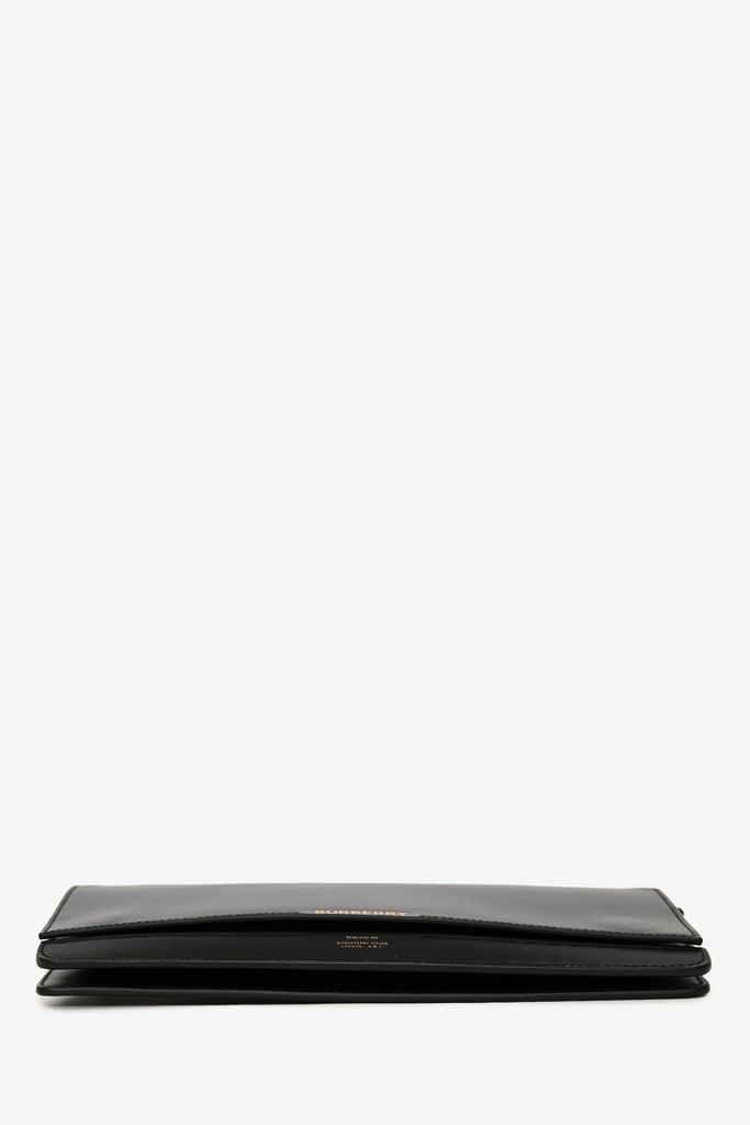 Burberry Black Leather Wallet Crossbody Bag. Front fold-over flap with concealed magnetic closures. 1 rear exterior slip pocket. 2 interior compartments with 3 pockets; 2 slips and 1 zip. 12 interior card slots. Gold-tone hardware. Tonal stitching.