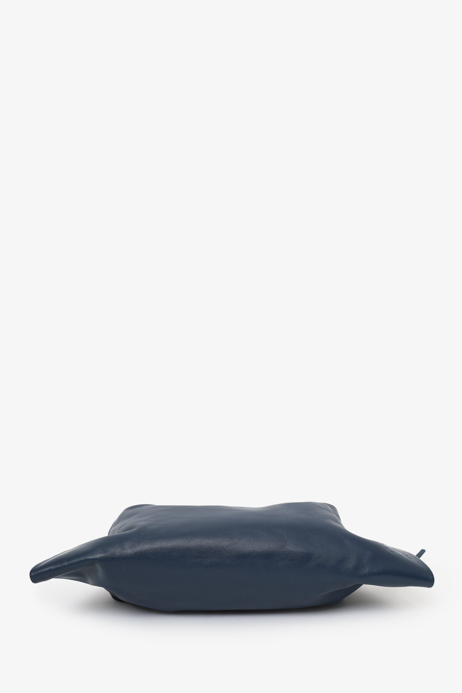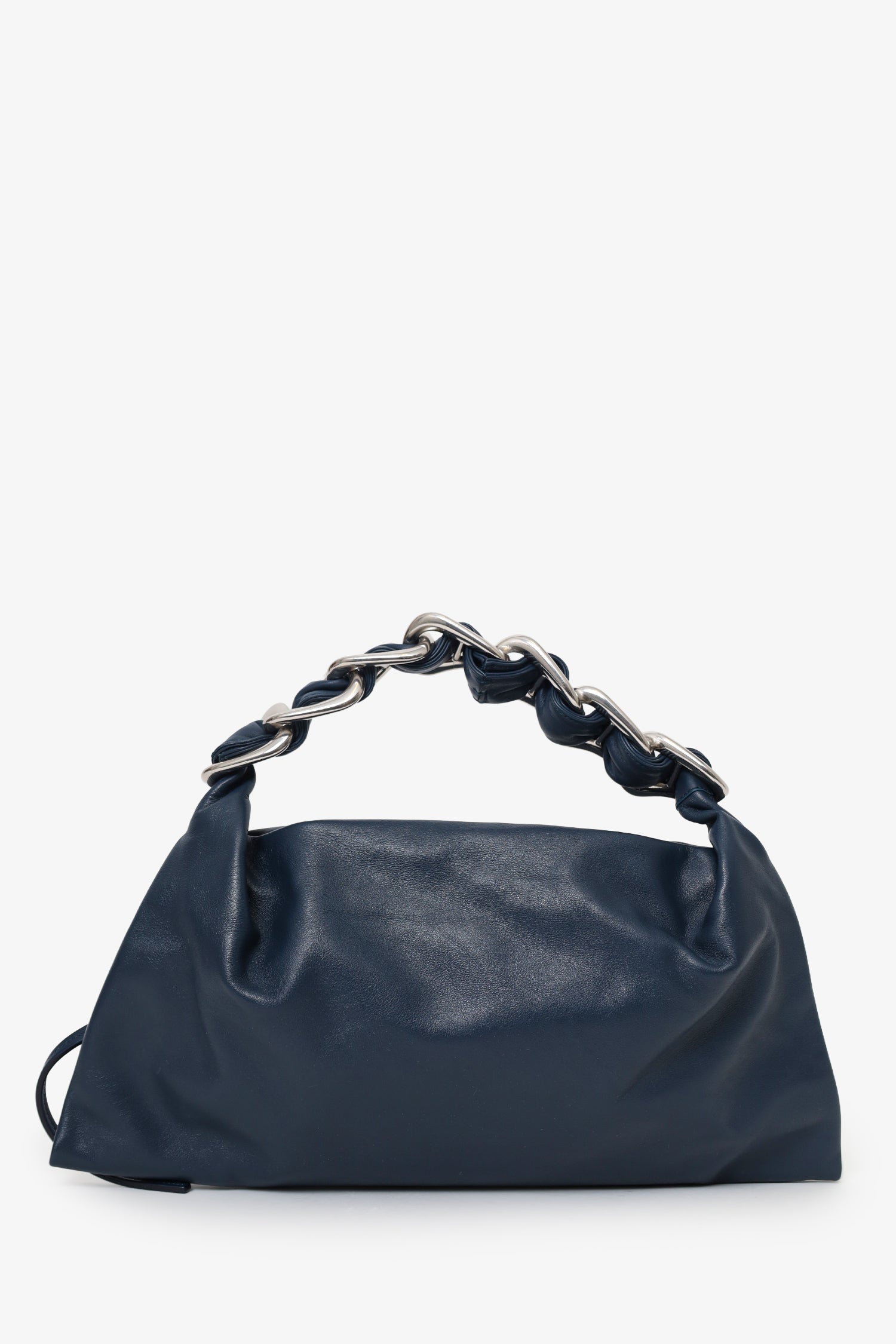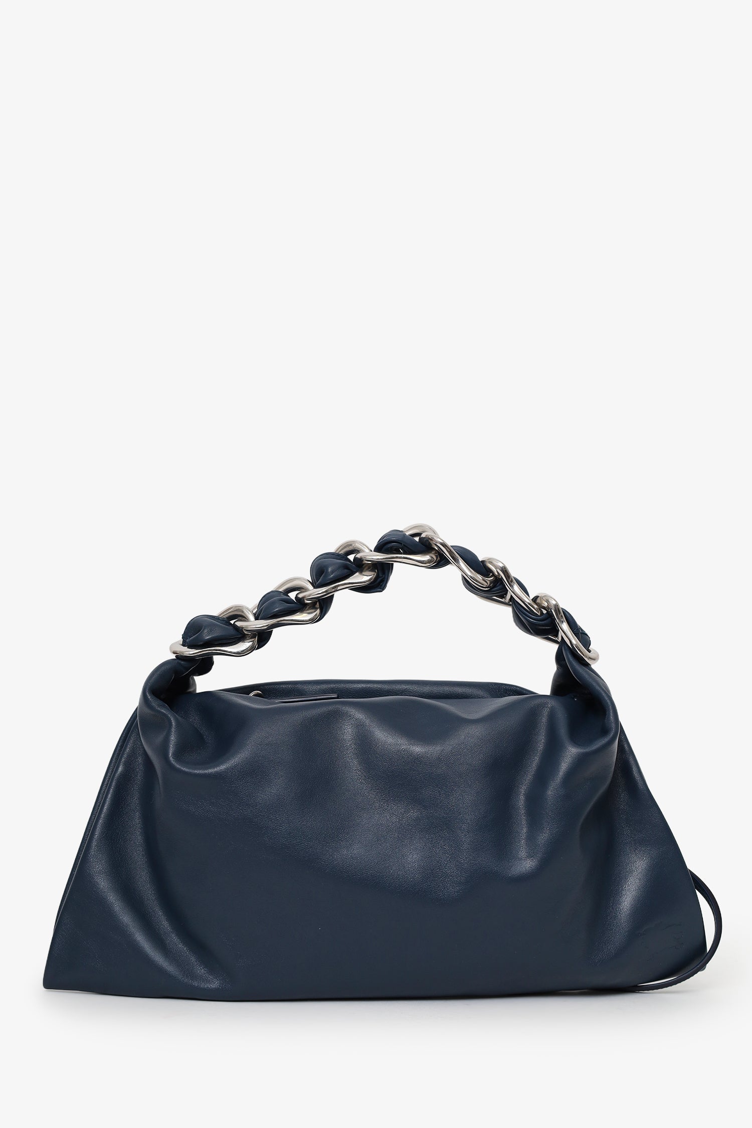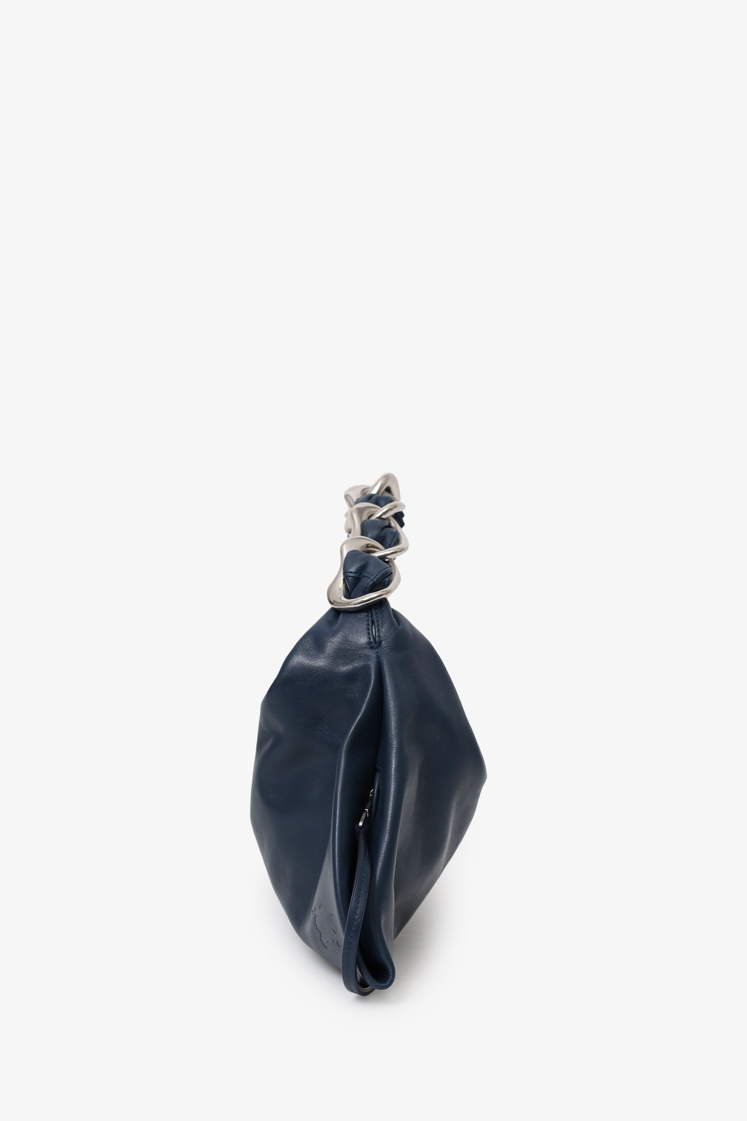 Burberry Navy Leather 'Swan' Small Shoulder Bag. Top zip-up closure. Chain link and leather shoulder strap. Side zip-up closure. Leather-lined interior with single zip-up pocket. Silver-tone hardware. Tonal stitching.