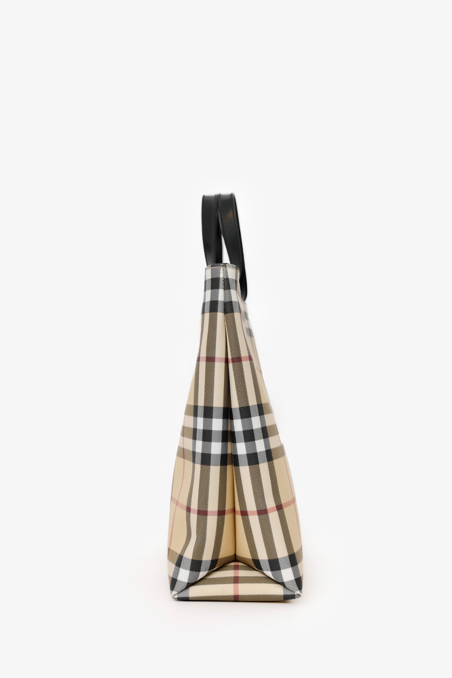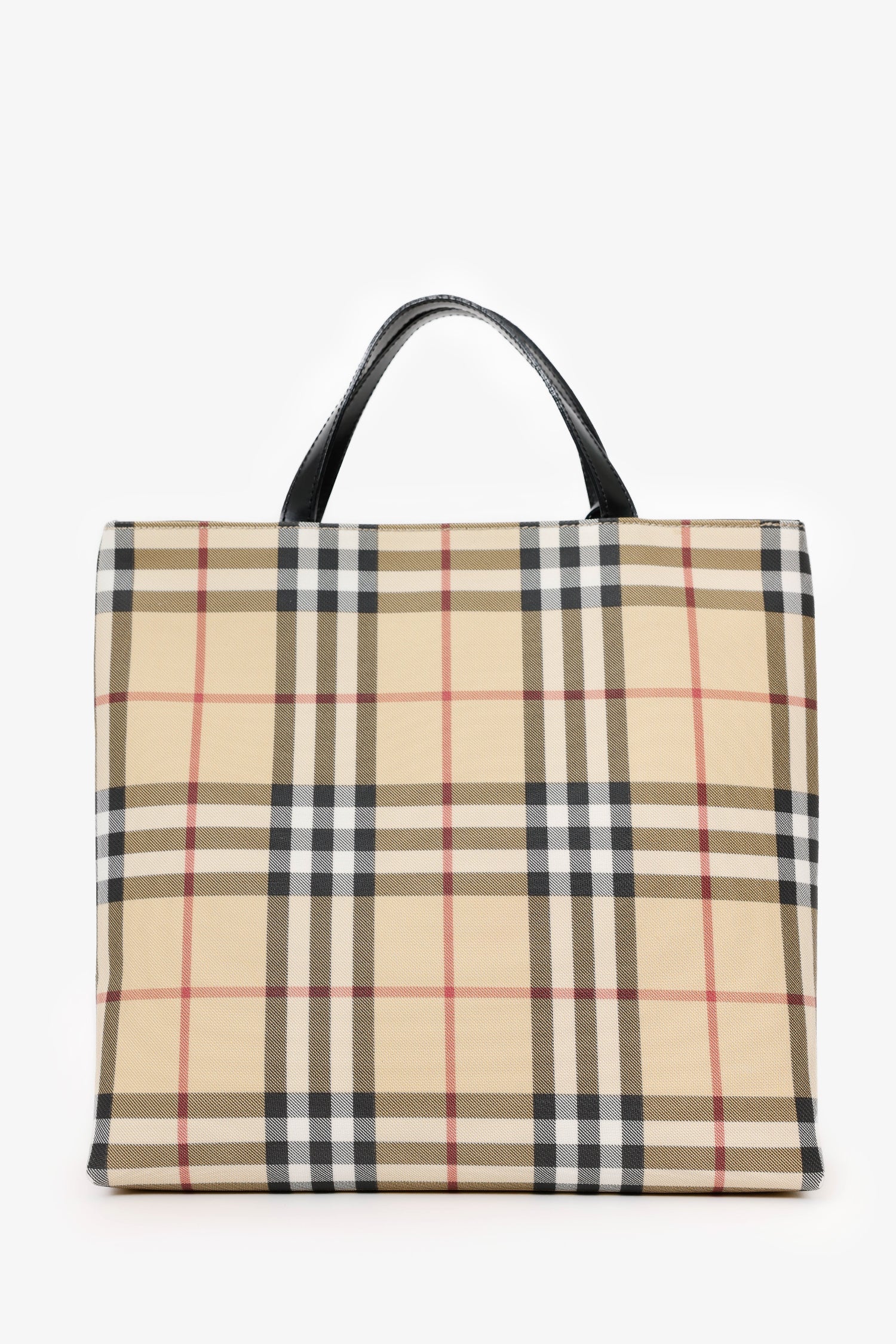 Burberry Nova Check Top Handle Tote. Top interior snap-button closure. Twin leather top handles. Lined interior. Single interior zip pocket. Silver-tone hardware. Tonal stitching.