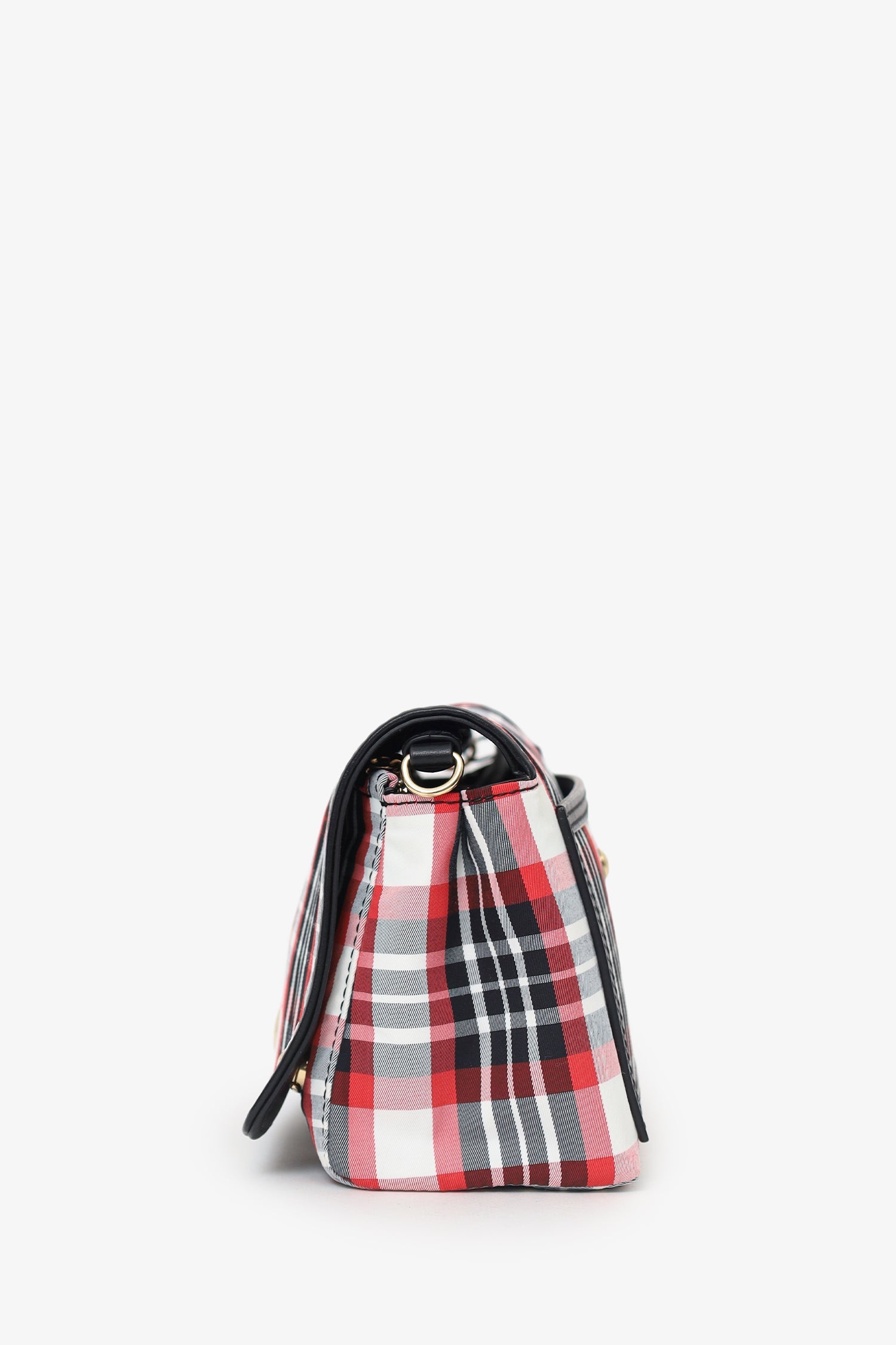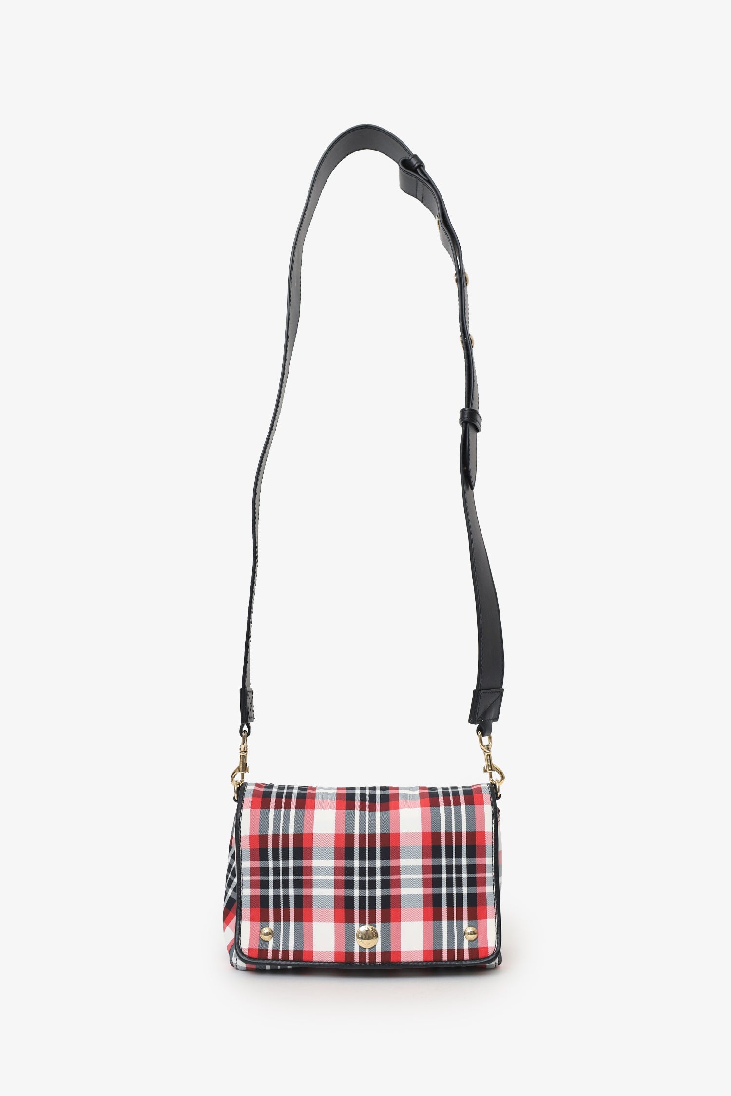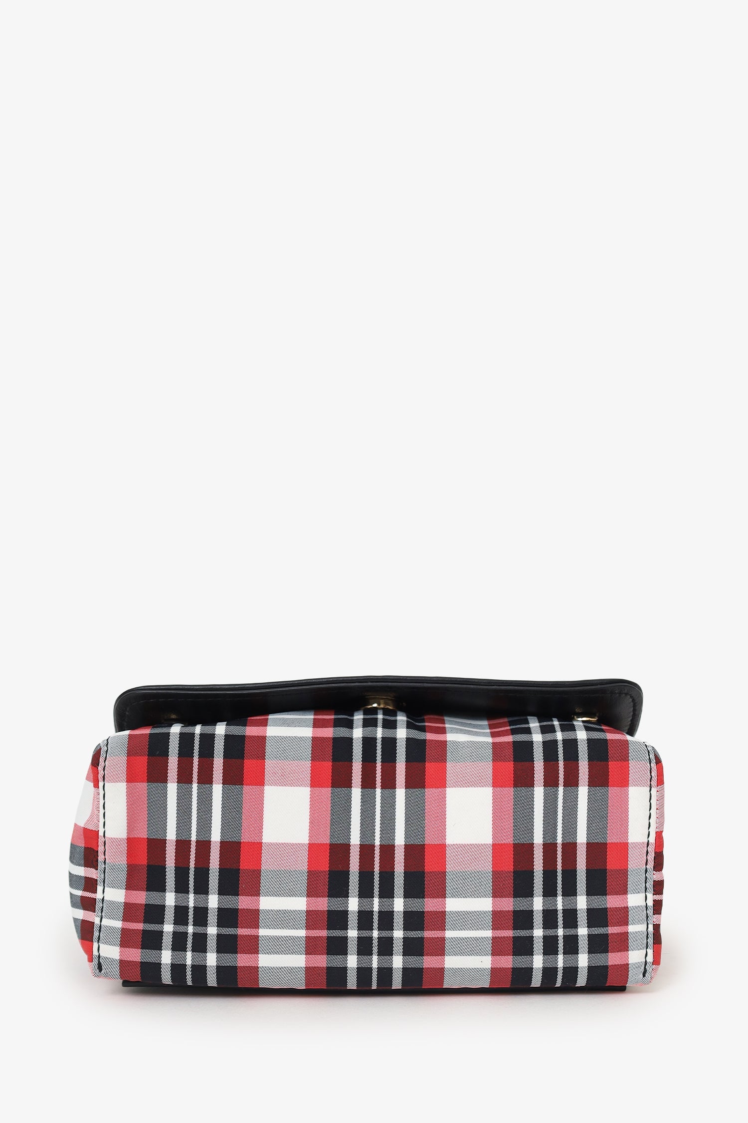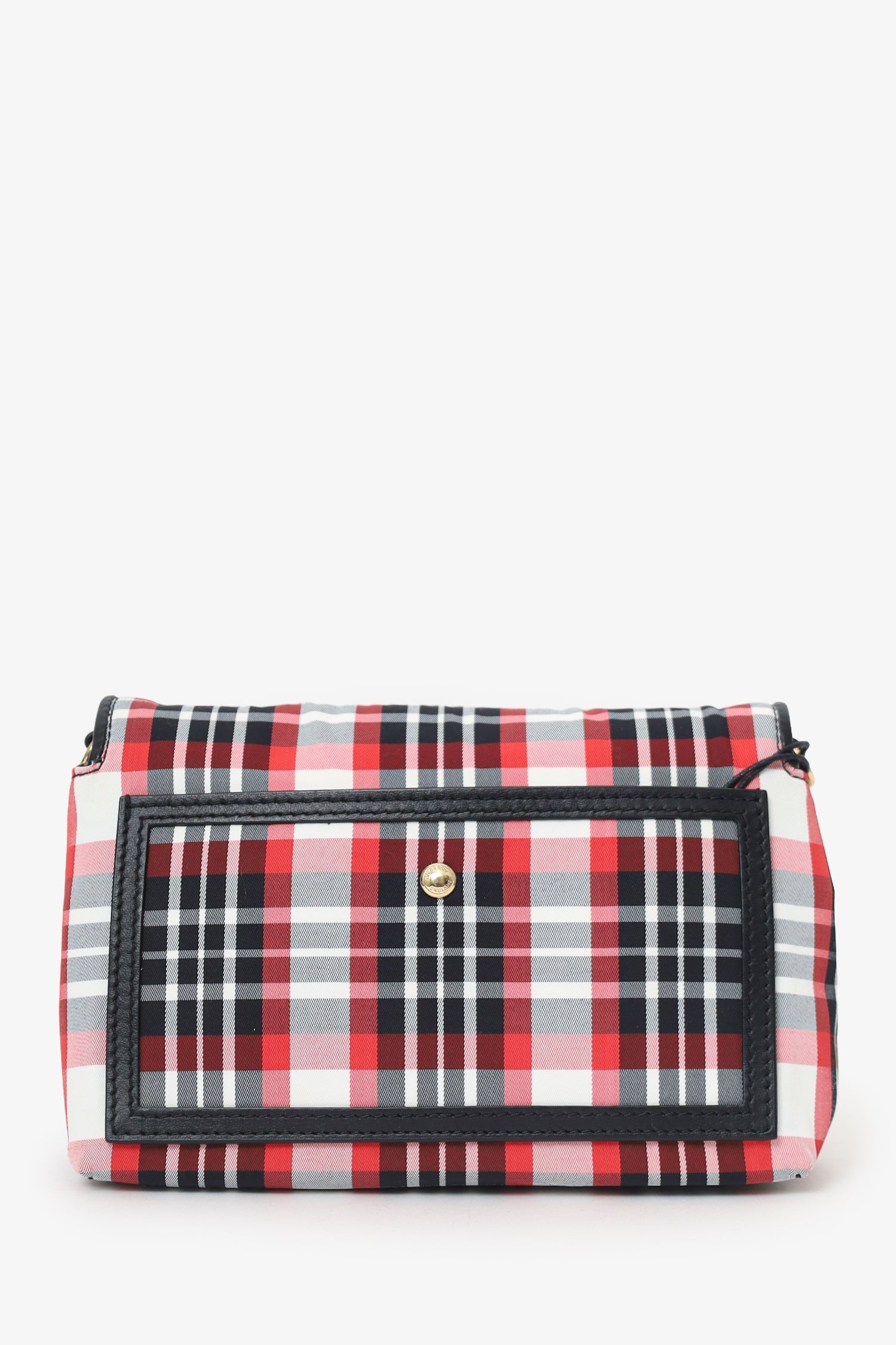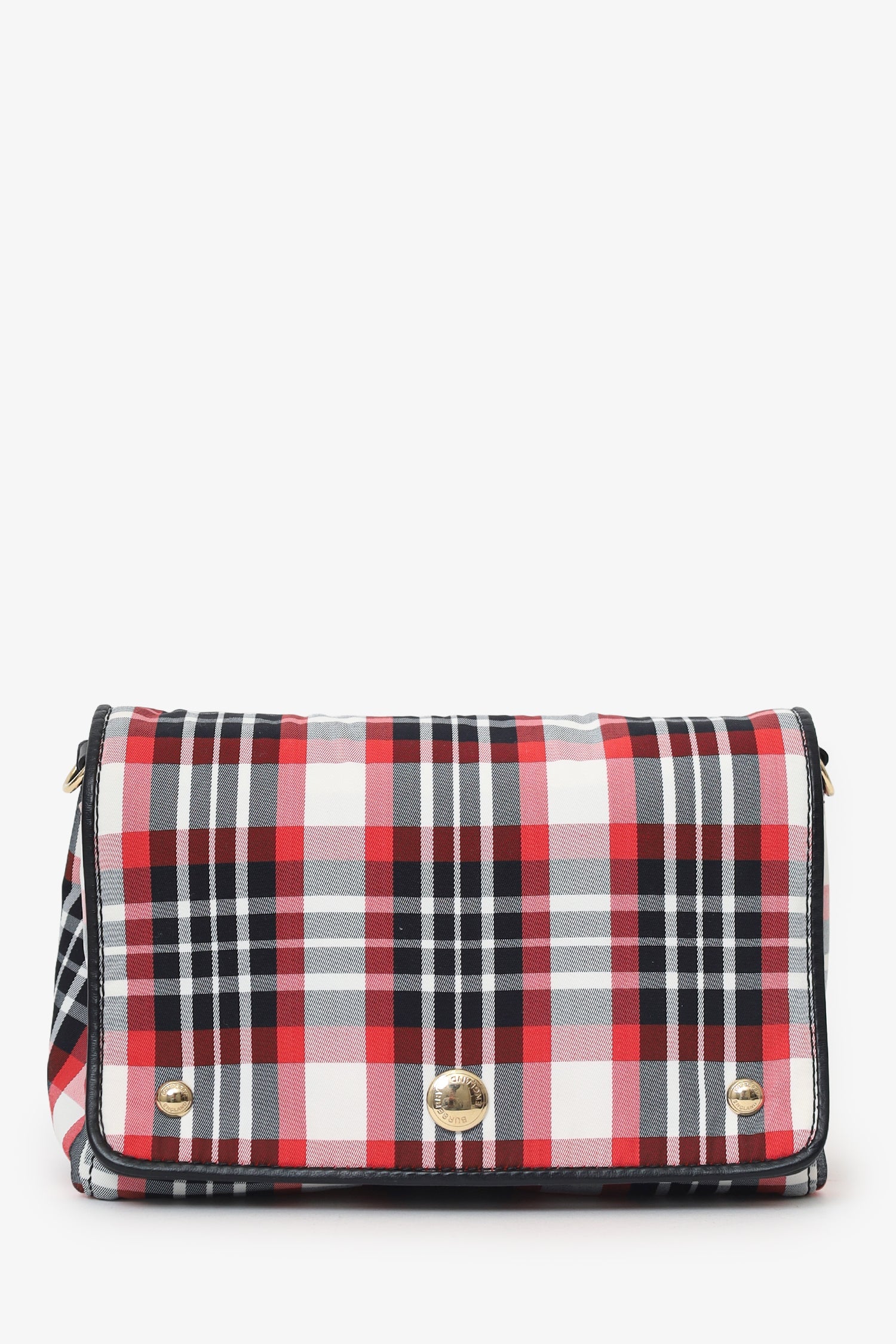 Burberry Red Hackberry Tartan Nylon Crossbody Bag. Front-fold-over-flap with snap-button-up closure. Adjustable and removable leather crossbody strap with clasp closure. Single rear snap button-up pocket. Leather-lined interior with 5 pockets; 1 front zip, 3 rear card slots, and 1 rear slip. Gold-tone hardware. Tonal stitching.