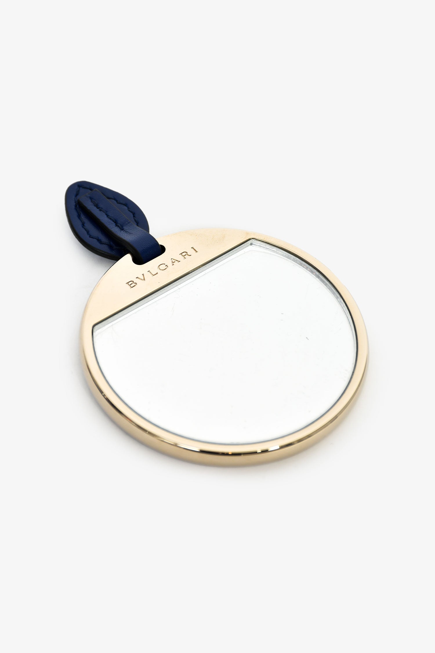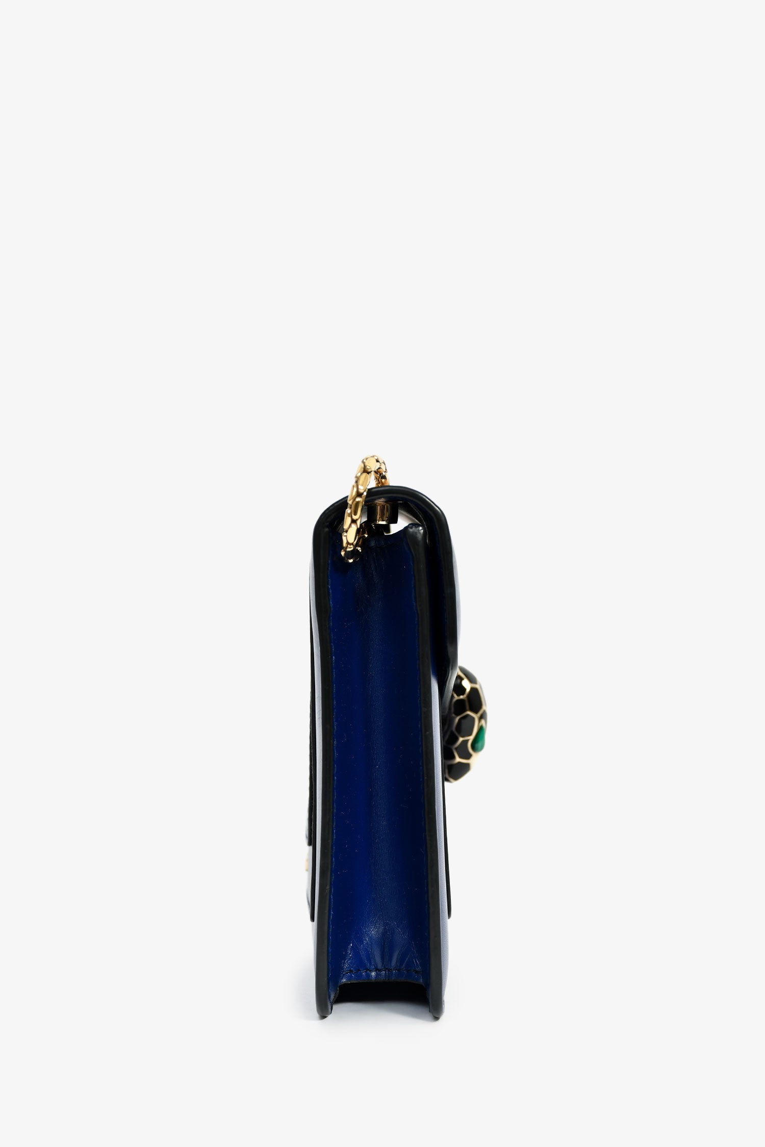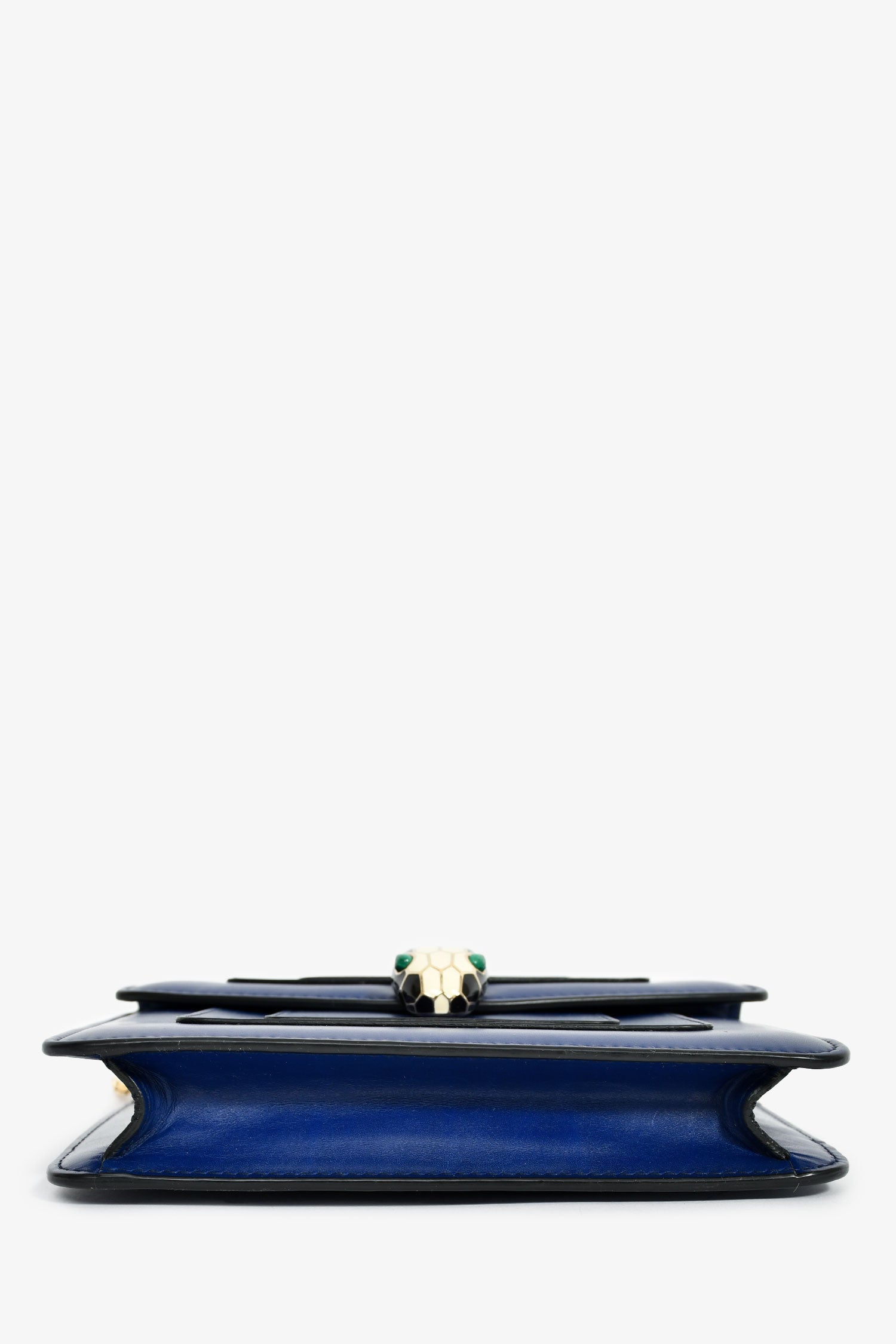 Bvlgari Blue Leather Serpenti Forever Small Crossbody Bag. Front fold-over flap with a snap button closure. Chain-link crossbody strap. Textile lined interior with single slip pocket. Gold and silver-tone hardware. Tonal stitching.