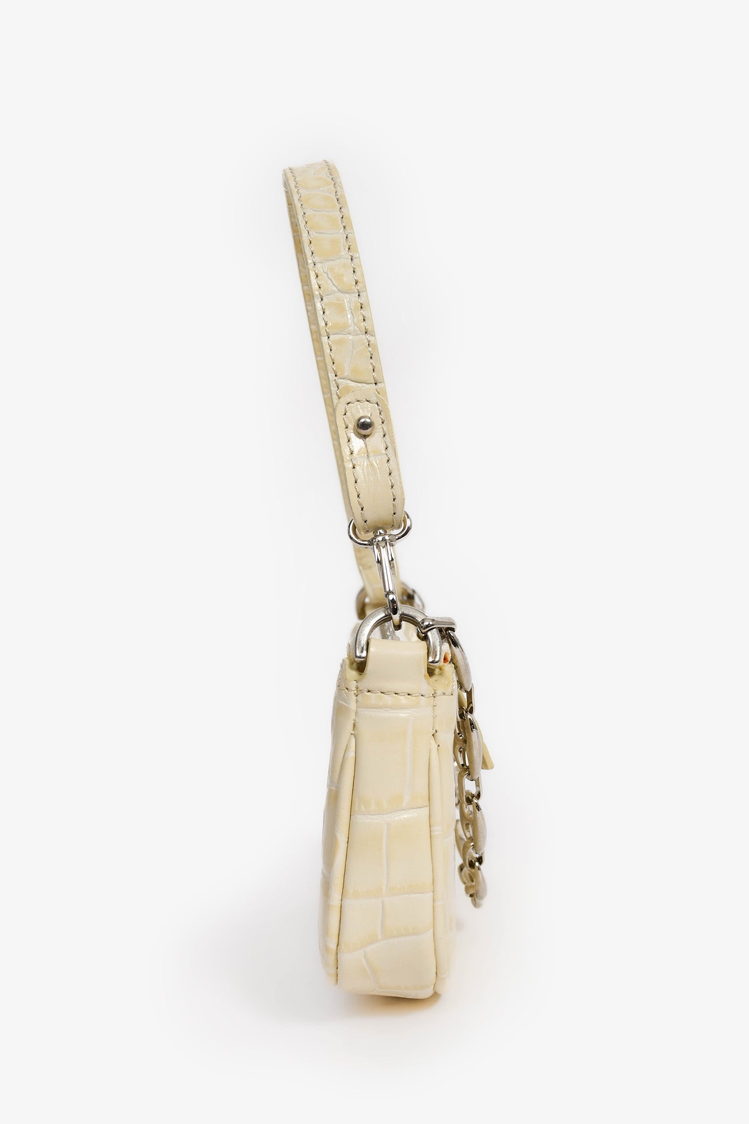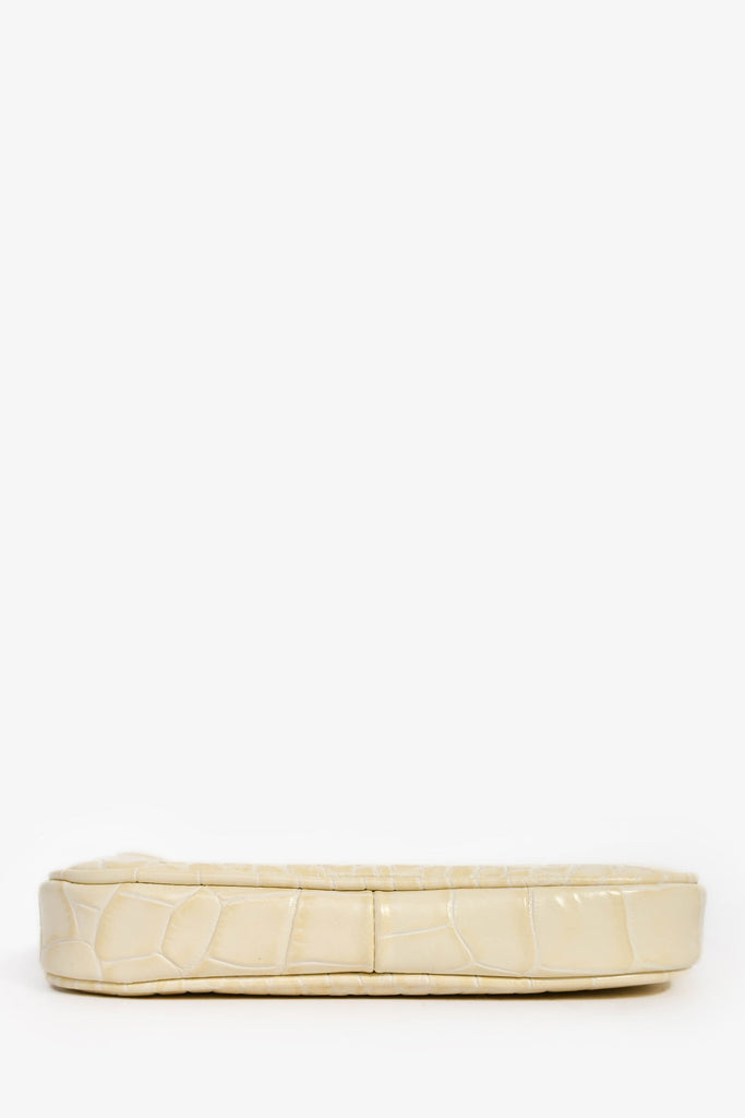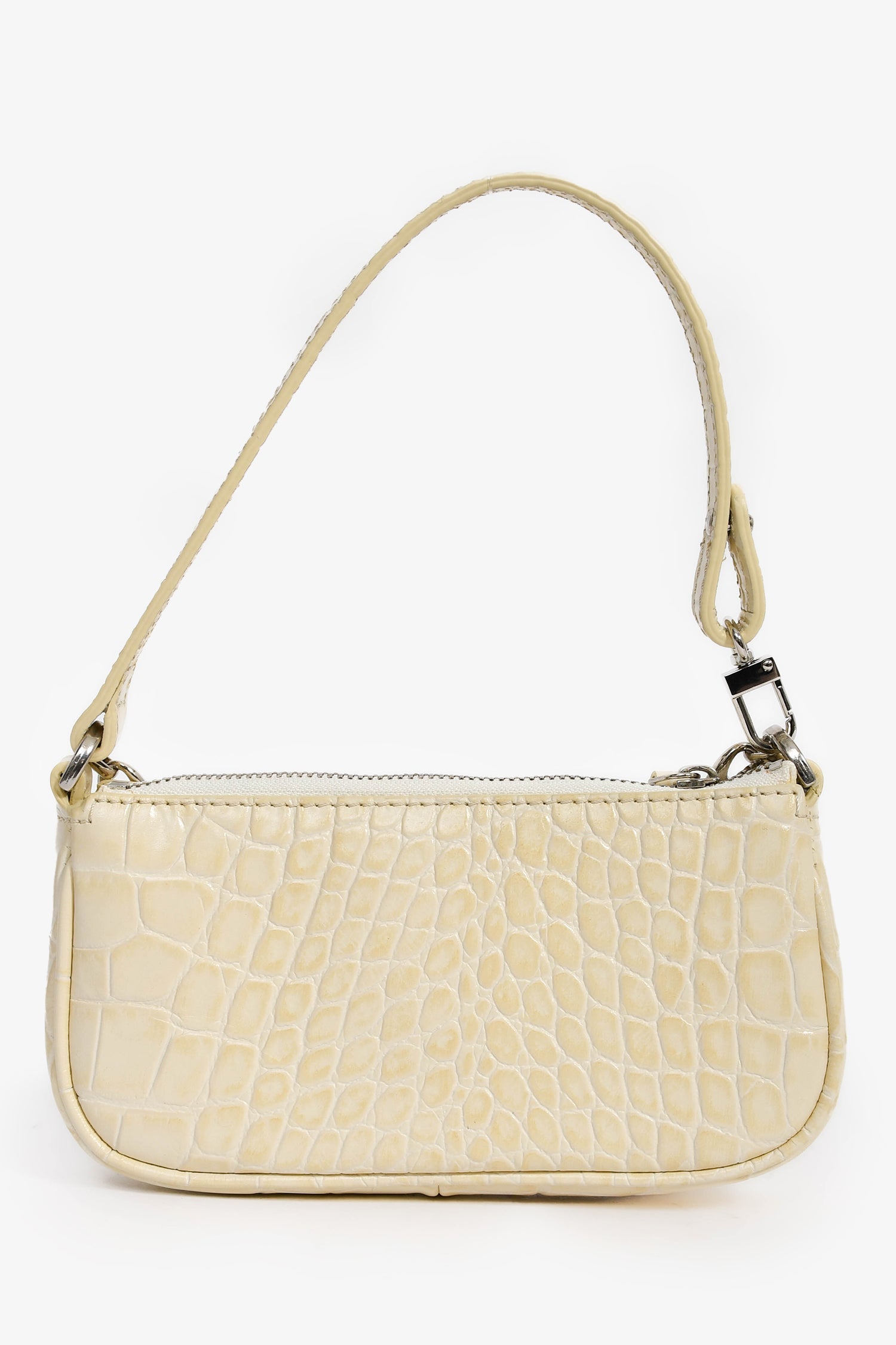 By Far Cream Croc Embossed Mini Rachel Bag. Single shoulder strap. Chain-link strap. Top zip closure. Canvas-lined interior. Silver-tone hardware. Tonal stitching.