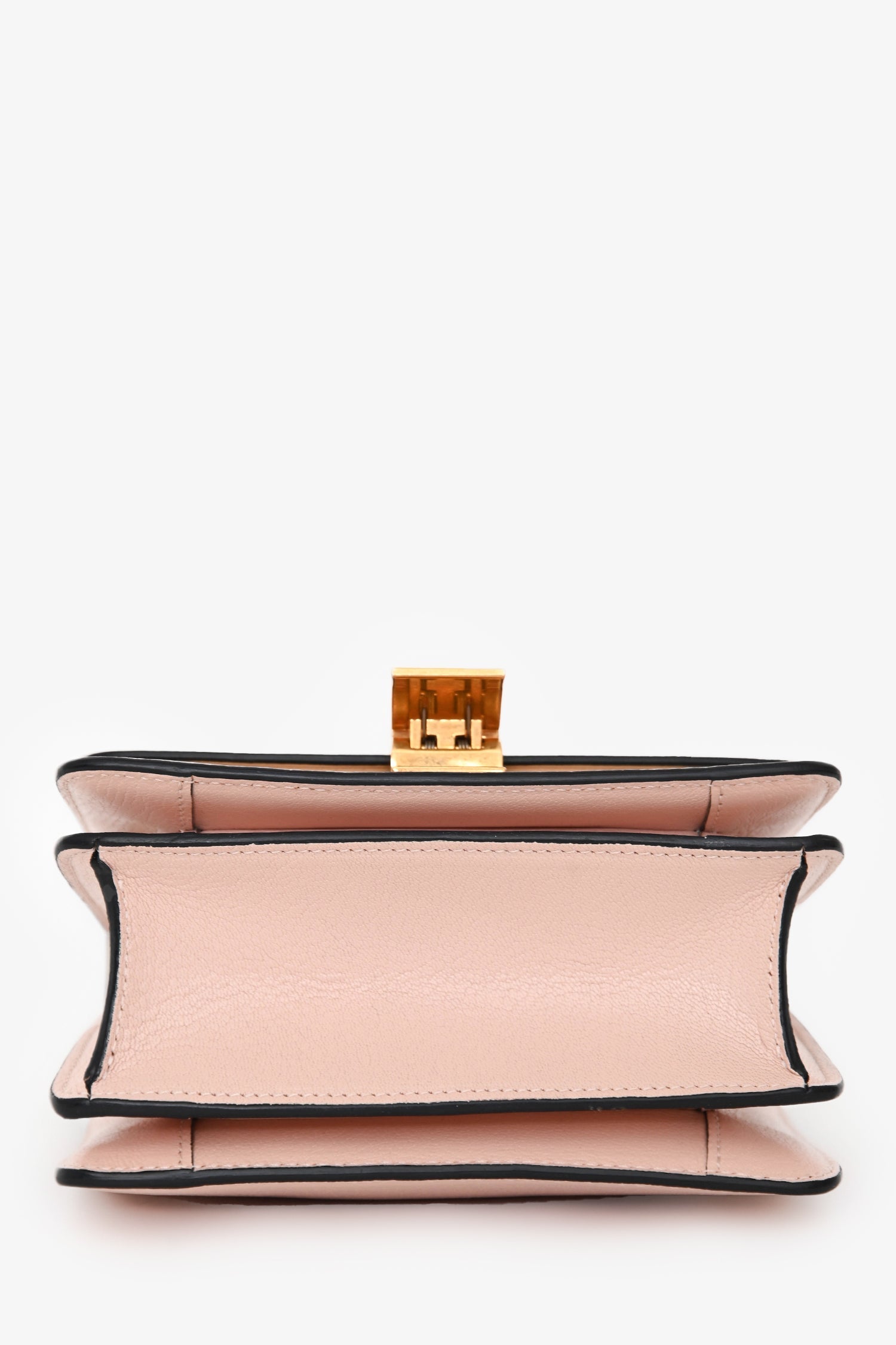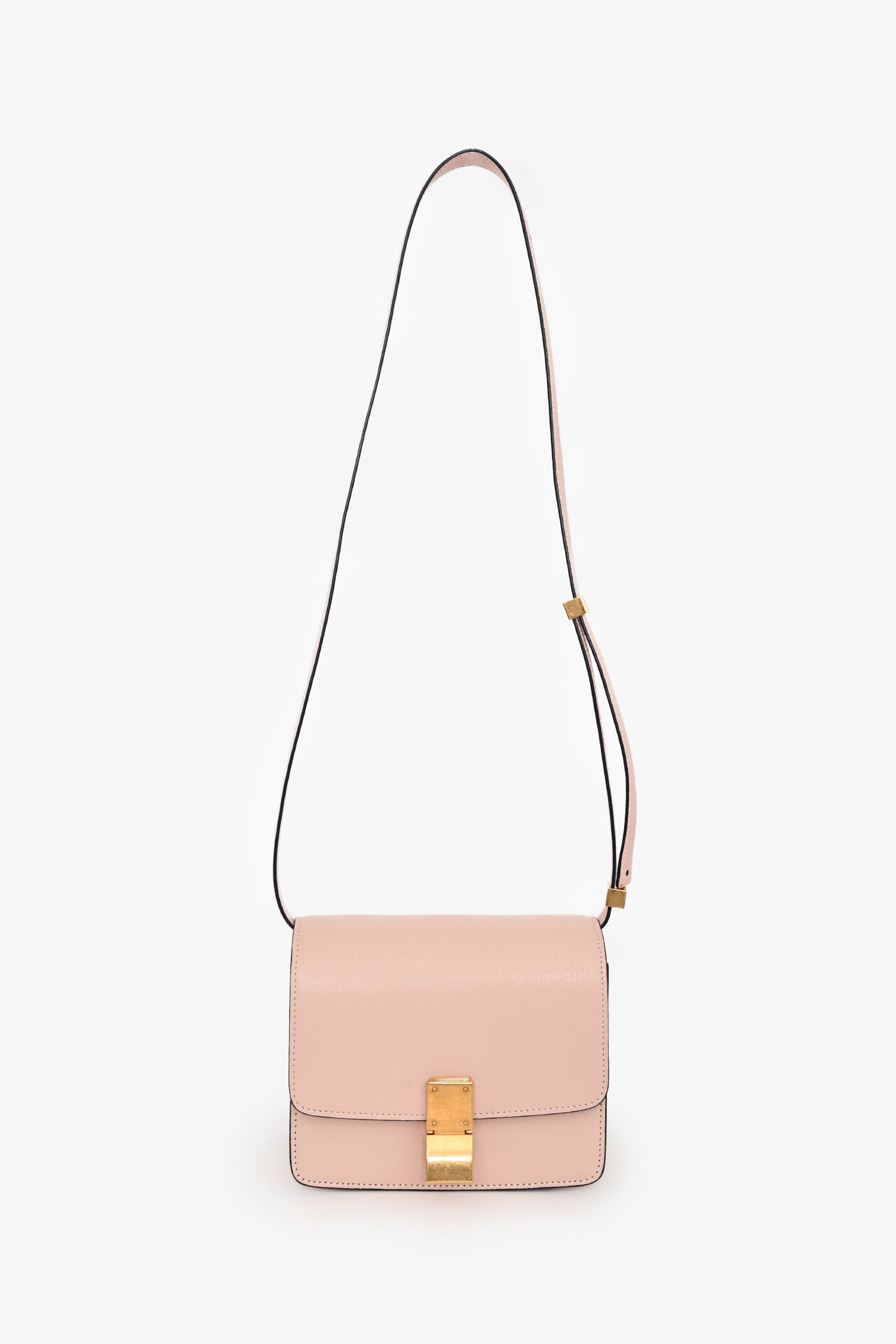 Celine 2016 Pink Leather Small Box Crossbody. Front flap with push-lock closure. Structured box silhouette. Adjustable leather shoulder strap. Leather-lined interior with three compartments and one zipped pocket. Gold-tone hardware. Tonal stitching.
