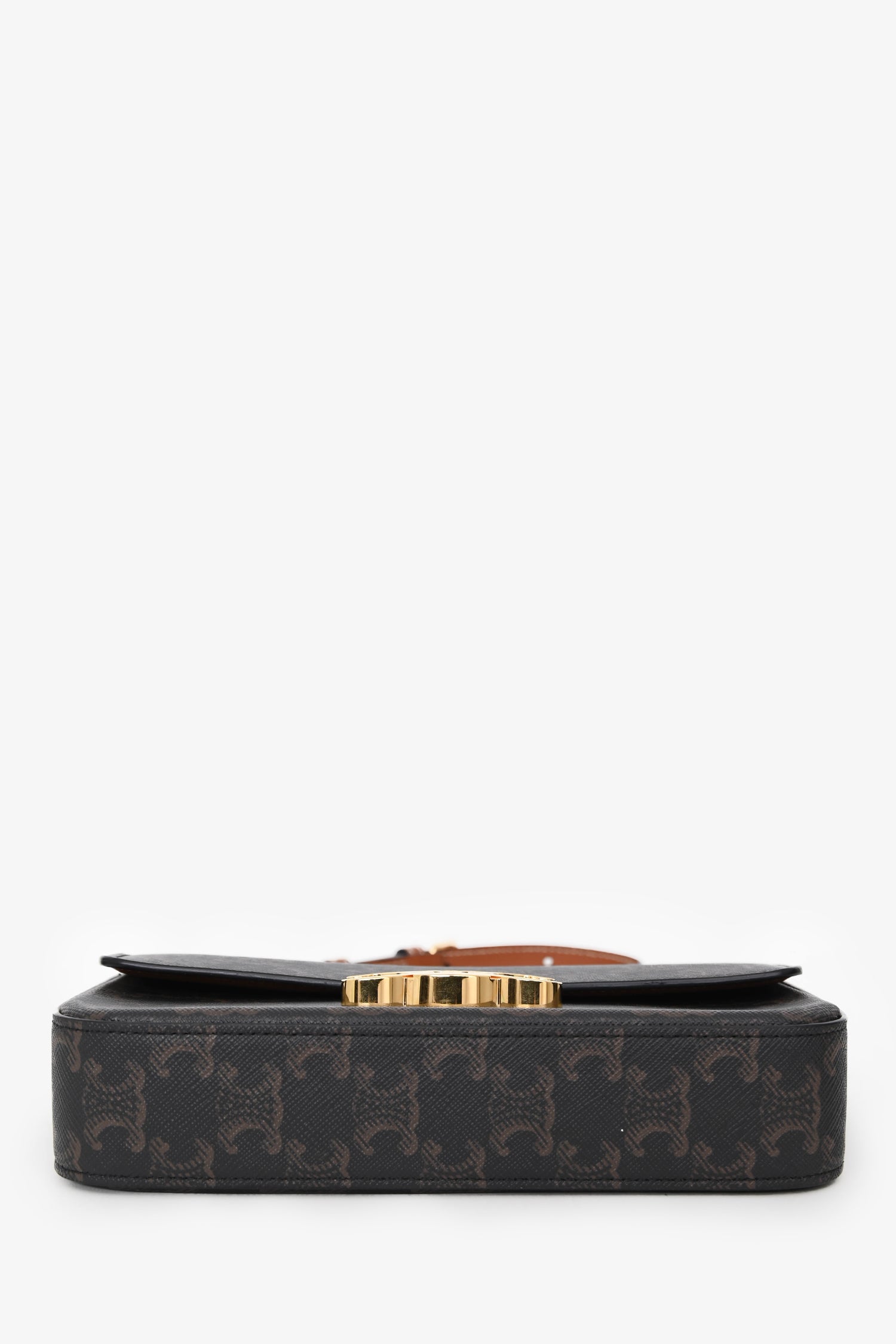 Celine 2021 Brown Canvas/Leather Triomphe Claude Shoulder Bag. Fold-over flap with a push-lock closure. Adjustable shoulder strap. Lined leather interior with a 1 compartment. Gold-tone hardware. Tonal and contrast stitching.