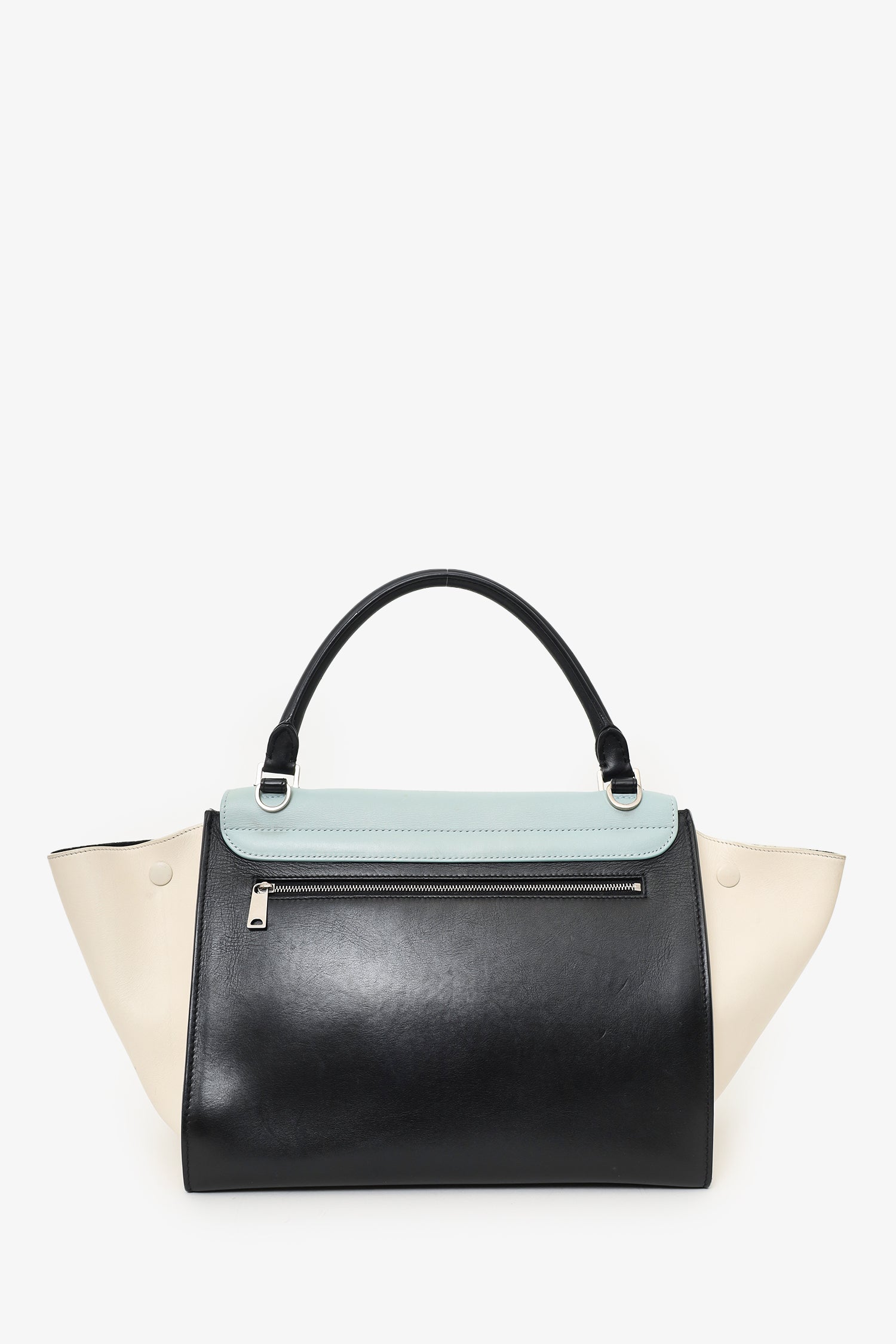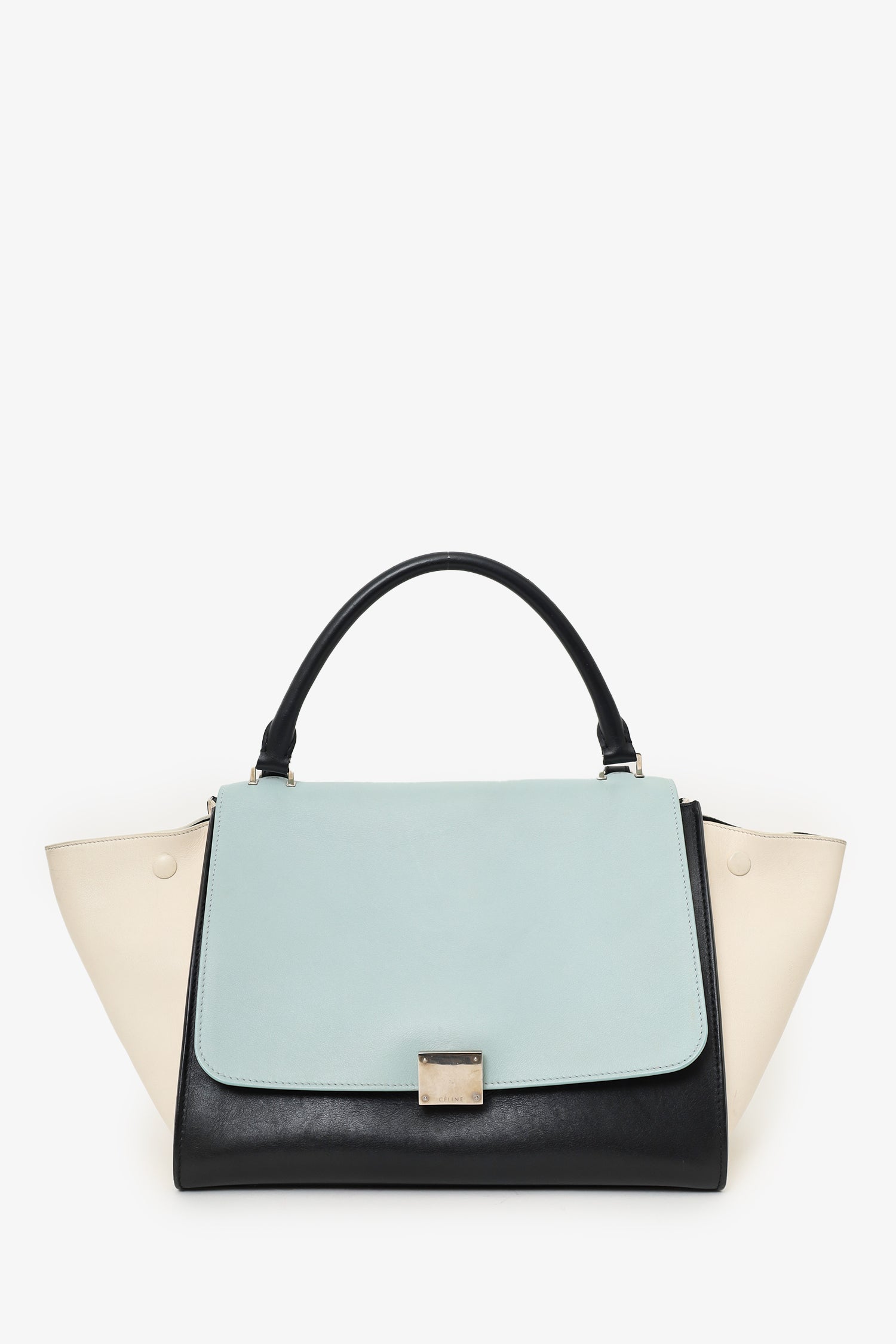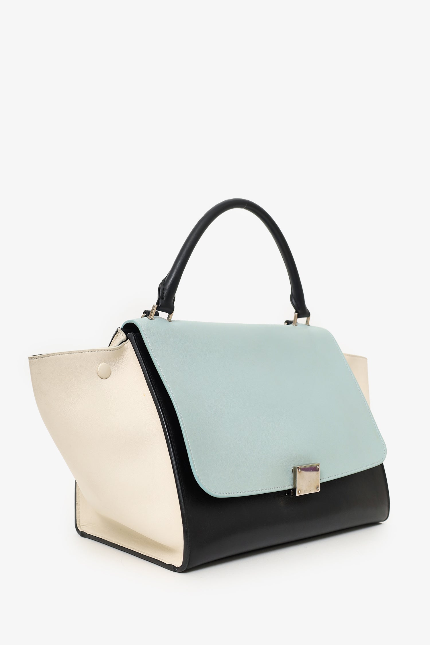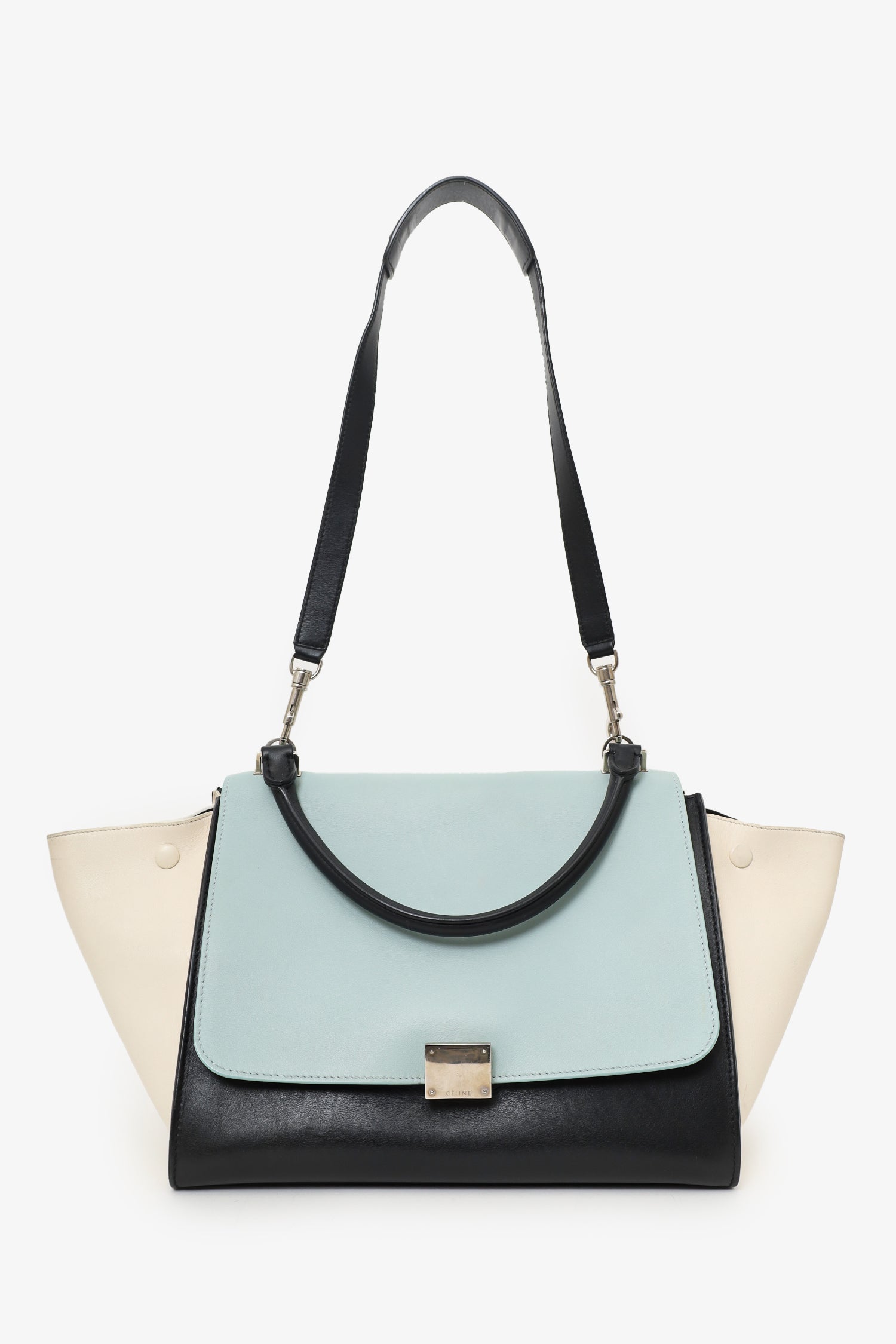 Front fold-over flap with turn-lock closure. Side snap button closures. Rear exterior wall pocket with zipper closure. Open interior compartment with 2 wall slip pockets. Suede interior. Detachable shoulder strap. Silver-tone hardware. Tonal stitching.