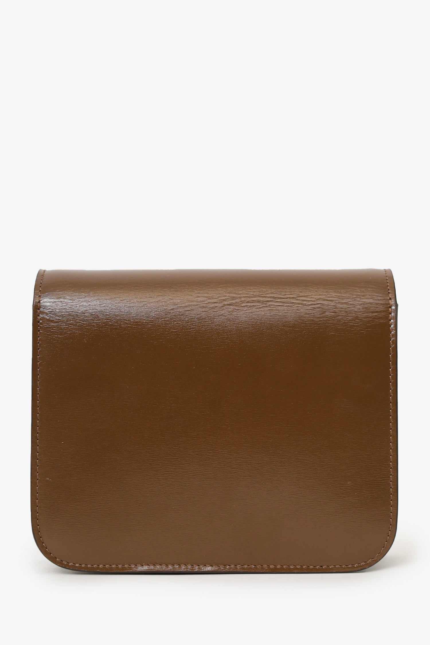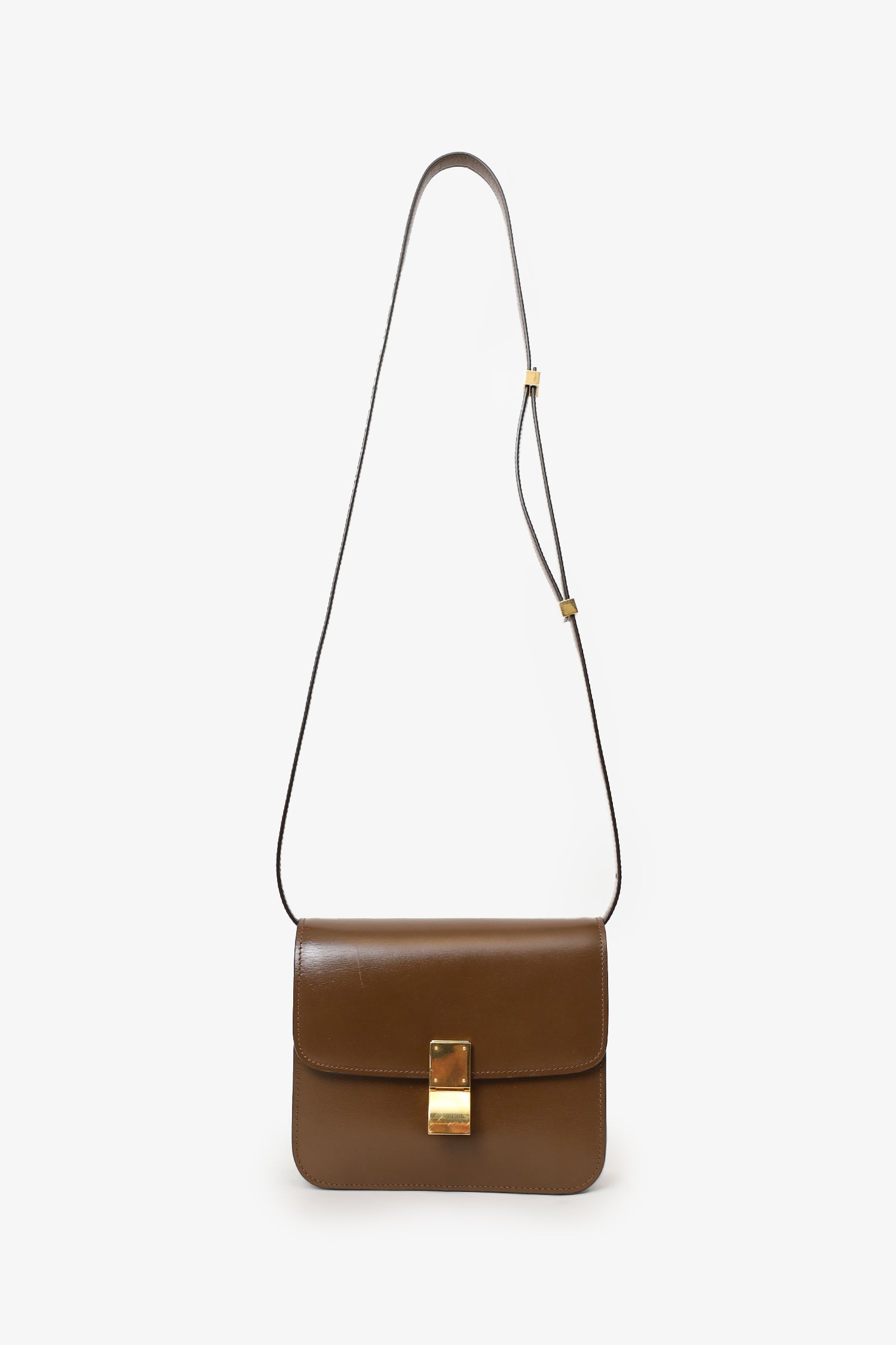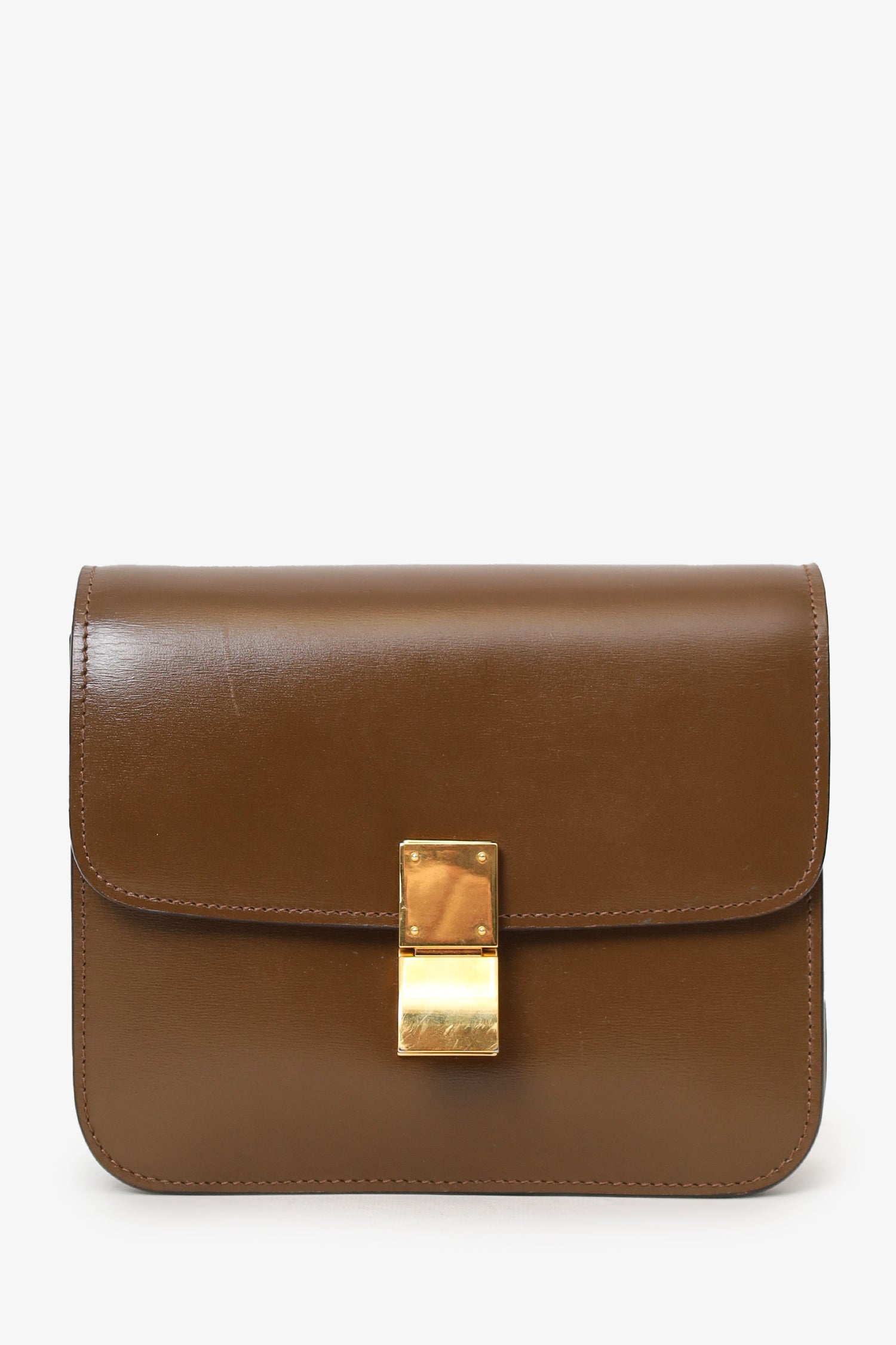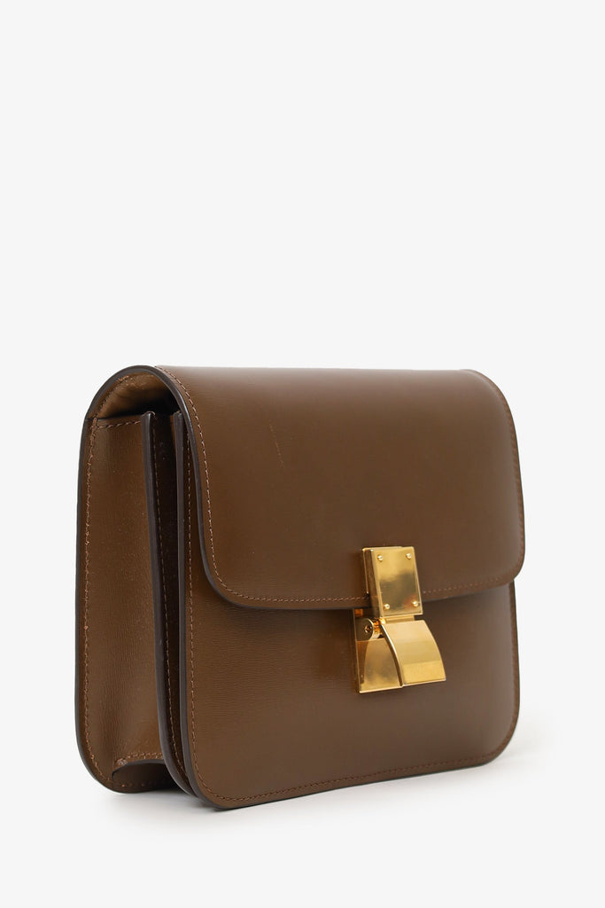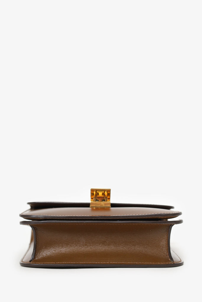 Celine Brown Leather Small Box Crossbody Bag. Front fold-over flap with push-lock closure. Removable strap with adjustable buckle closure. 2 interior compartments. Lined interior. Single rear interior wall slip pocket. Gold tone hardware. Tonal stitching
