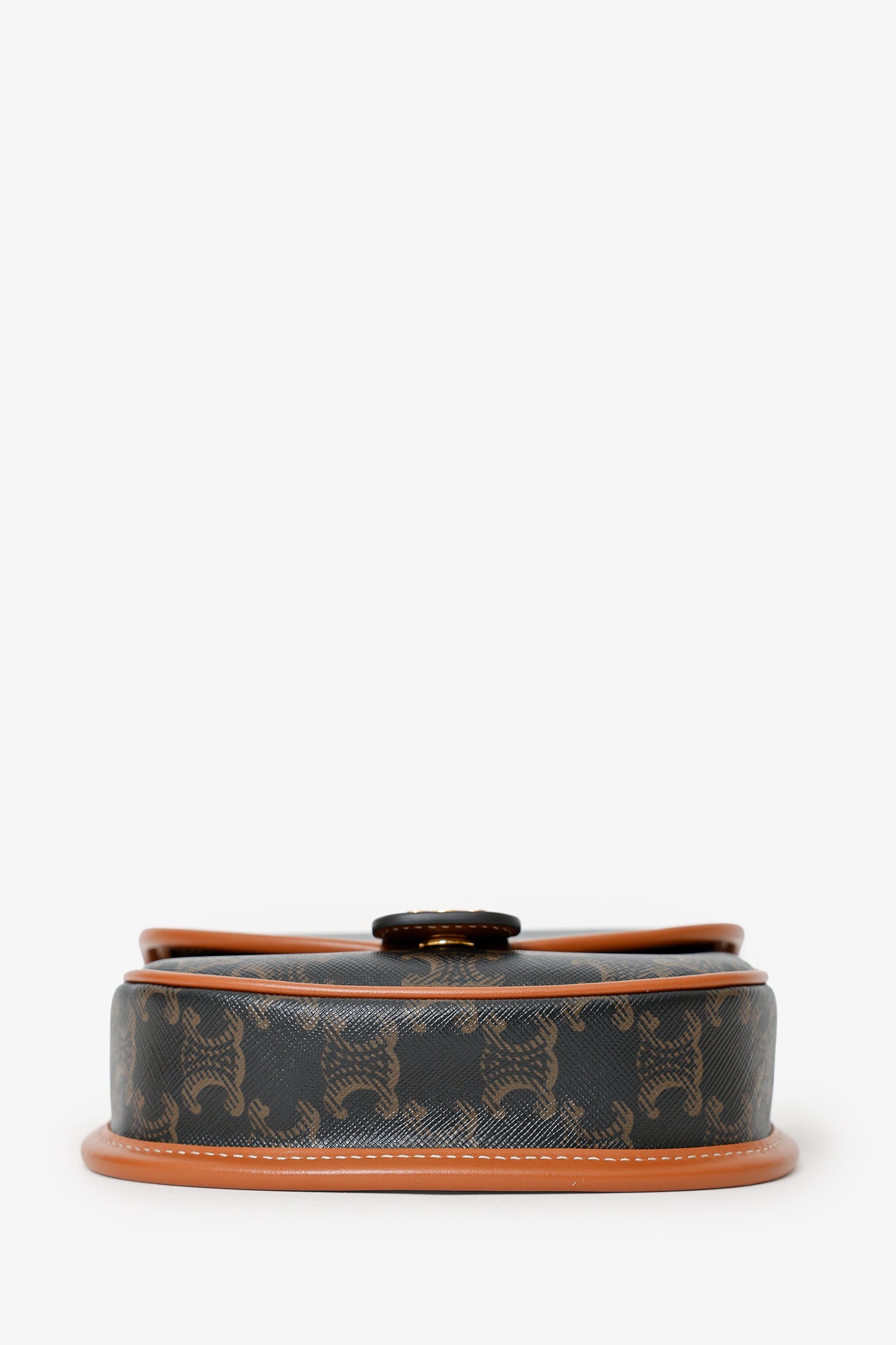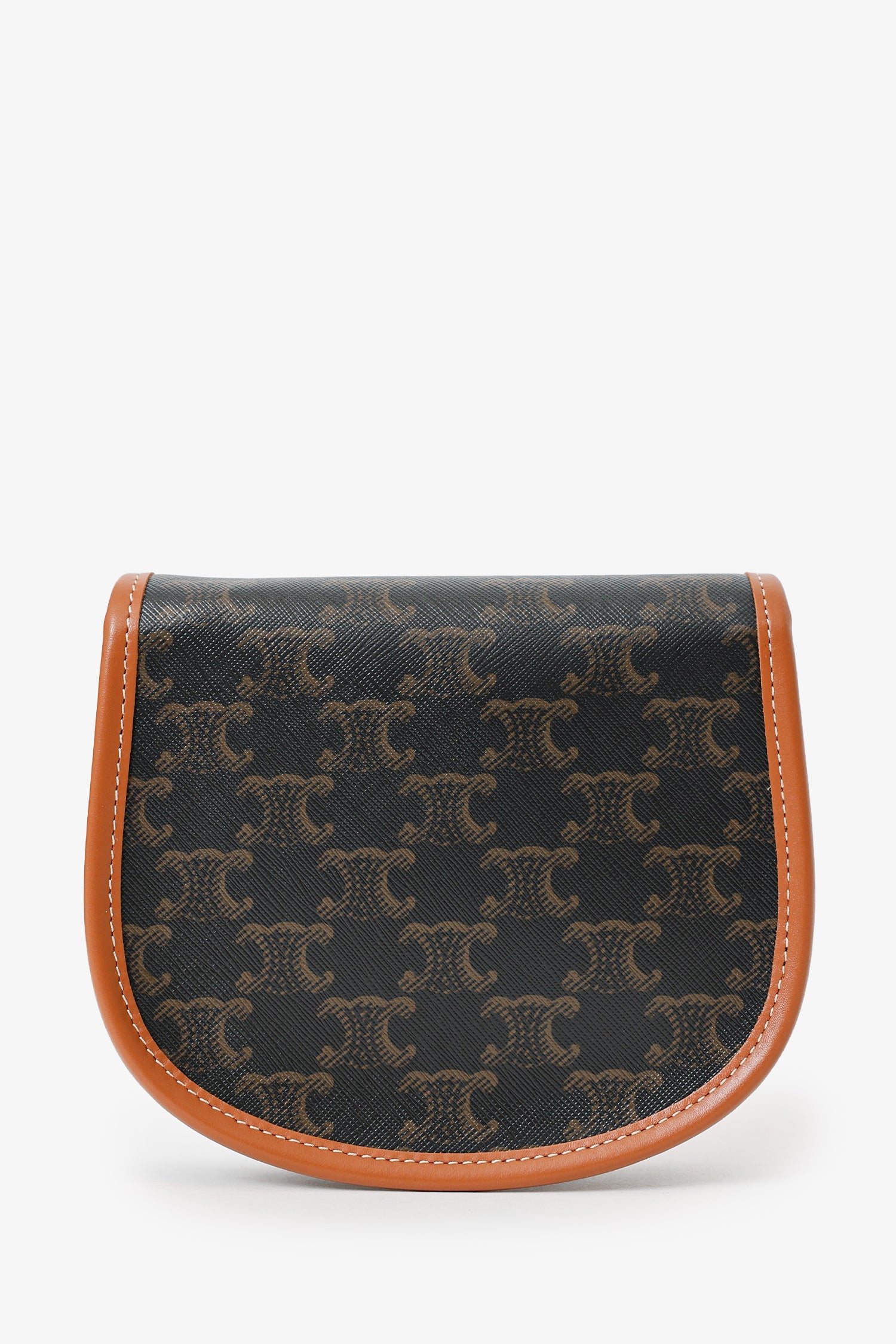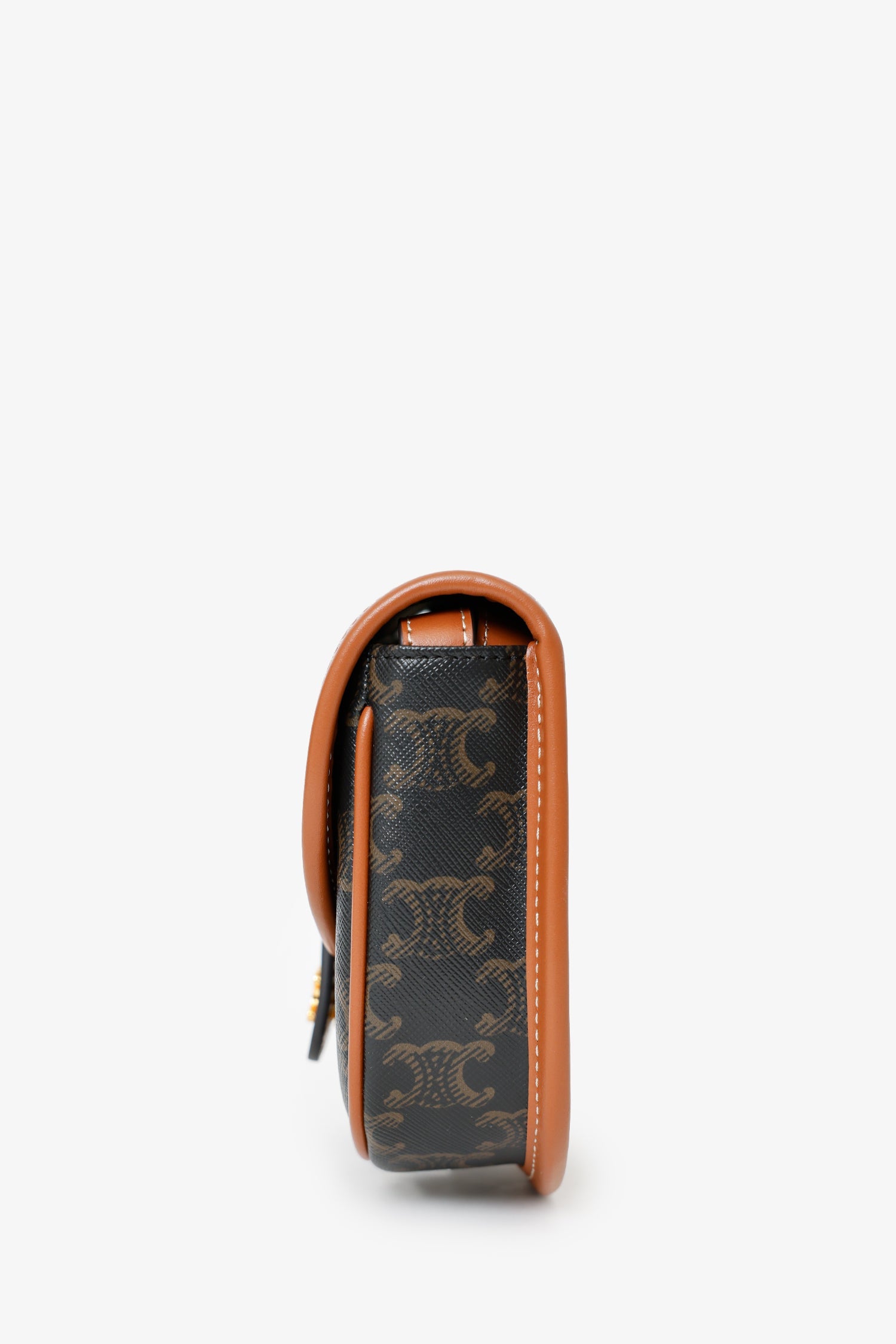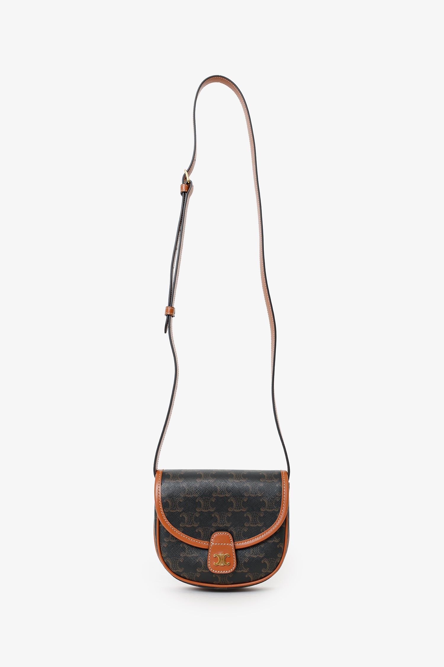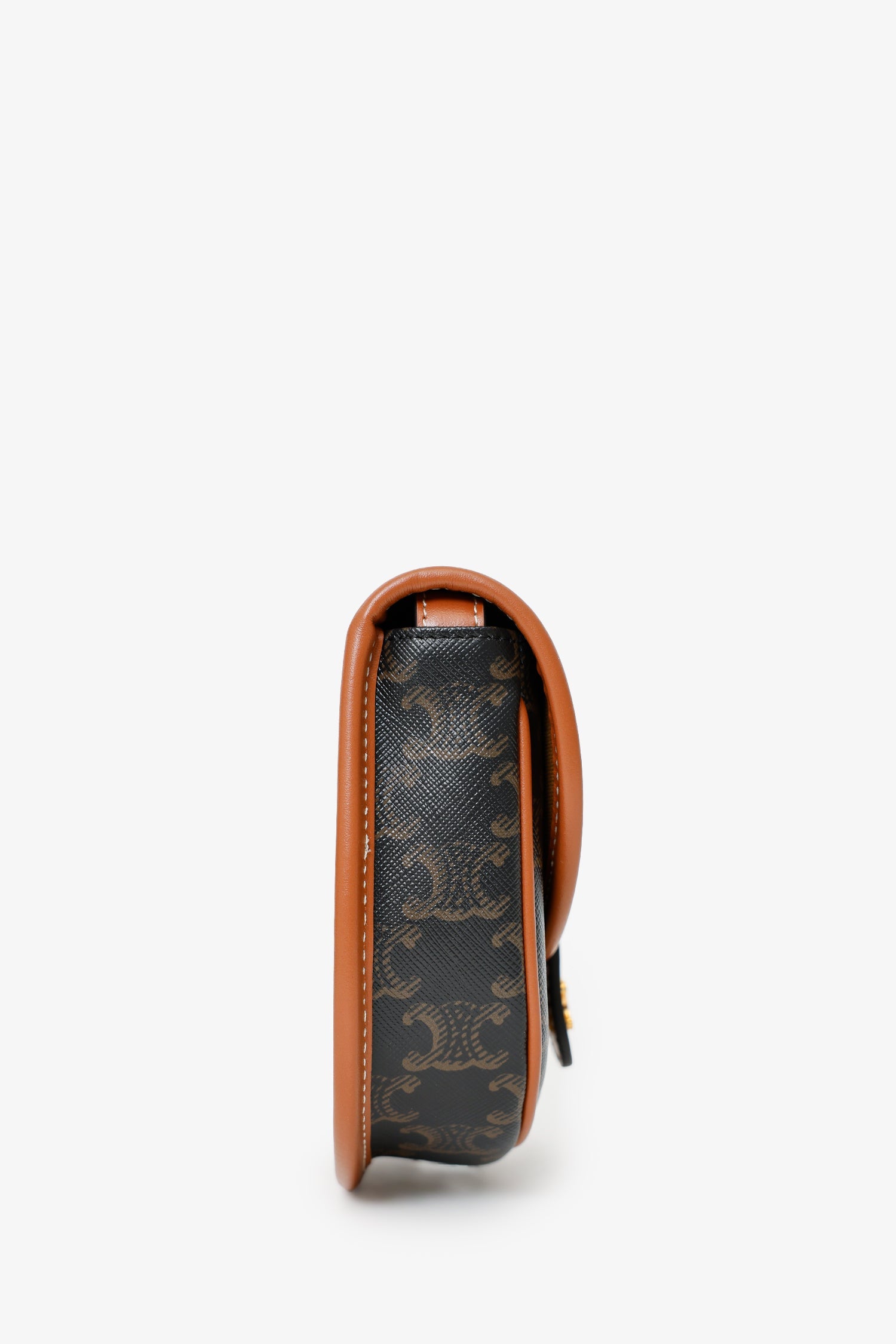 Celine Brown Triomphe Mini Besace. Front fold-over flap with snap-button-up closure. Leather crossbody strap with adjustable pull-through buckle closure. Lined interior with single rear slip pocket. Gold-tone hardware. Contrast stitching.