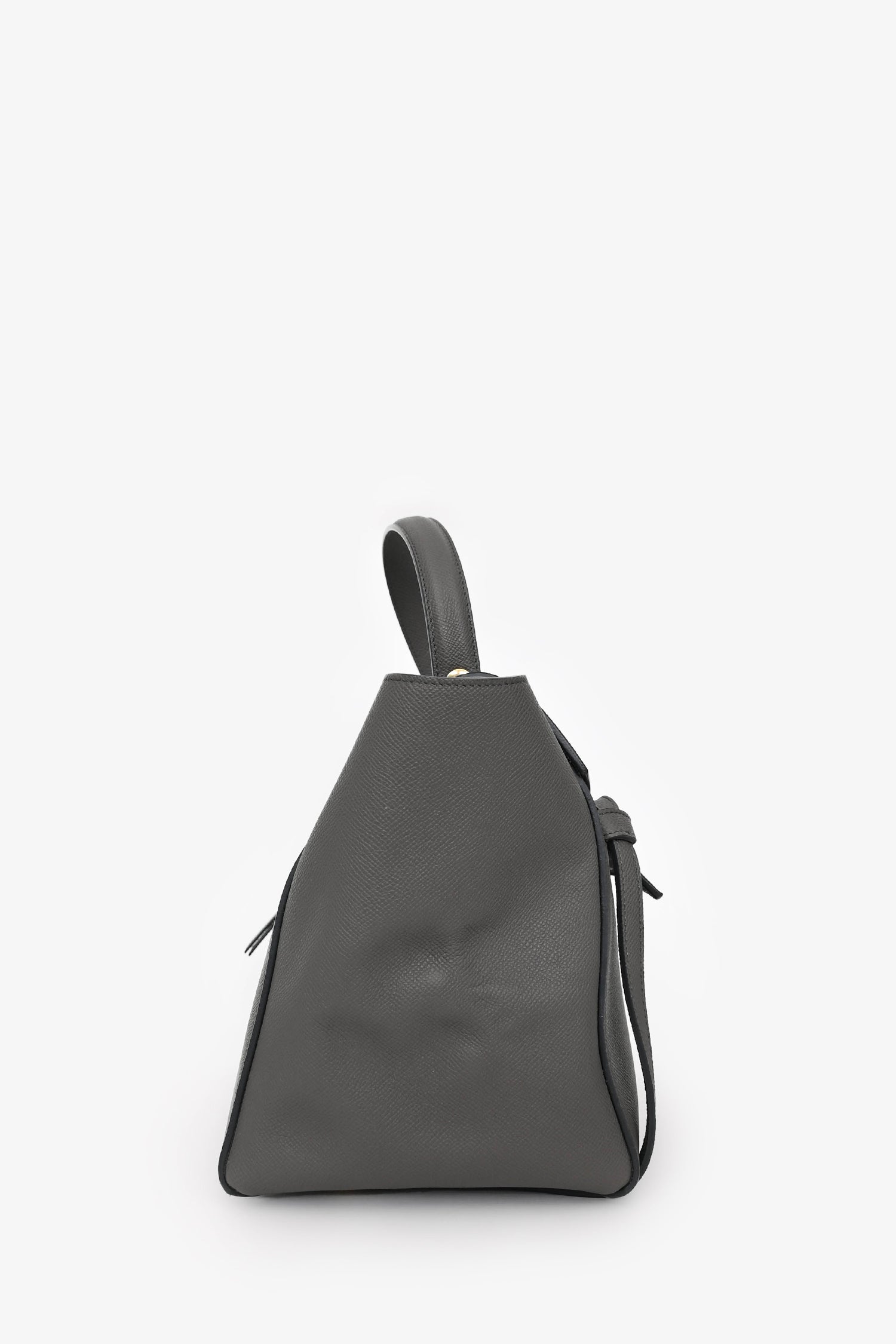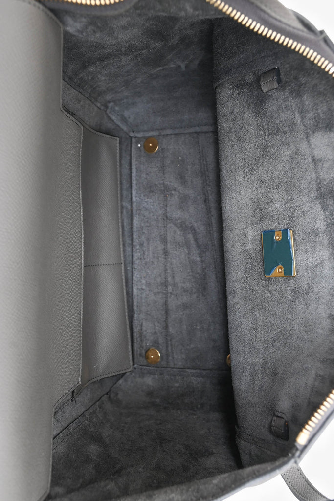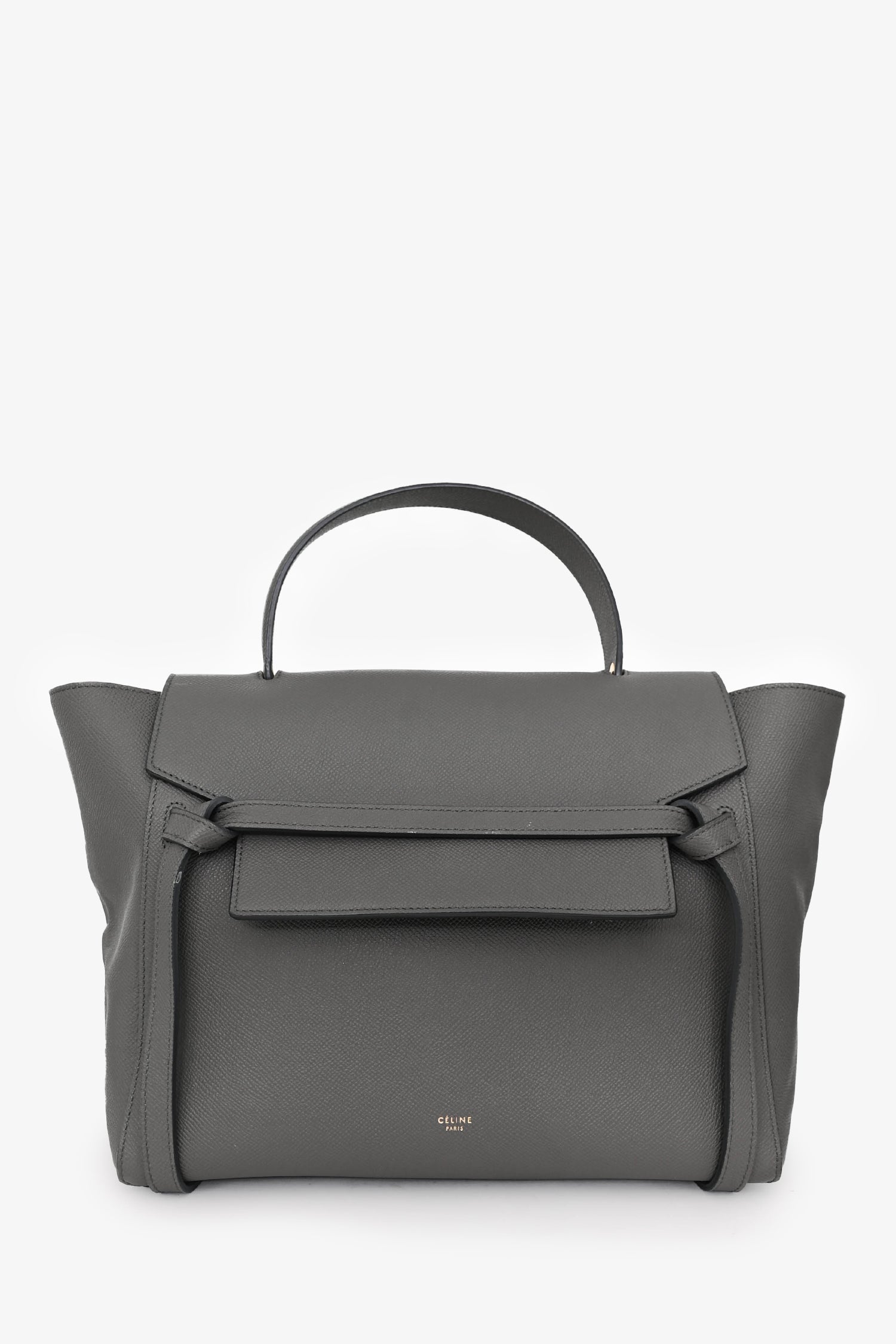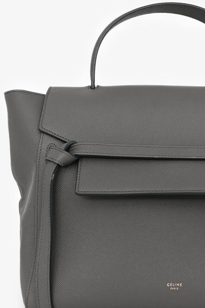 Celine Grey Leather Mini Belt Bag. Fold over flap with slip clasp and zipper closure. Suede interior with two slip pockets. Rear exterior pocket with zipper closure. Four bottom studs. Gold-tone hardware. Tonal stitching.