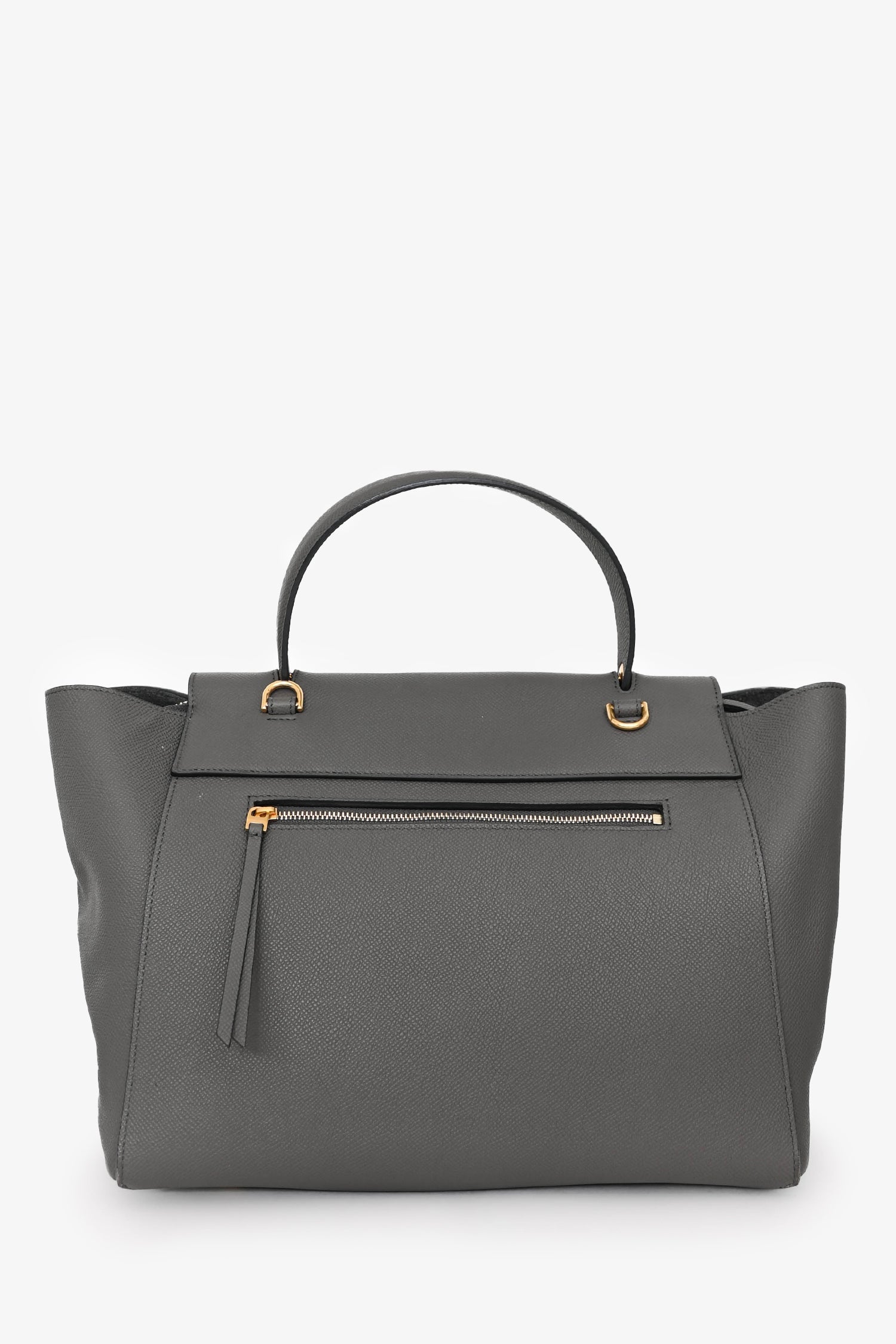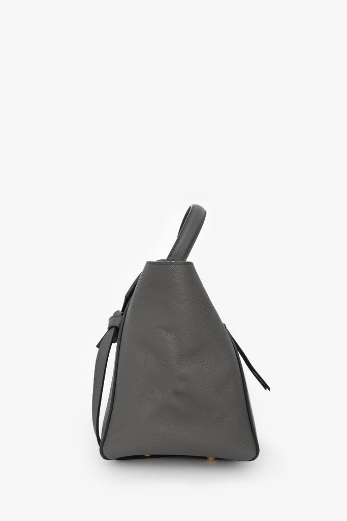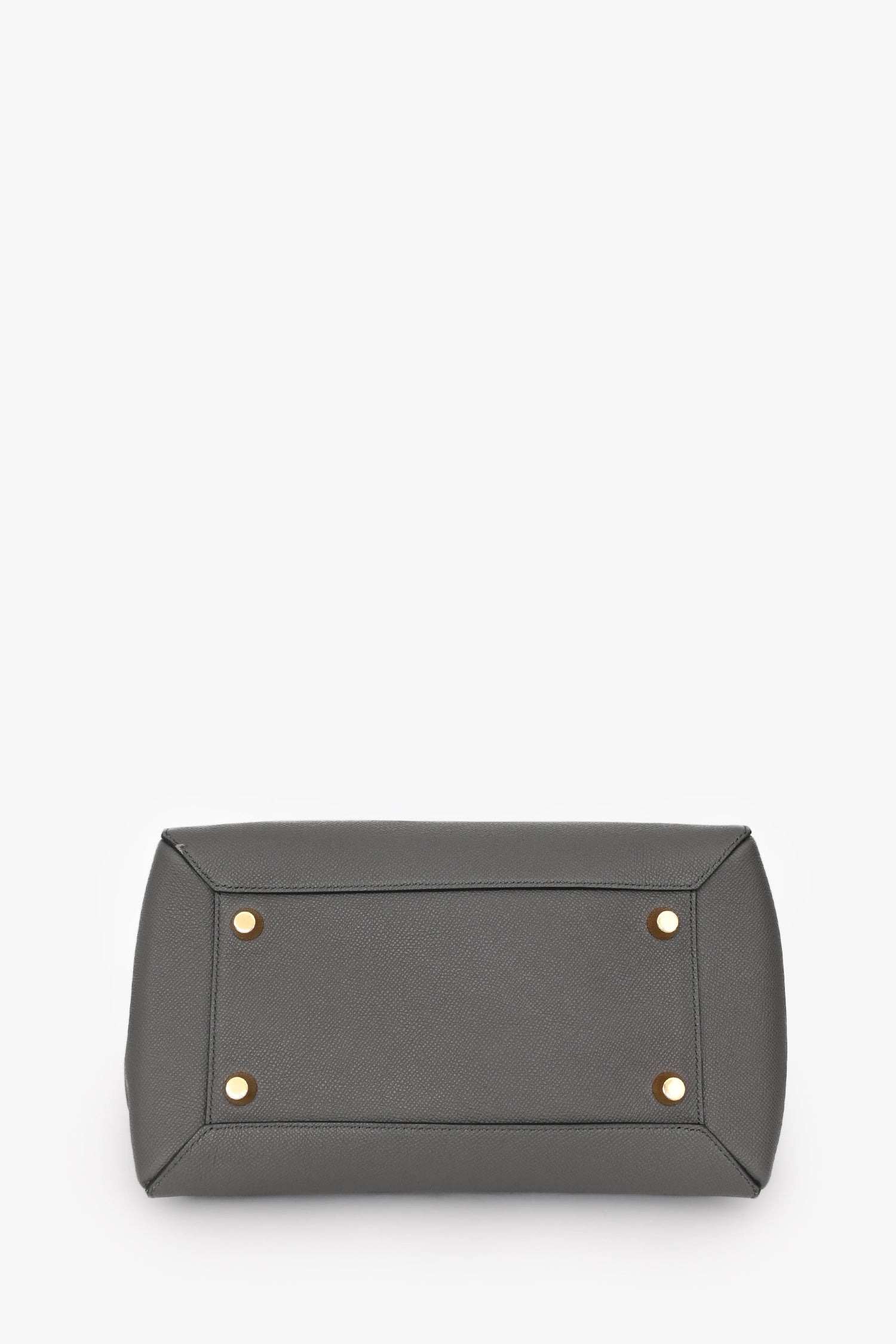 Celine Grey Leather Mini Belt Bag. Fold over flap with slip clasp and zipper closure. Suede interior with two slip pockets. Rear exterior pocket with zipper closure. Four bottom studs. Gold-tone hardware. Tonal stitching.