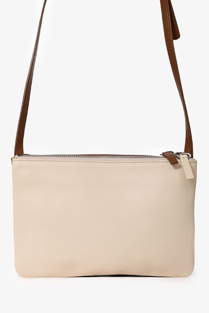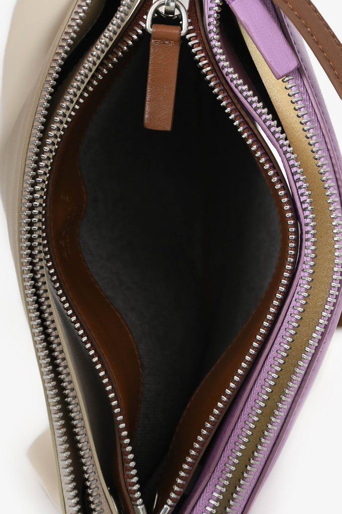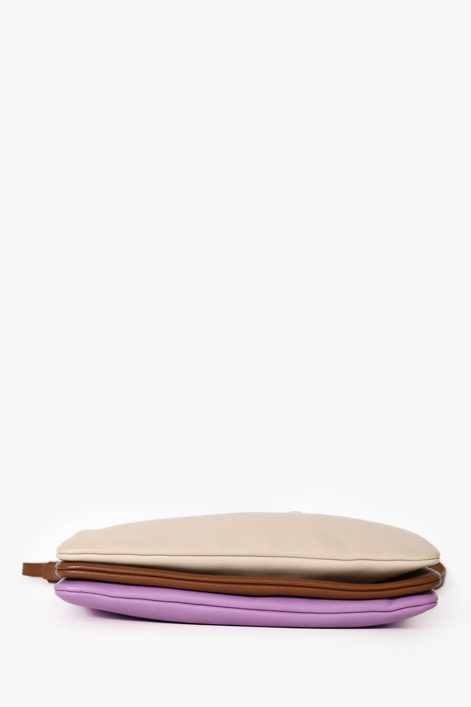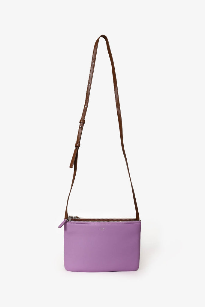 Celine Purple/Brown Leather Small Trio Bag. Top zip closures. Adjustable strap. Silver-tone hardware.