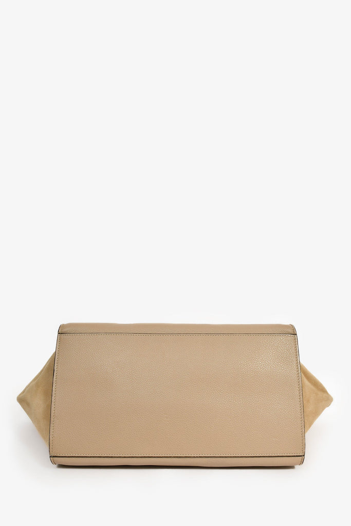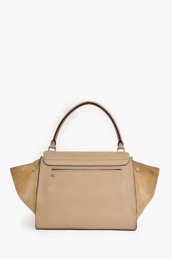 Celine Taupe Leather/Suede 'Trapeze' Top Handle Bag. Front fold-over flap with flip-lock closure. Interior top zip closure. Single rear exterior zip pocket. Single interior wall flap with 2 slip pockets. Silver-tone hardware. Tonal stitching.