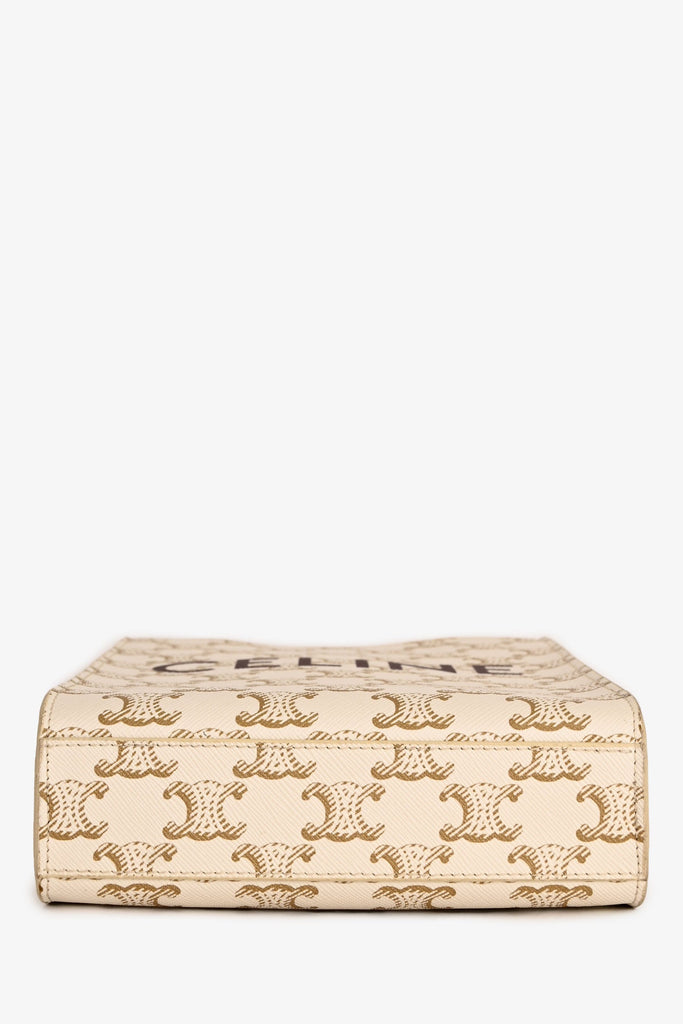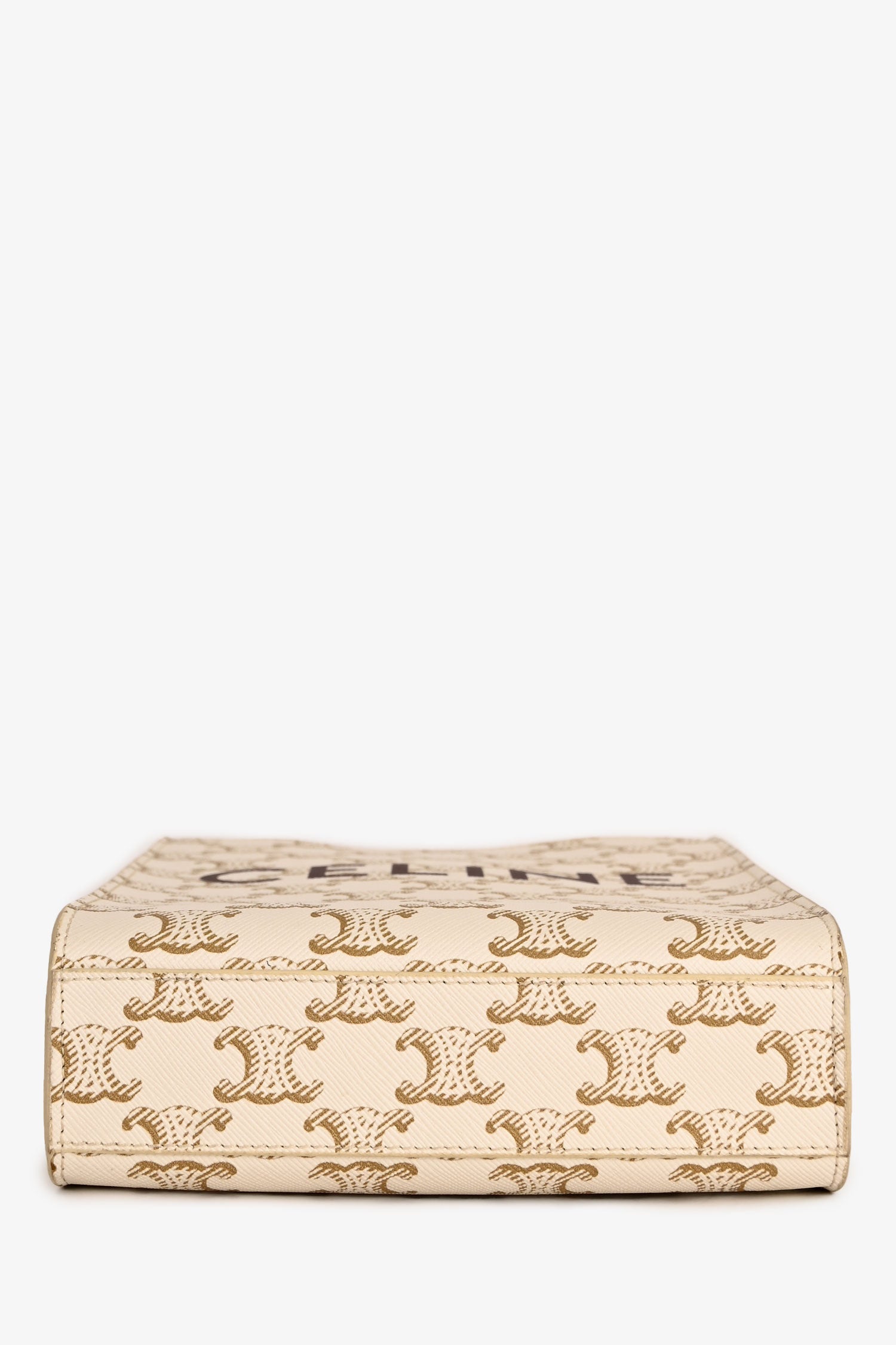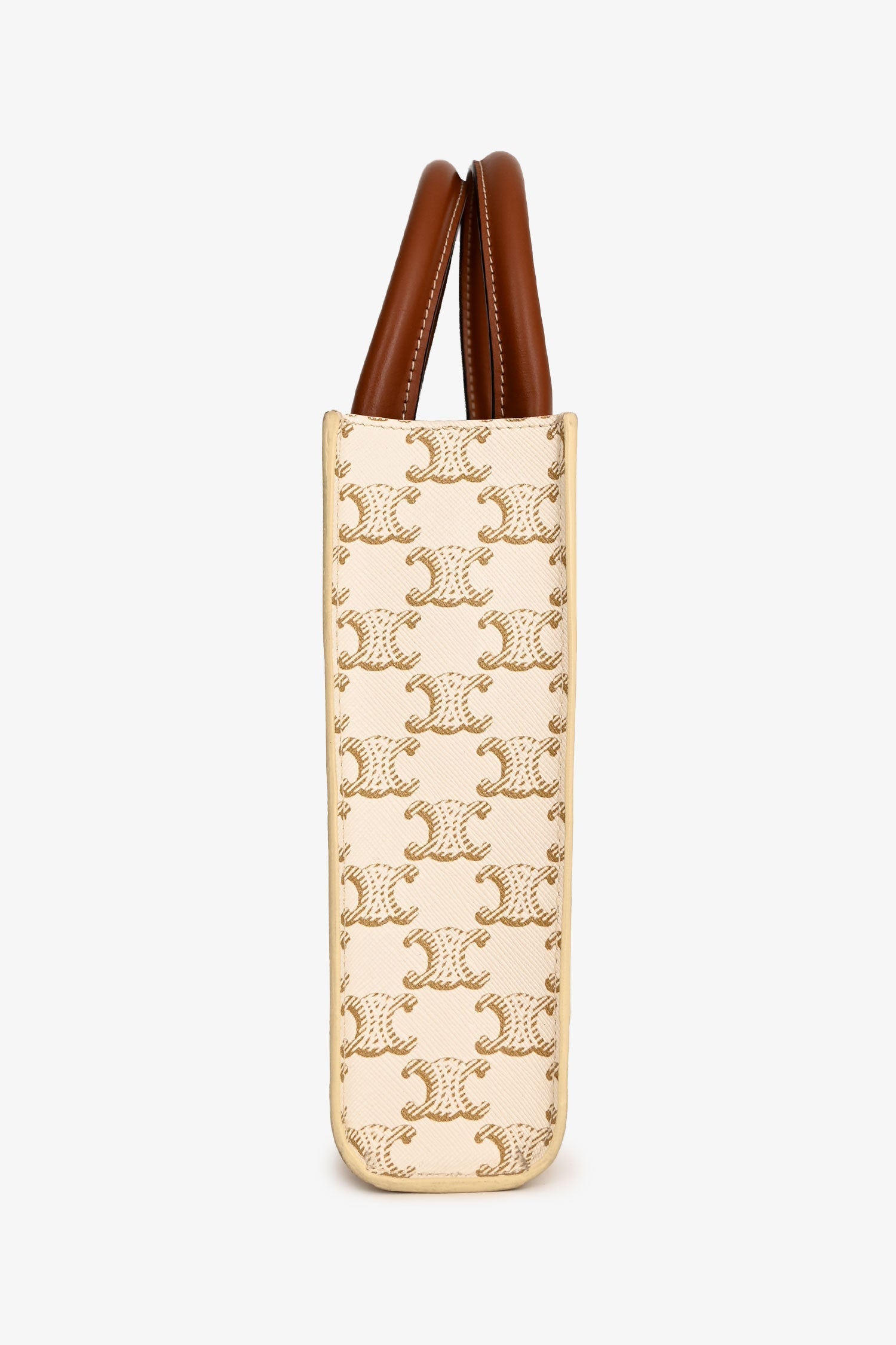 Celine White/Brown Leather/Canvas Mini Triomphe Cabas Vertical Tote. Dual top handles. Removable and adjustable shoulder strap. Open top. Unlined interior. Gold-tone hardware. Tonal stitching.