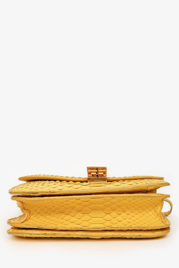 Celine Yellow Python Medium Crossbody Bag. Fold-over flap with a flip-lock closure. Gold-tone hardware. 2 interior compartments and 2 pockets. Zipped interior. Adjustable crossbody strap. Tonal stitching.