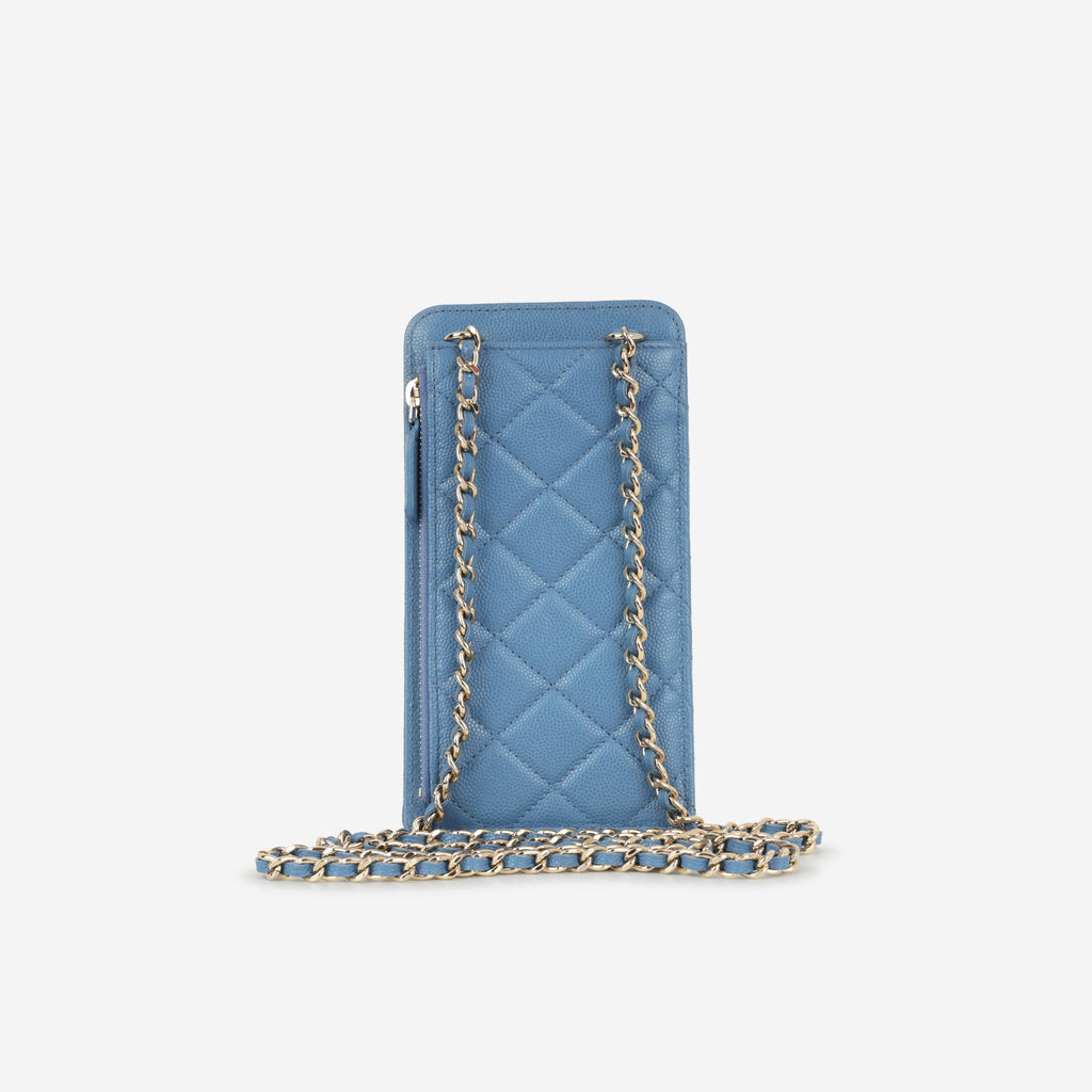 The champagne gold CC logo adds a refined touch of glamour, beautifully complementing the muted blue tone. Thoughtfully designed with practicality in mind, this phone holder features a slip pocket at the front, a zippered pocket at the back, and two card slots for your essentials, all within easy reach.