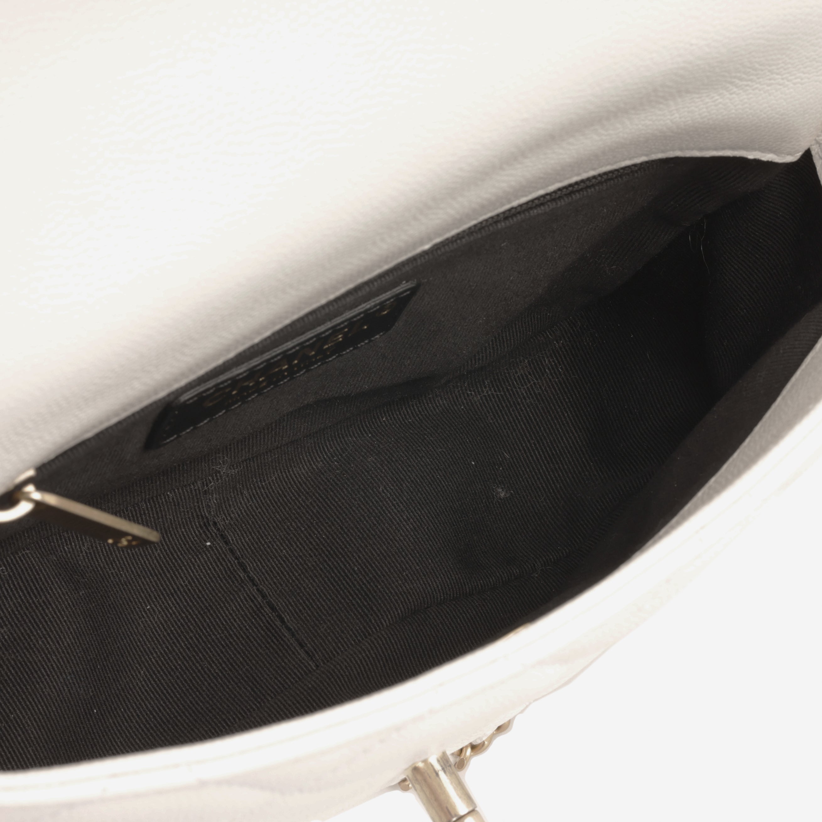 The Chanel Coin Mini Flap in White Caviar leather is a chic and compact statement of Parisian luxury. Crafted from durable caviar leather, renowned for its textured, pebbled finish, this mini flap combines practicality with timeless elegance. The gleaming gold hardware adds a sophisticated accent, perfectly complementing the crisp white shade.