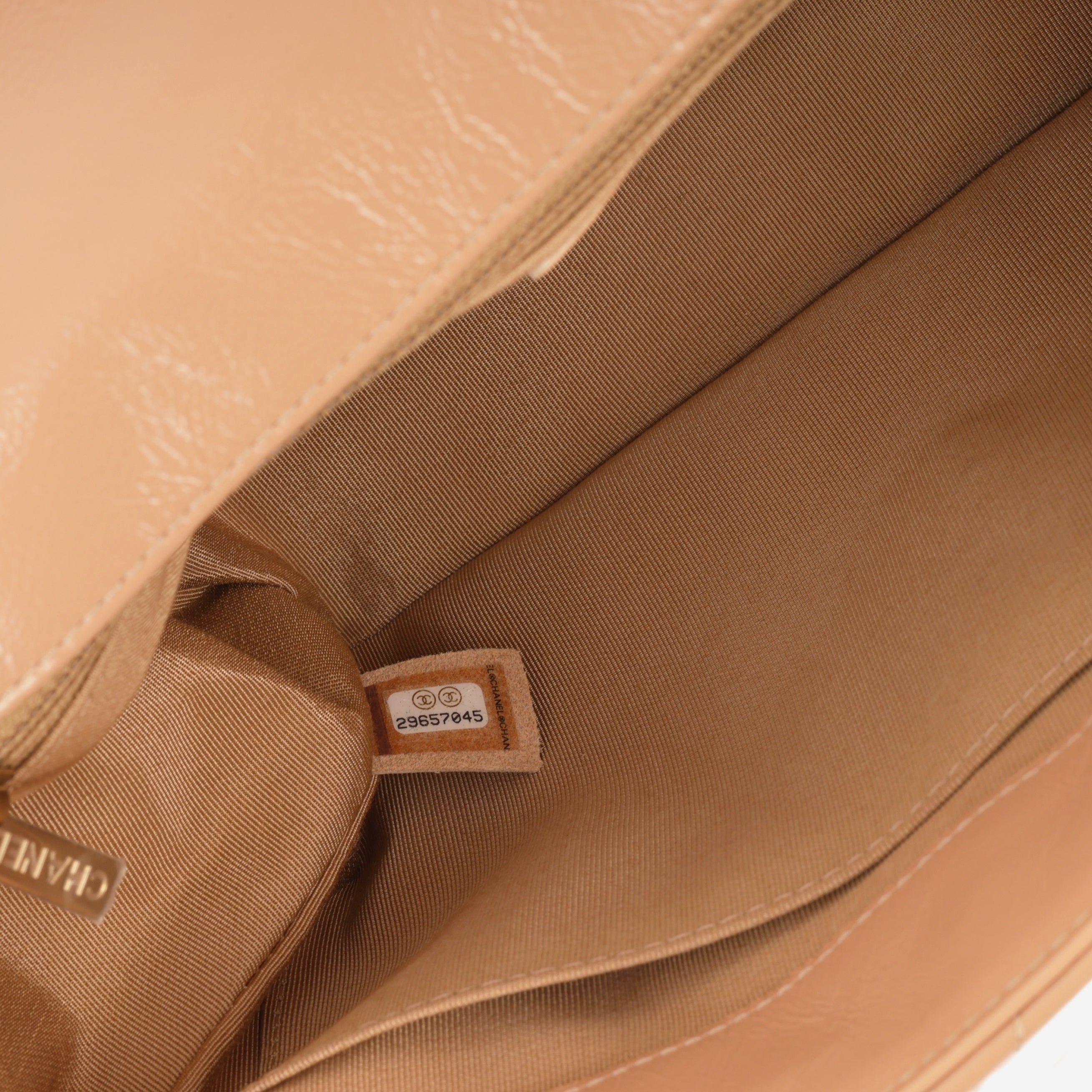 The Chanel Hold the Line Flap offers a modern take on classic Chanel styling. Crafted from shiny crumpled calfskin leather in a rich caramel hue, its soft sheen and diamond quilting add depth and sophistication. The supple yet durable leather is complemented by champagne gold-tone hardware, giving this bag a refined, understated glamour.